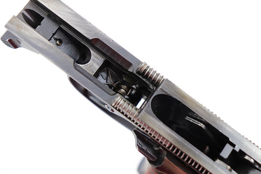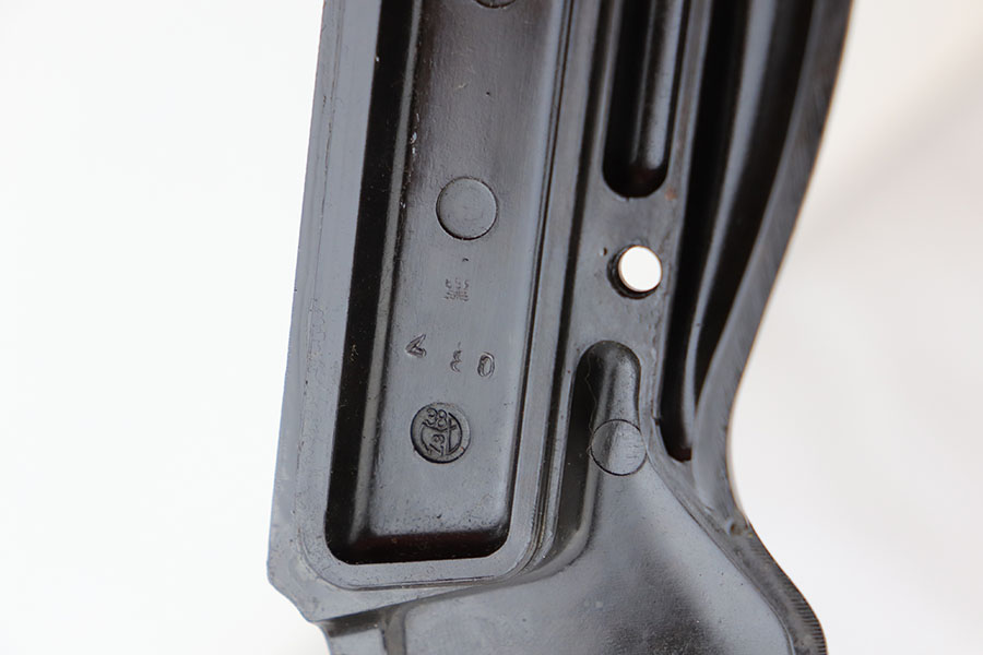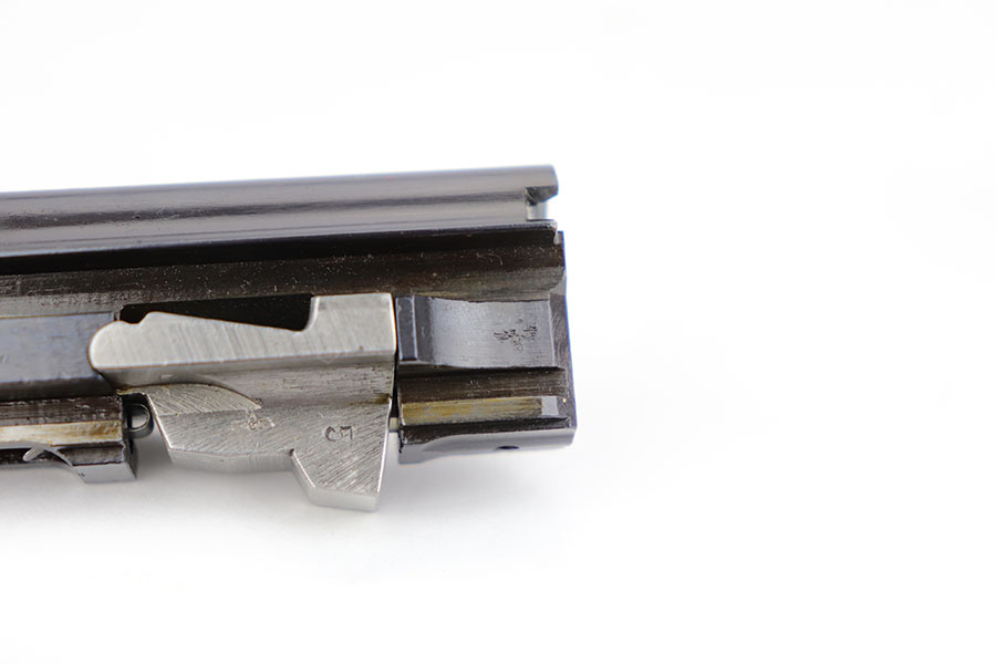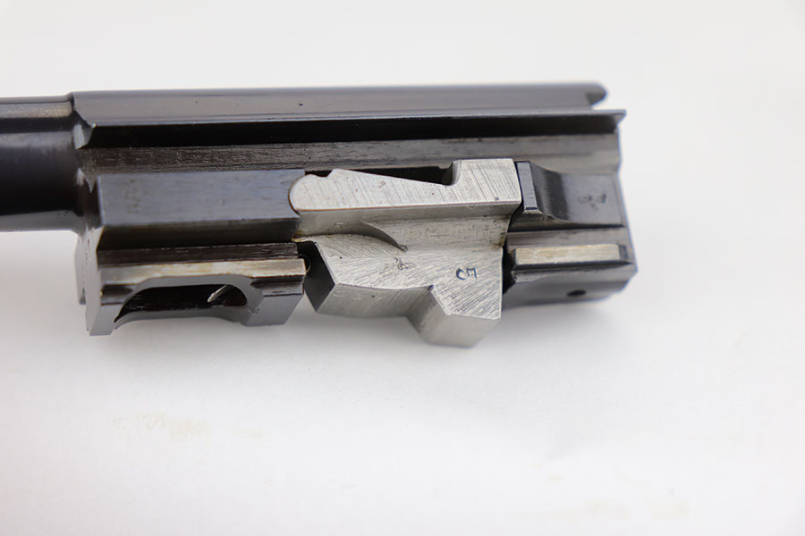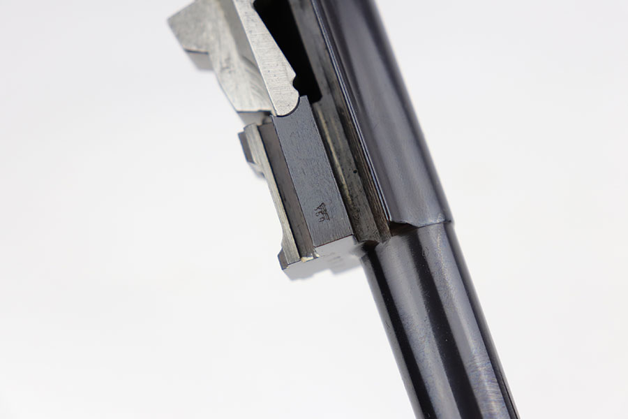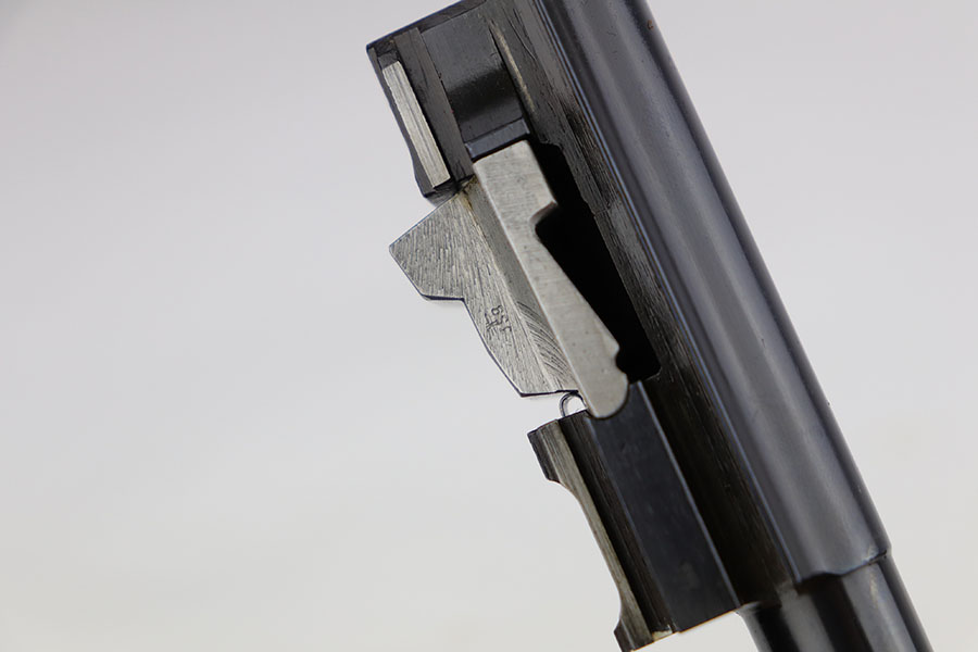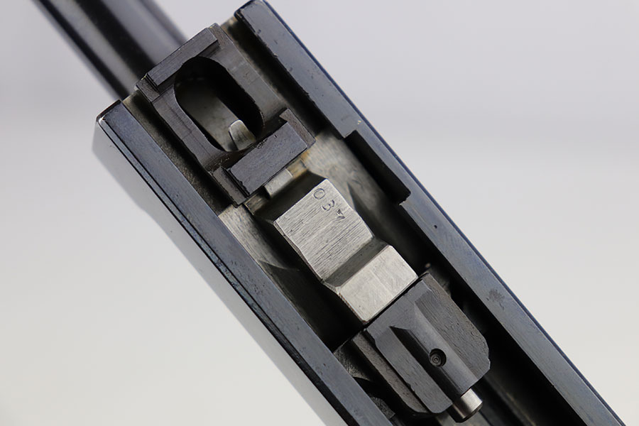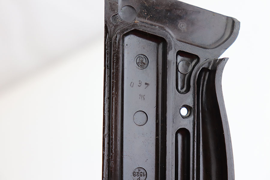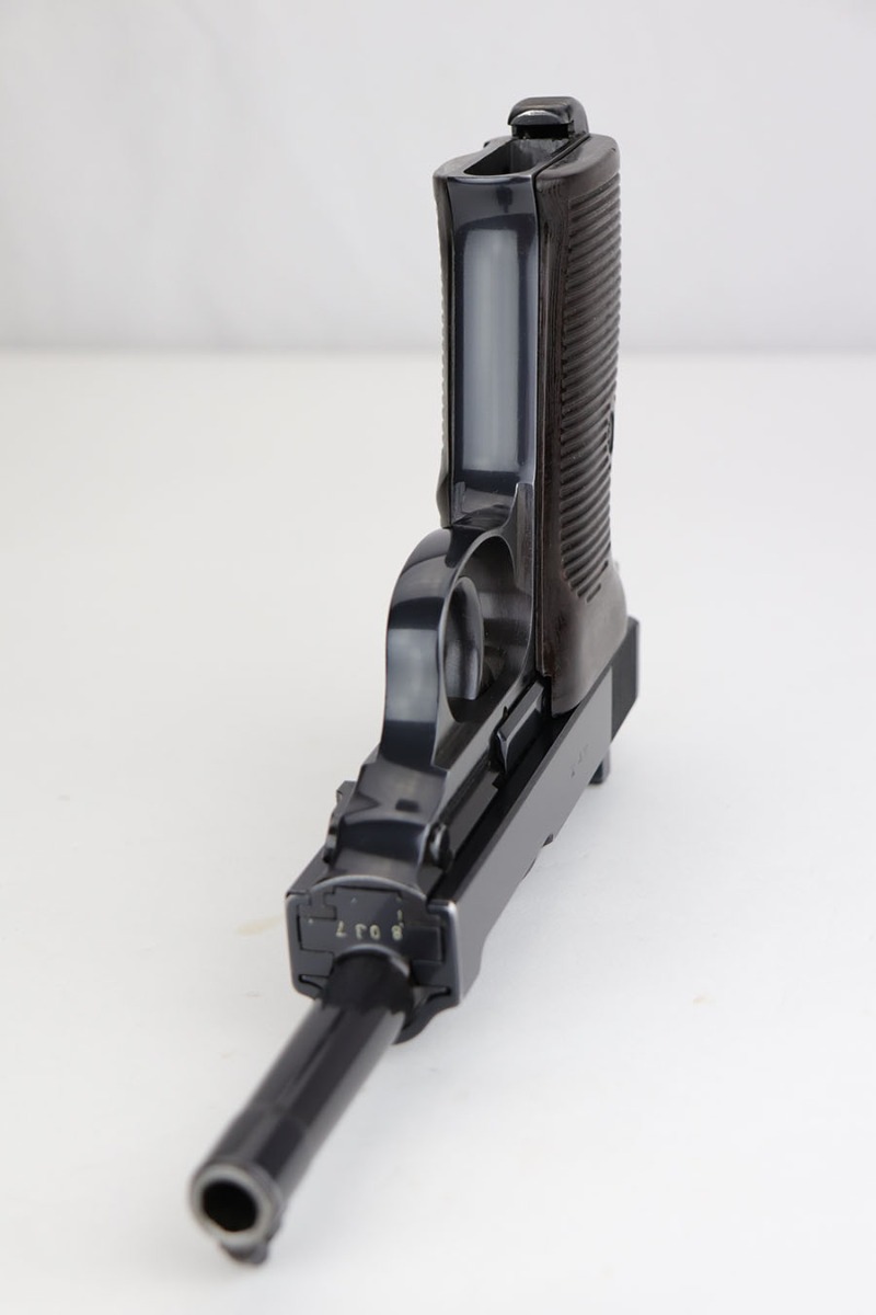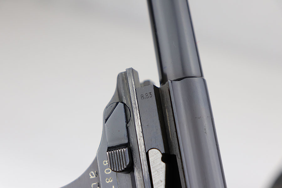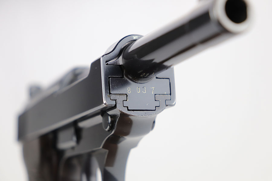 3/26/20 – This is one of the rarest of the Nazi P.38 variations, referred to as an ‘ac No Date’. Made in early 1940, there were only about 2500 were produced. This gun is all matching with the exception of the magazine. The magazine, however, is in the same date range as it is #8759. The grips are waffen proofed and numbered to the gun as well. Most importantly, is this gun “for real”? First of all, collectors never find these early guns in this condition as they were issued in 1940 and most went to the Russian front. This gun is correct in every way, and we cannot find any of the typical “tells” that you would expect on a refinished gun. The trigger spring and other springs are in the white. There are very faint “drip marks” on both sides of the slide. Also a small “thumb print” on the back of the barrel. We have included photos of these areas as they are good indicators of original finish on early Walthers. Most importantly, the third proof on the left of the slide is “raised” and over the finish. So, if this gun was restored it was done by a true artist. Honestly, we are about 50/50 on this finish, so please study the photos and decide for yourself.