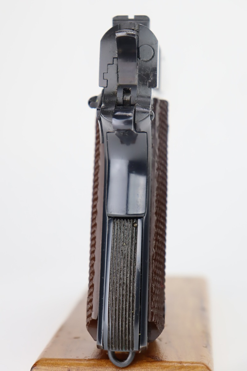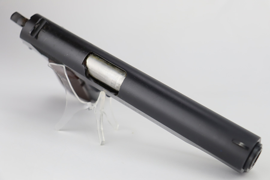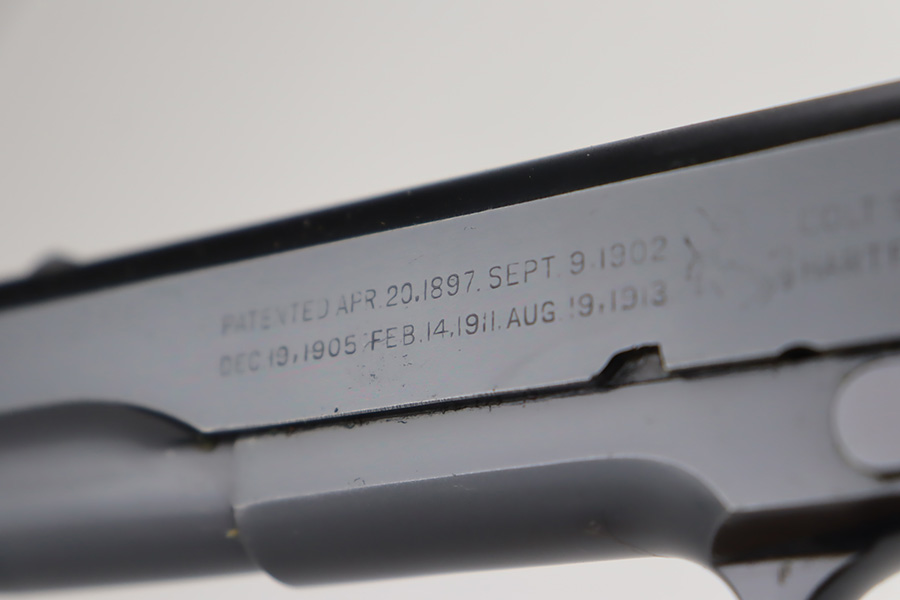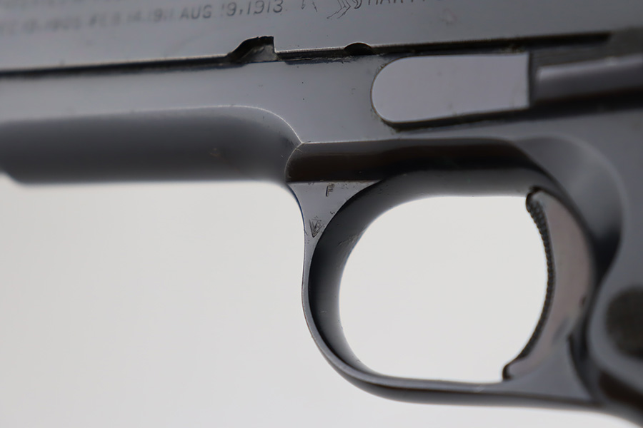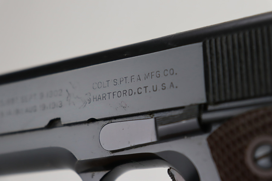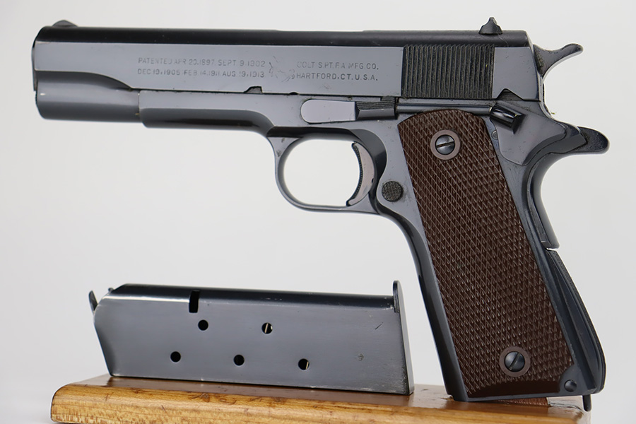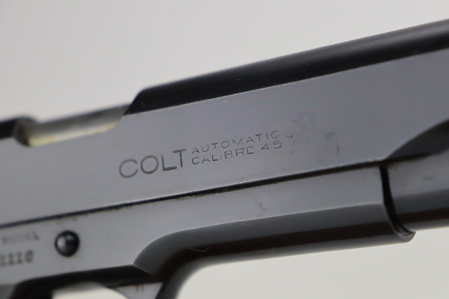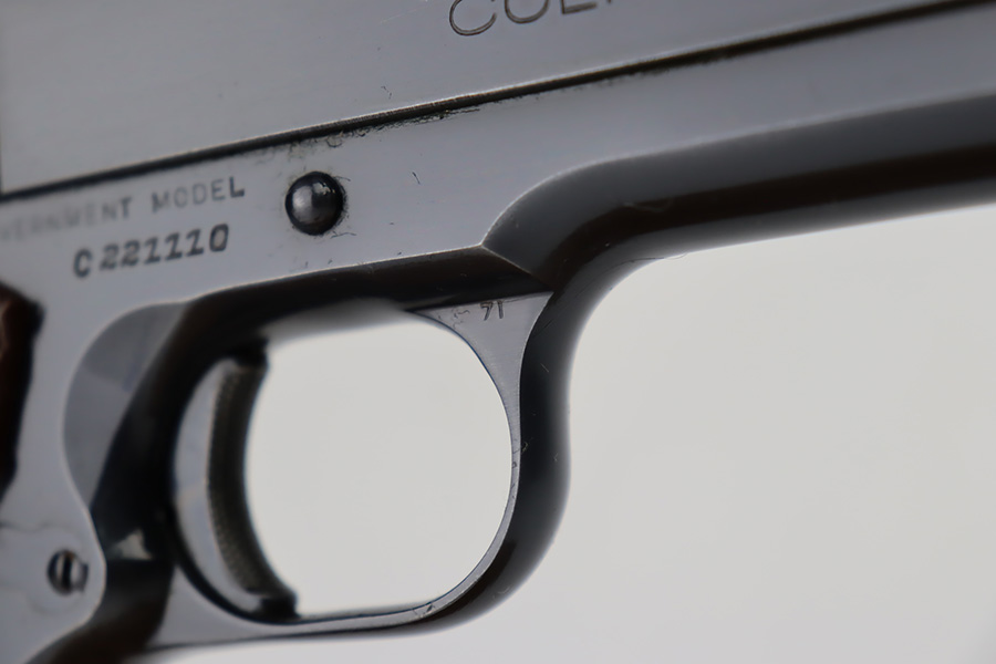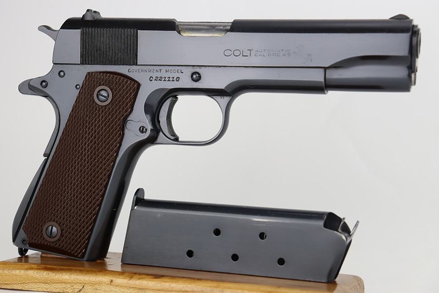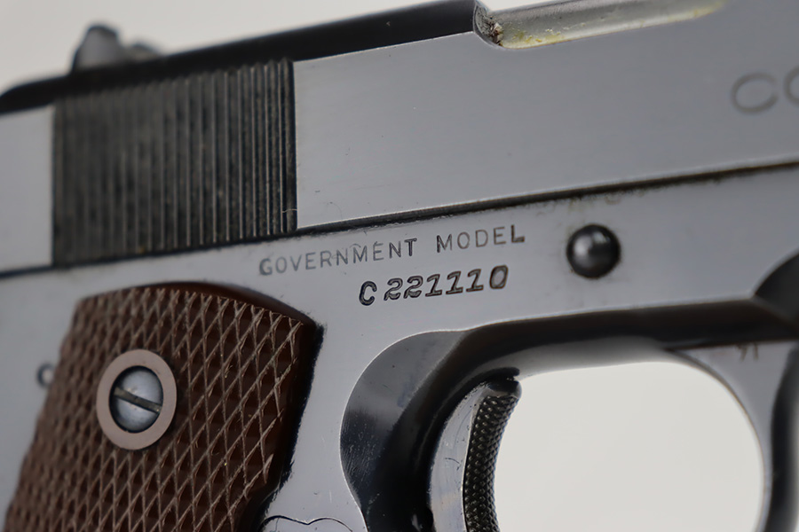 9/21/23 – This is a rare, early post-WWII pistol that was shipped in 1946.  Immediately following WWII, Colt had some military parts left from the WWII M1911A1 government contracts, and utilized those parts in their first post-war commercial pistols. This is one of these hard to find guns. According to Clawson, this variation was made between serial numbers C220001 to about C222000, from October of 1946 to January of 1947. Not all pistols in this early 2,000 pistol serial range appear to have all military small parts. These early 1946 pistols evolved slightly, most notably with the elimination of some hand polished areas, the addition of the Government Model marking and finally the transition from surplus military to commercial manufactured parts. From Clawson, “exterior surfaces were highly polished with special finishing wheels, then chemically blued with a non-glare matte finish on top of the slide”.  For detailed information, please see pp. 77-83 and p.208 of Colt .45 Government Models 1912-1970 2nd edition by Charles W. Clawson. This pistol is all original Colt factory finish and in stunning condition. Essentially no signs of wear. The bore is factory-new.