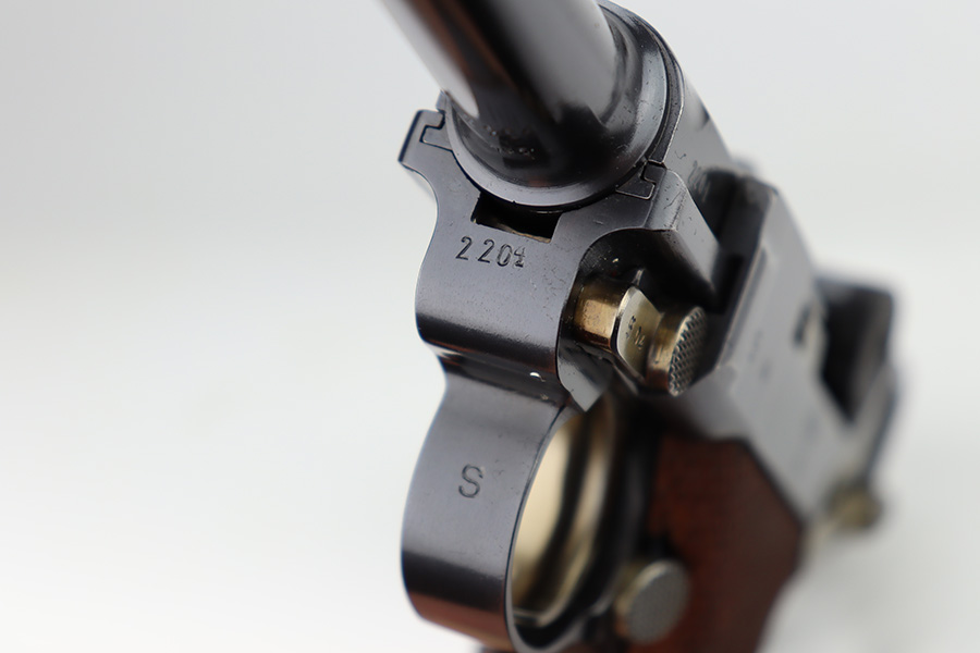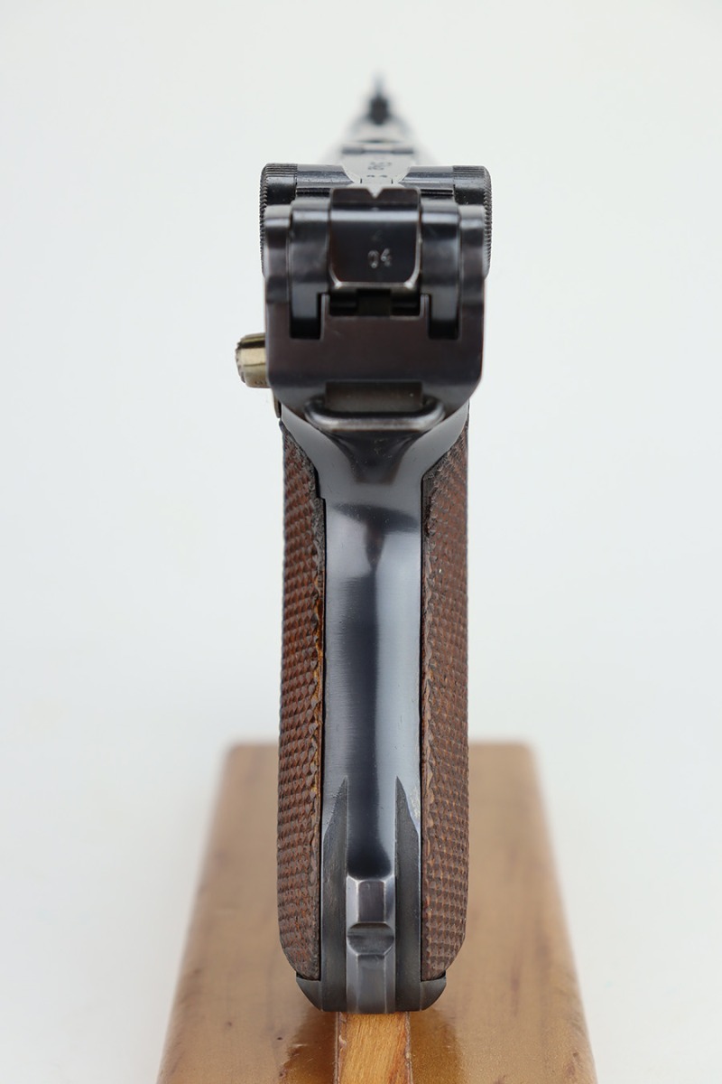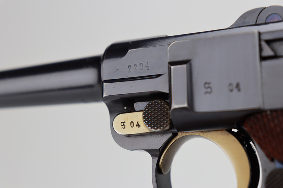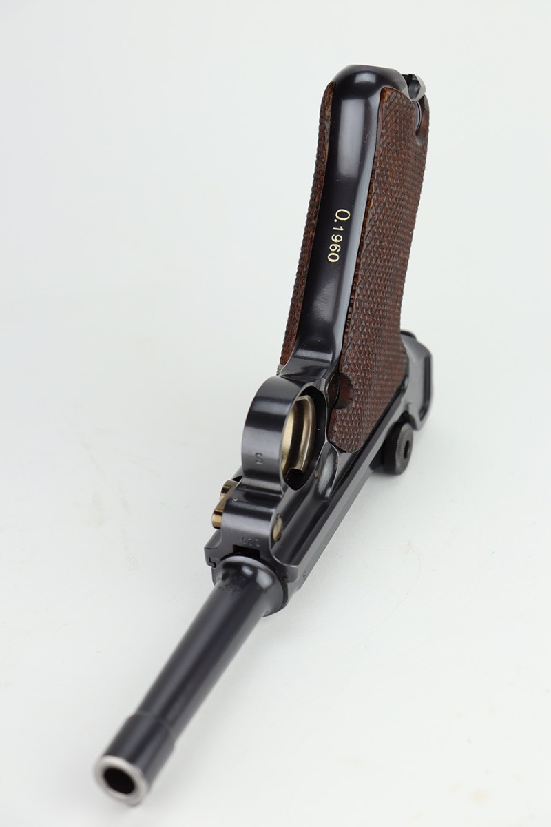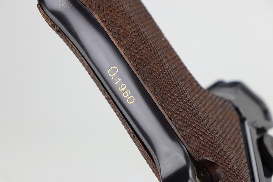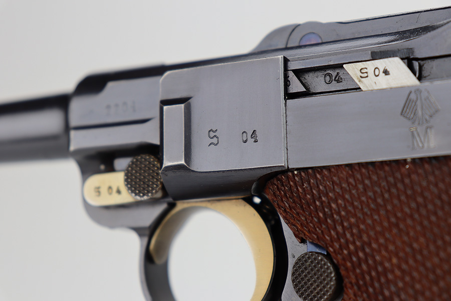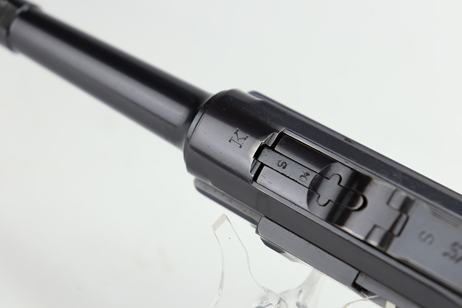 12/5/23 – This is a stunning example of an extremely rare “K Date” Navy Luger from 1934. It is all matching, has a Navy “Eagle M” marking on the left side of the frame, and has an “O.1960” property mark on the front strap. This entire gun has been beautifully and expertly restored by Gale Morgan. The finish is stunning with virtually no signs of wear or use. Fitted with minty un-numbered wood grips and comes with a blank-bottom magazine. The bore has good rifling with very light pin-pricking throughout.