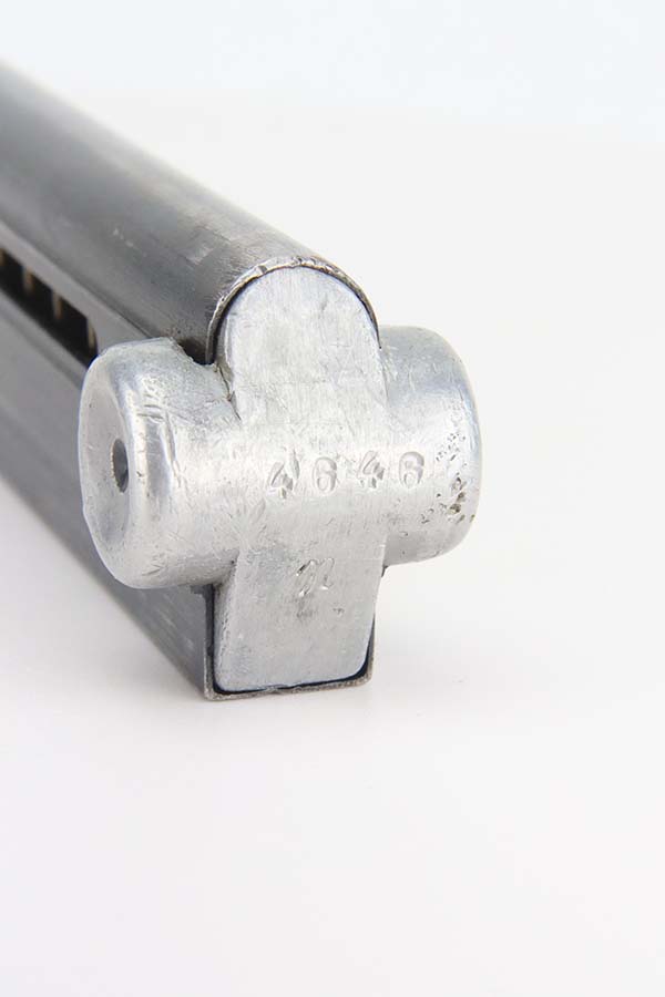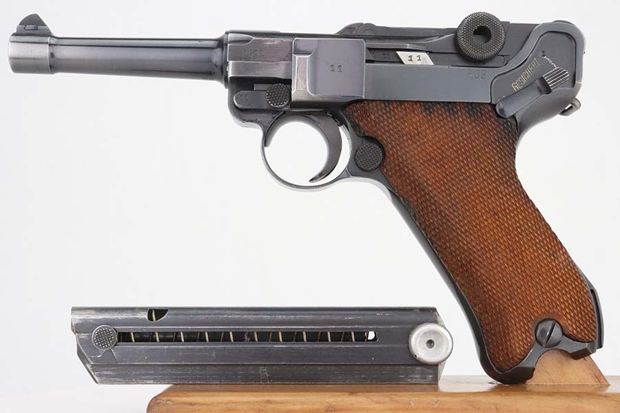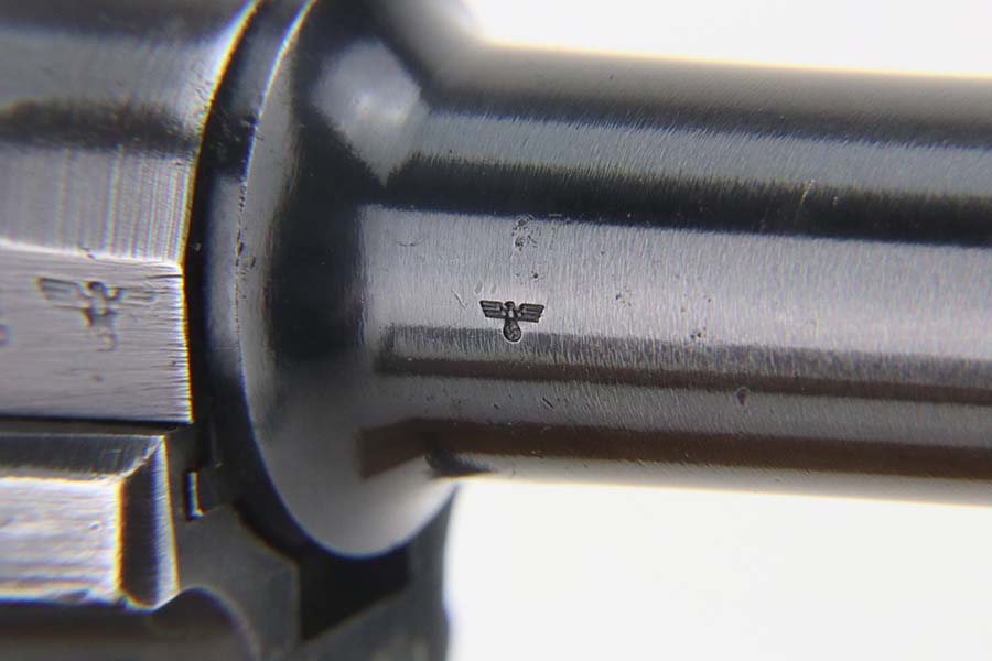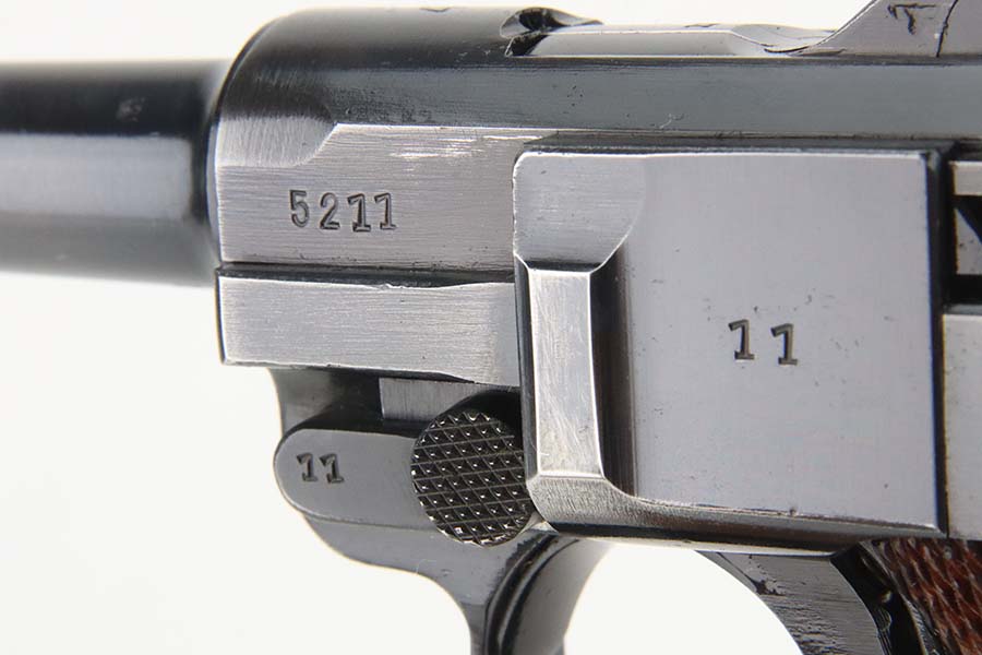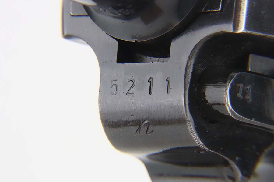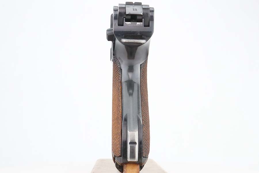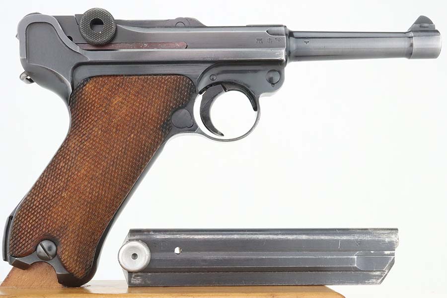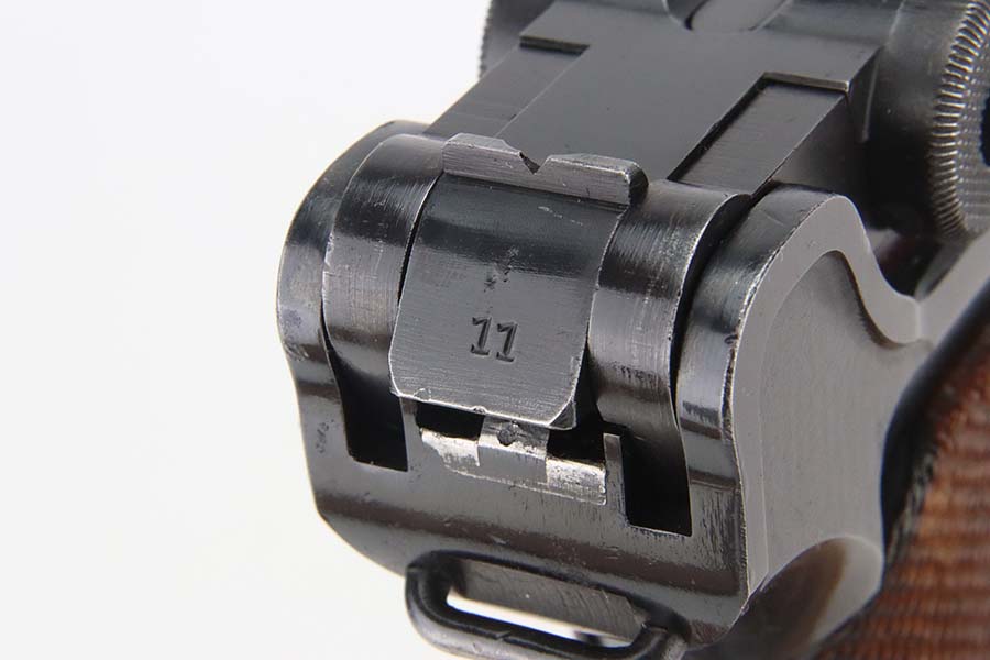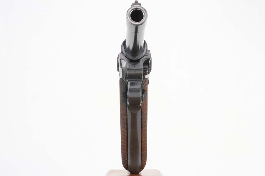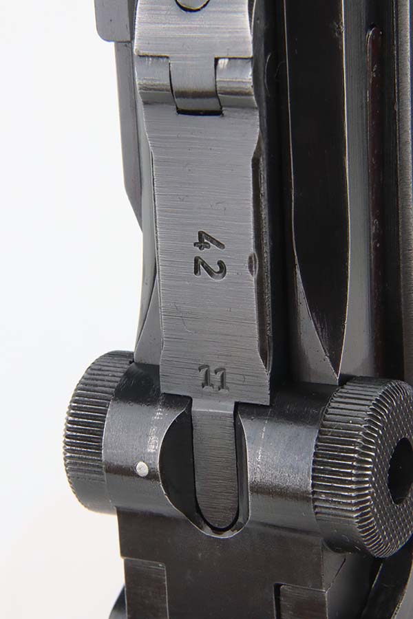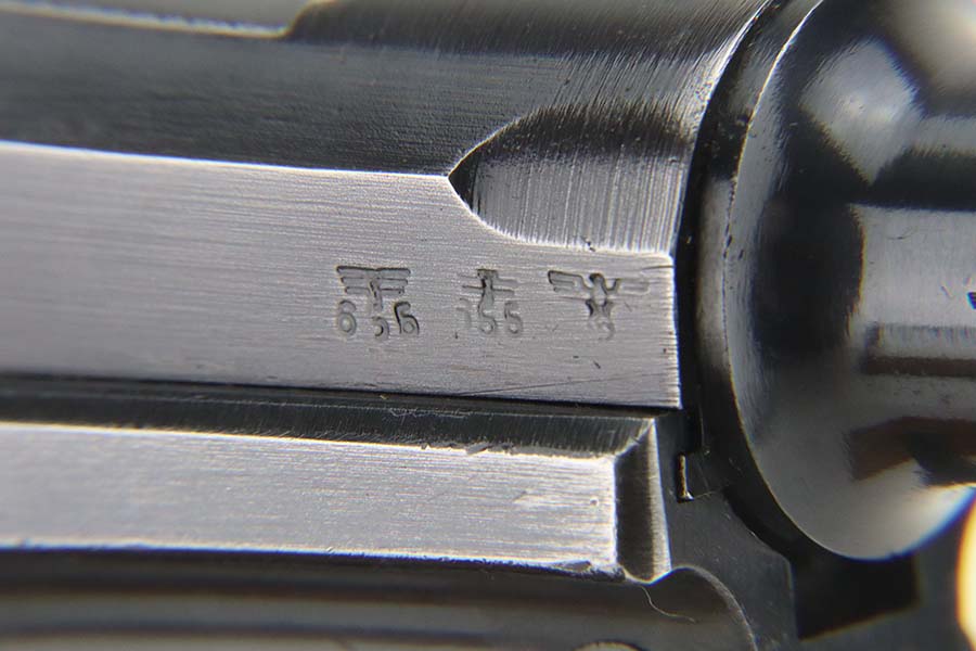 4/5/24 – This is a stunning example of a rare and desirable Luger variation – the 1941/42 Mauser Luger. Only about 7,000 made, making them even rarer than the K date Luger. This one is all matching, has the proper “Eagle 655” Nazi military proofs. It has retained nearly all of its original finish with just hints of high edge wear. Fitted with minty “Eagle 655” proofed wood grips. Comes with a mismatched magazine. The bore has pretty good rifling, but there is minor pitting throughout.