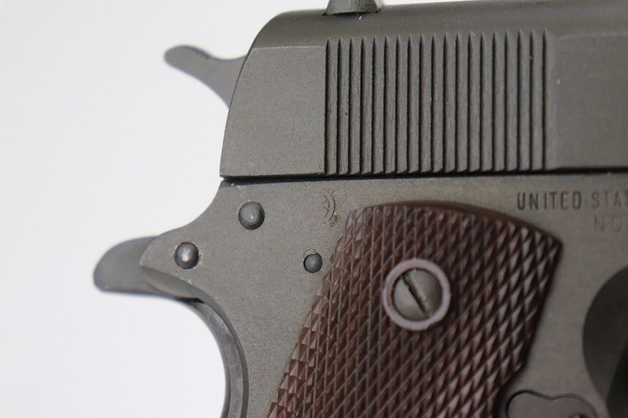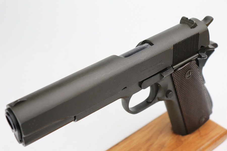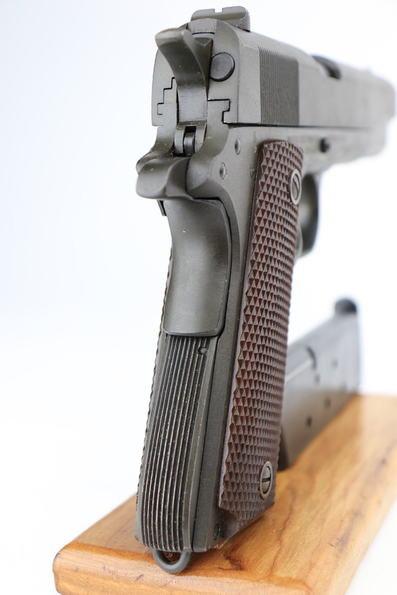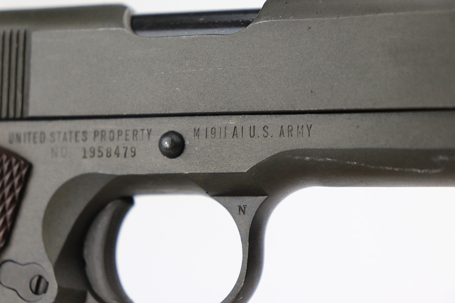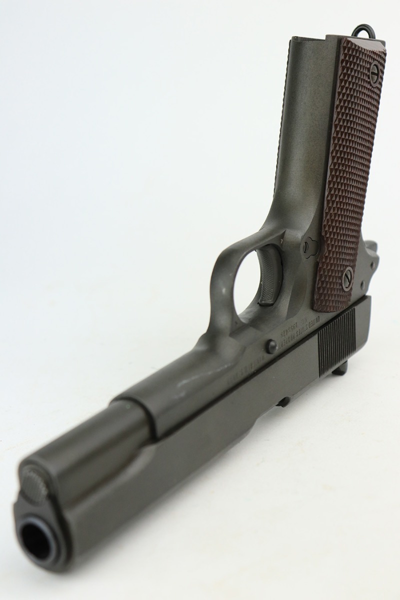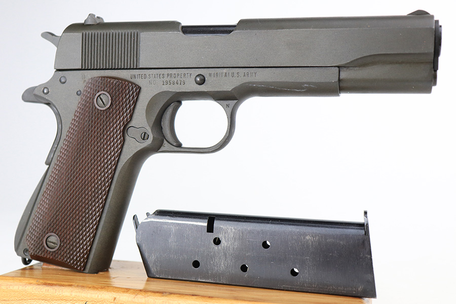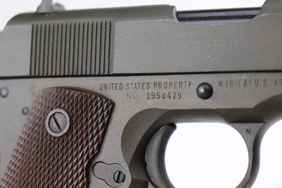 5/24/22 – This is a stunning example of a Remington Rand Model 1911A1 issued to the US military in 1944. It is “United States Property” marked, has the proper “FJA” military acceptance proof, and has a cross-cannon military cartouche. Proper High Standard barrel. This gun has retained virtually all of its parkerized finish. Comes with minty period-correct plastic grips and one proper magazine. The bore is shiny with strong rifling and some minor fouling throughout.