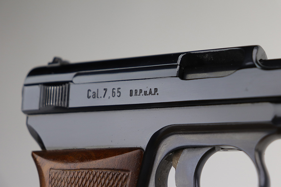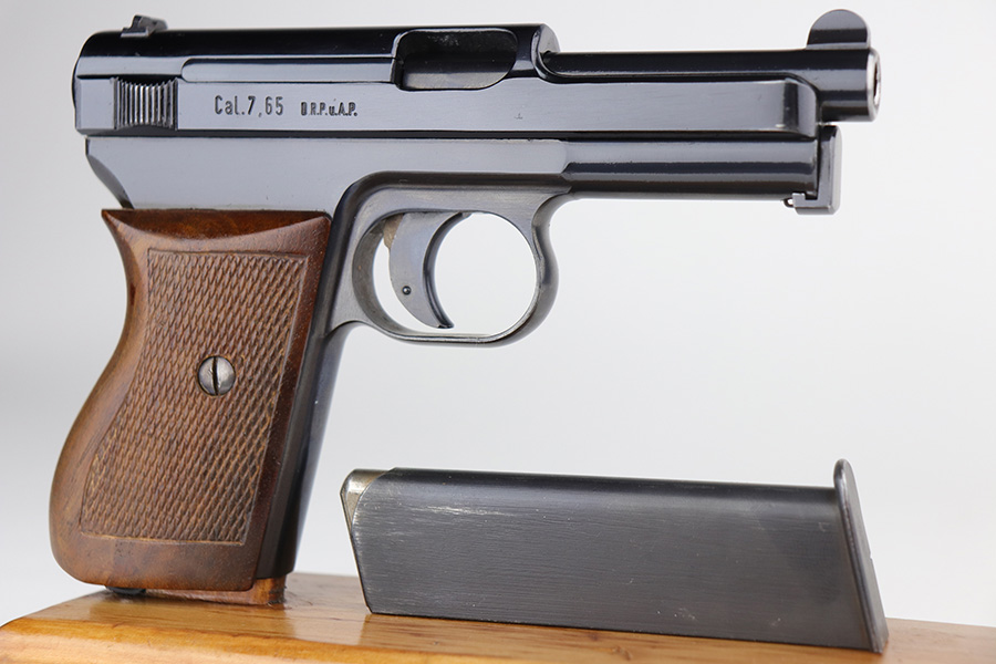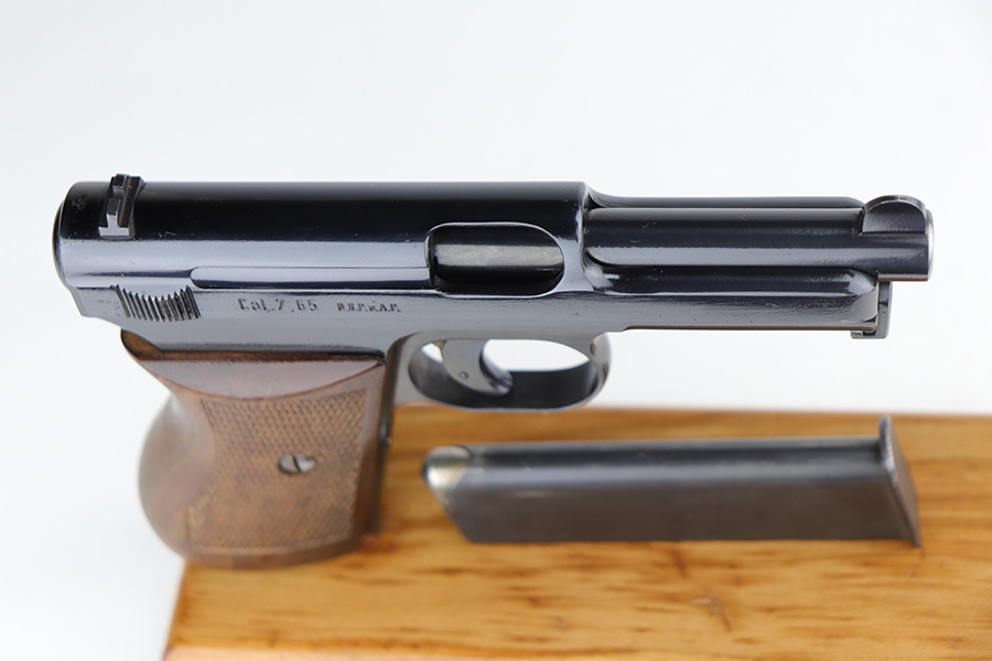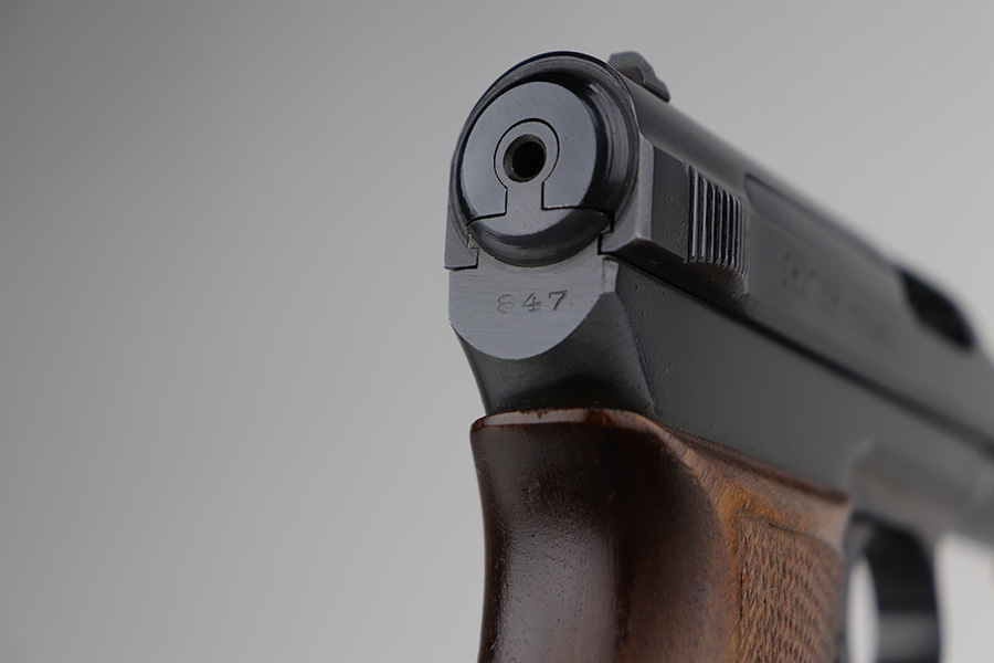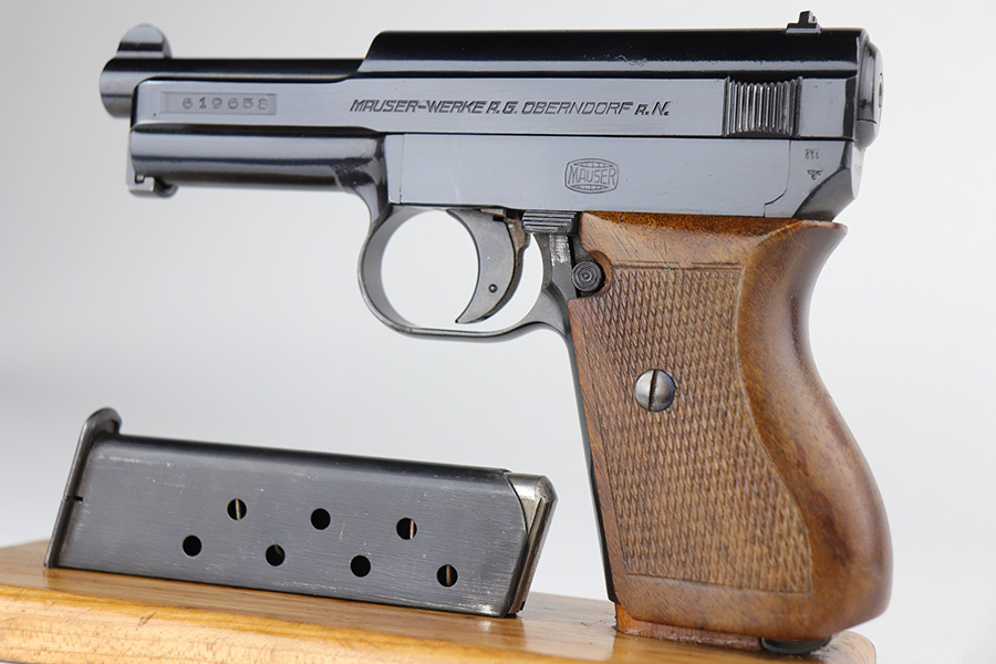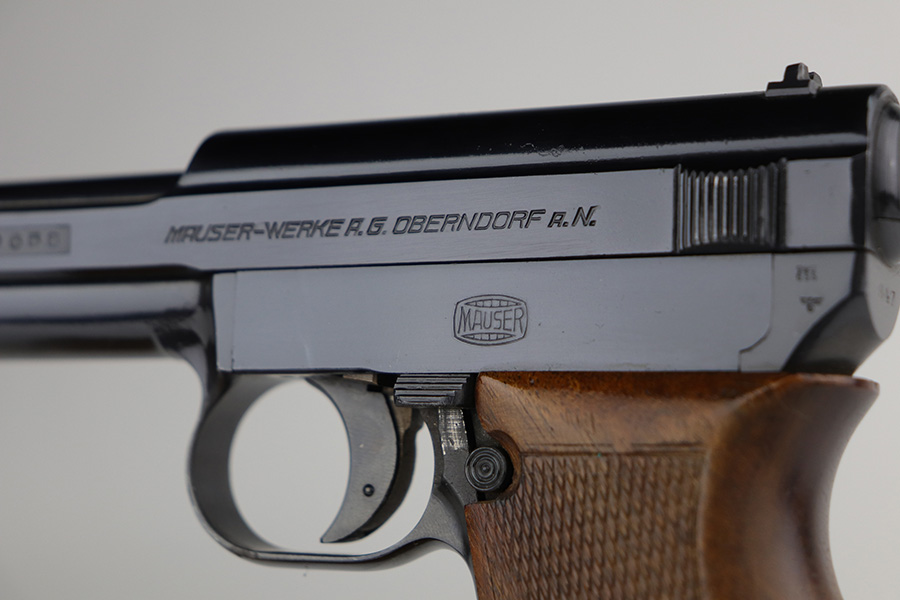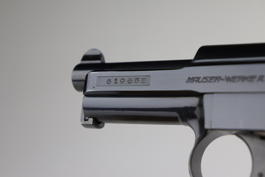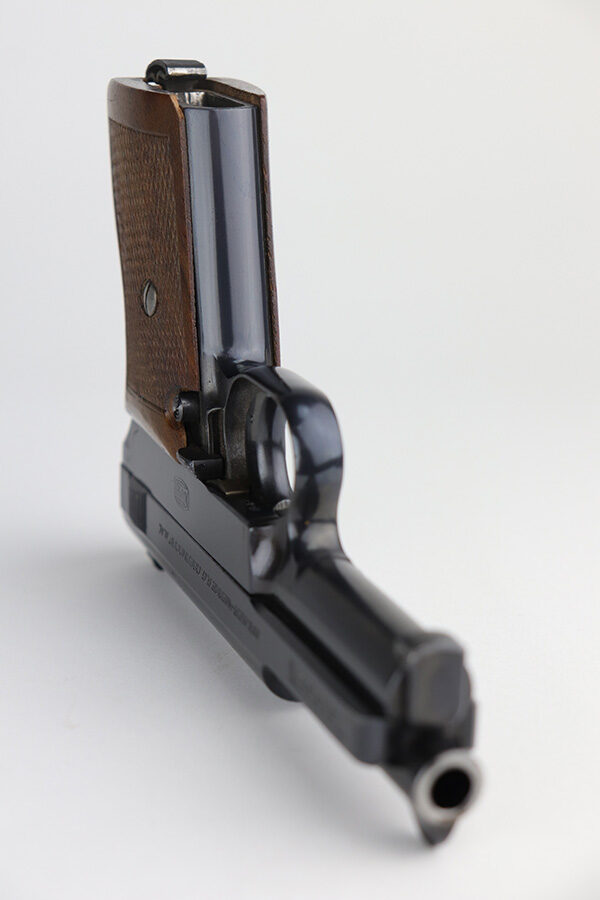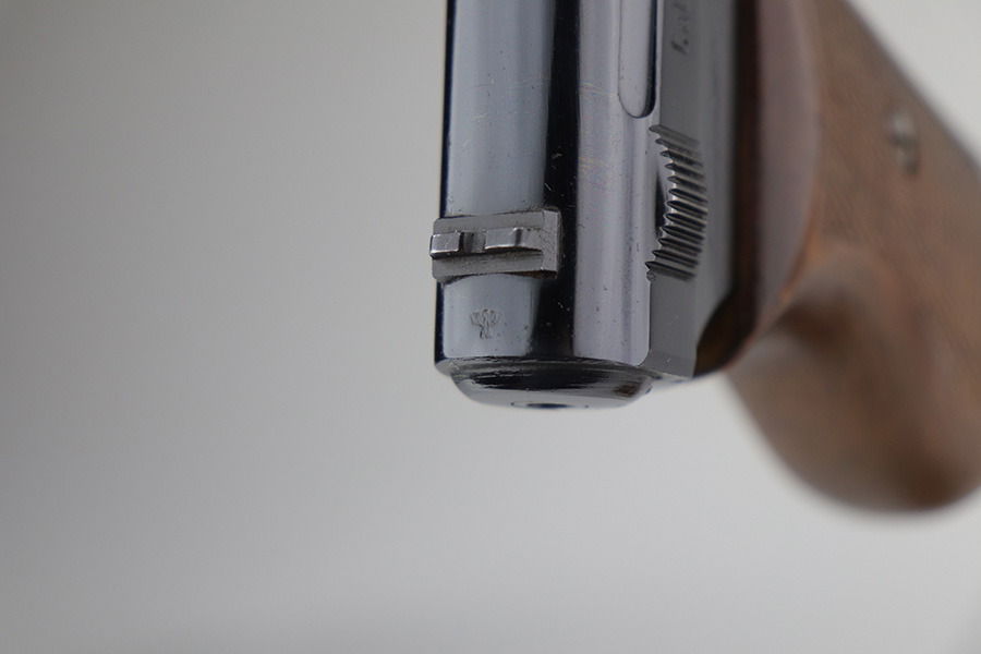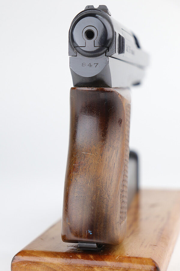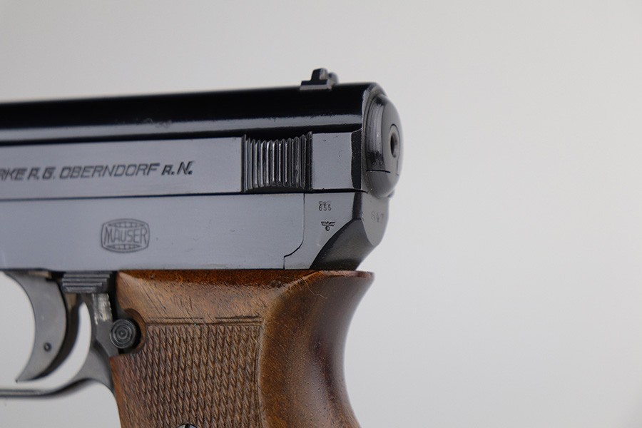 9/16/21 – This is an absolutely stunning example of a scarce Mauser Model 1934 issued to the Nazi military in 1940-41. This gun would have been produced just before the factory switched over to HSC production, around 1940-1941. It is proofed on the back left side of the frame with Eagle/655 and a test-fire eagle stamp. There were only about 8,000 of these pistols issued in this way. Unfortunately, the frame and slide are mismatched, but the gun is gorgeous, retaining virtually all of its bluing. Comes with a very nice a wood grip and a period-correct magazine. There is a small chip in the bottom left corner of the grip. The bore is factory-new.