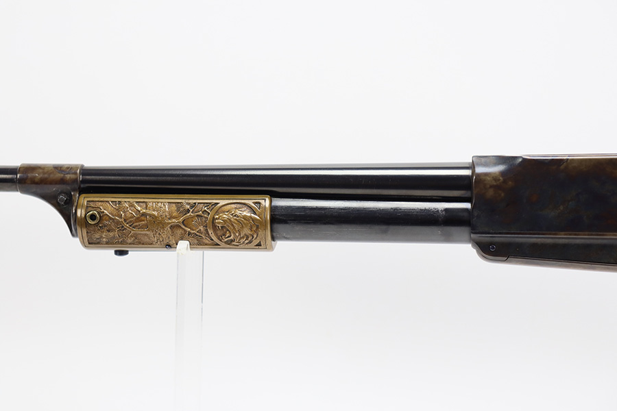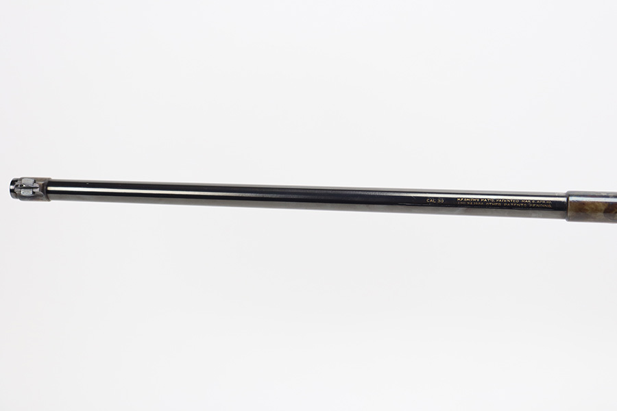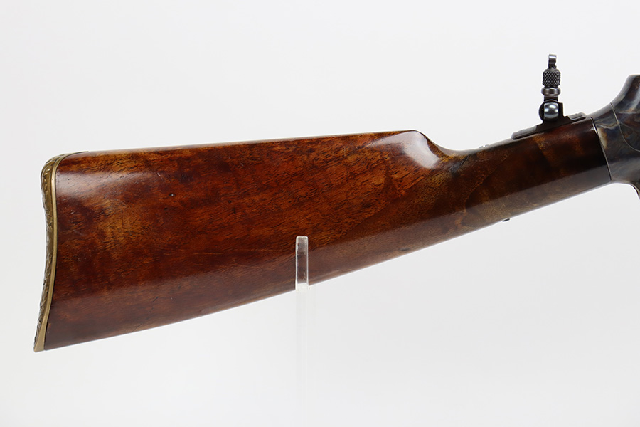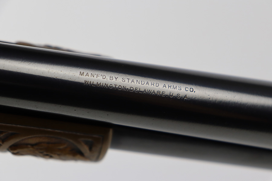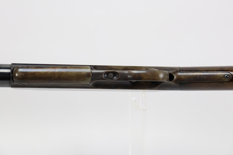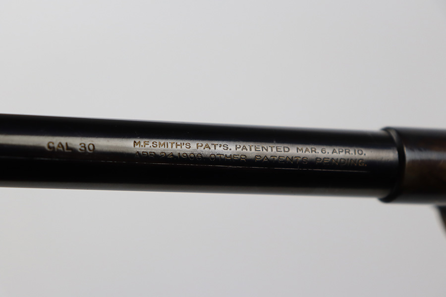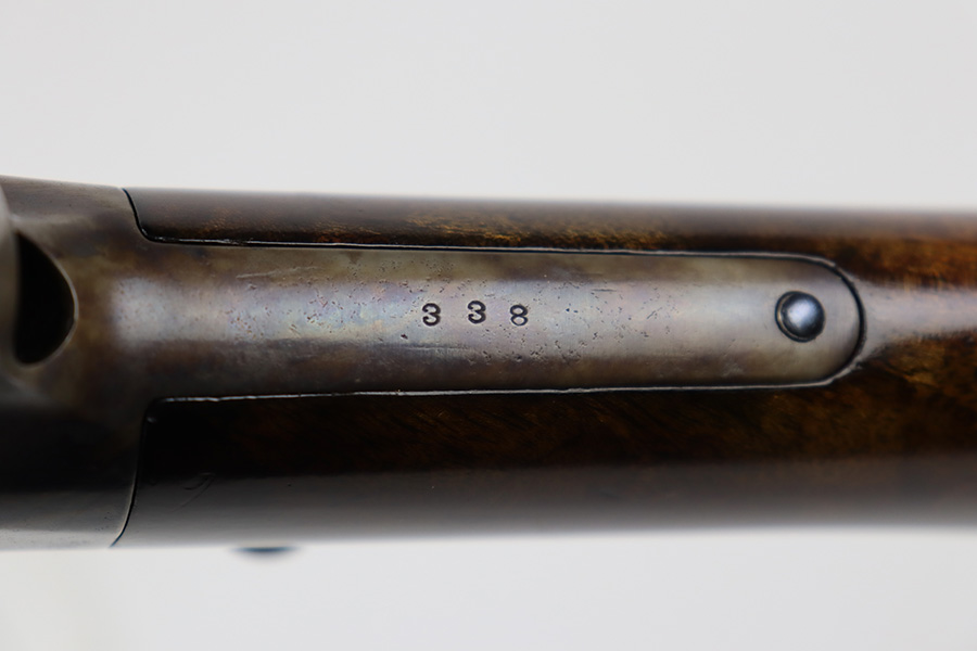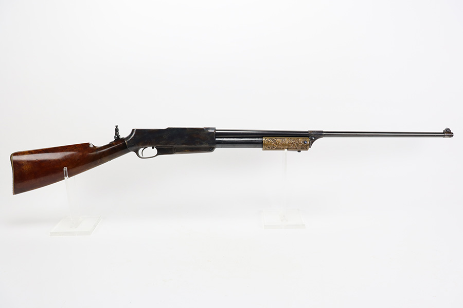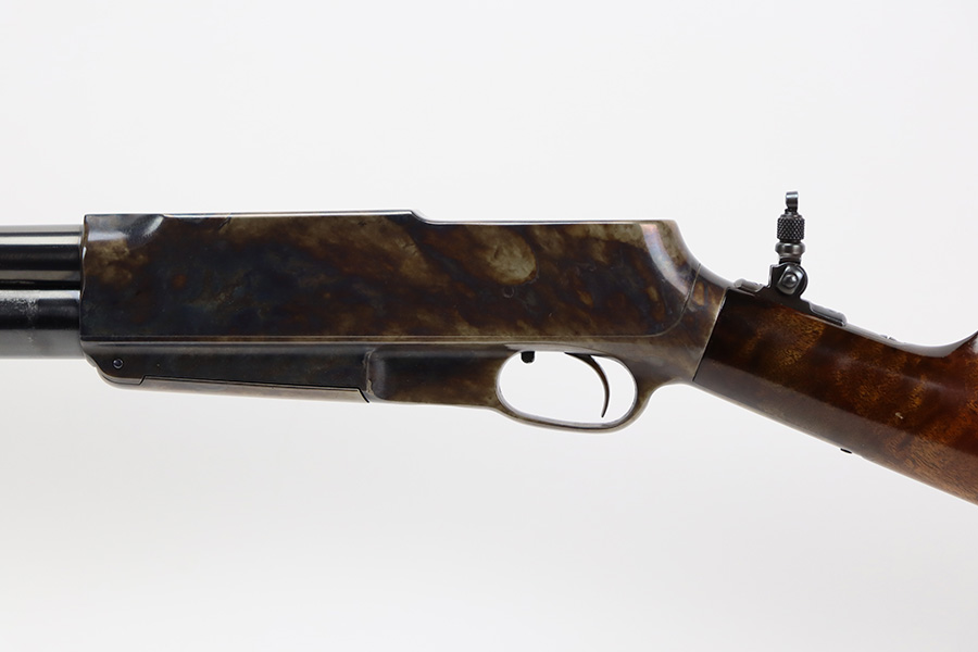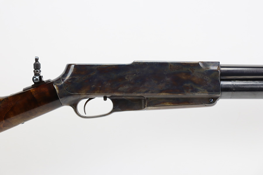 7/28/23 – This is a stunning Standard Arms Model M rifle, manufactured in 1910 and chambered in .30 Remington. Designed and patented by Morris F. Smith, less than 6,000 of the Model M were produced, and less than half of those featured the longer 25″ barrel found here. This example is a particularly scarce special order deluxe version, with color case hardened receiver, Circassian walnut stock, and folding dual aperture peep sight. The receiver was machined from a solid block of steel. Lyman blade front sight and Japanned bronze alloy forearm and buttplate. The rifle has retained nearly all of its original finish, with just some minor handling marks on the bronze forearm and a bit of thinning on the metal below from the slide action. An area of wear on the bottom of the barrel where the front band attaches. Stock is in great condition overall, but it does have a small repaired crack which is nearly impossible to see, and a few minor handling marks. Bore has pronounced rifling, but is heavily frosted throughout.