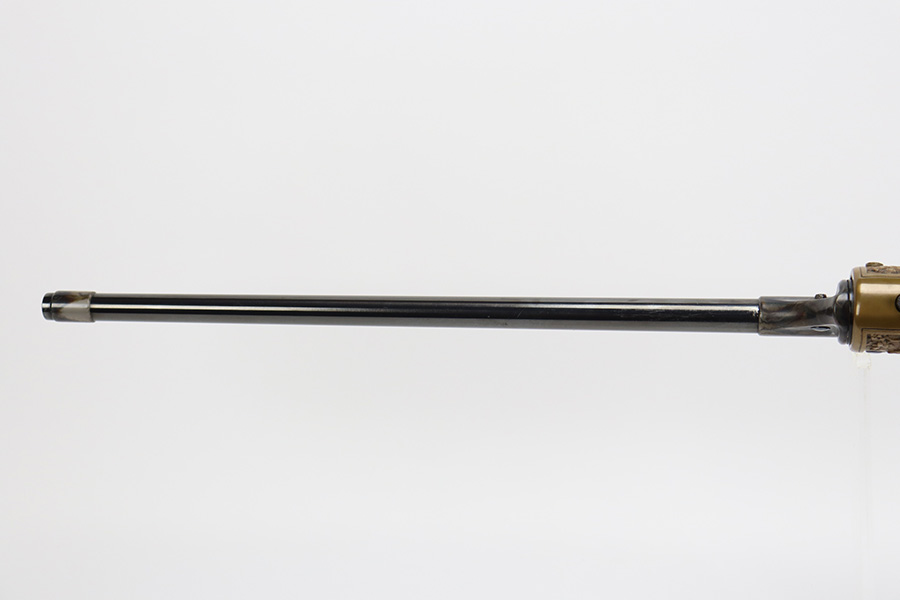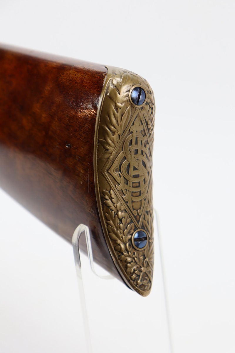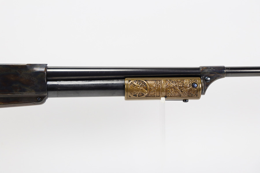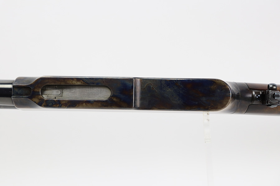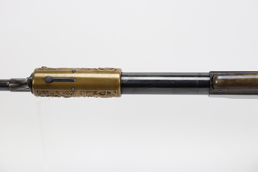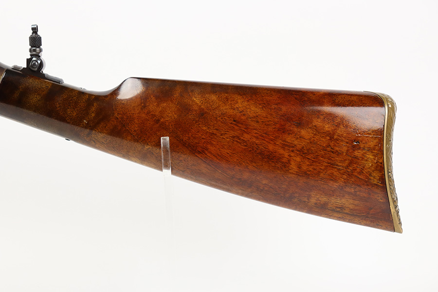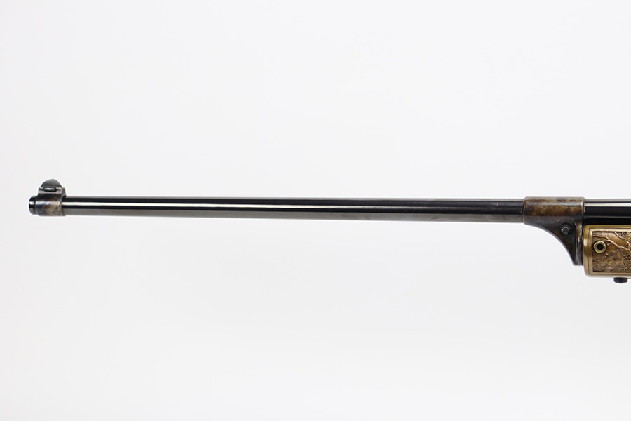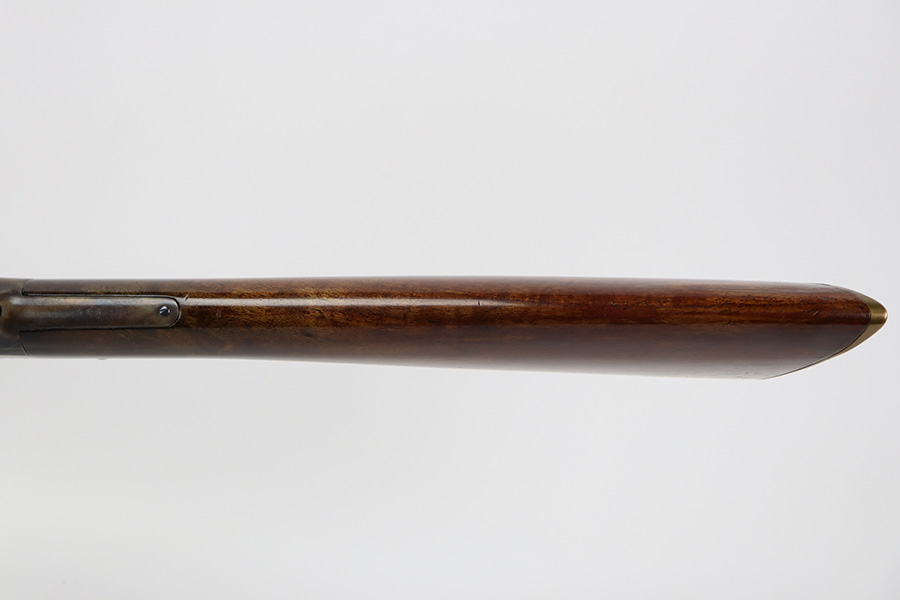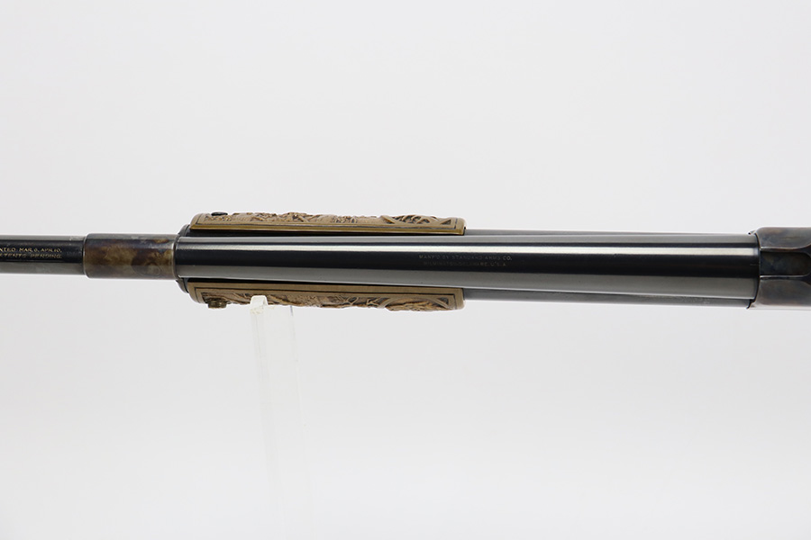 7/28/23 – This is a stunning Standard Arms Model M rifle, manufactured in 1910 and chambered in .30 Remington. Designed and patented by Morris F. Smith, less than 6,000 of the Model M were produced, and less than half of those featured the longer 25″ barrel found here. This example is a particularly scarce special order deluxe version, with color case hardened receiver, Circassian walnut stock, and folding dual aperture peep sight. The receiver was machined from a solid block of steel. Lyman blade front sight and Japanned bronze alloy forearm and buttplate. The rifle has retained nearly all of its original finish, with just some minor handling marks on the bronze forearm and a bit of thinning on the metal below from the slide action. An area of wear on the bottom of the barrel where the front band attaches. Stock is in great condition overall, but it does have a small repaired crack which is nearly impossible to see, and a few minor handling marks. Bore has pronounced rifling, but is heavily frosted throughout.