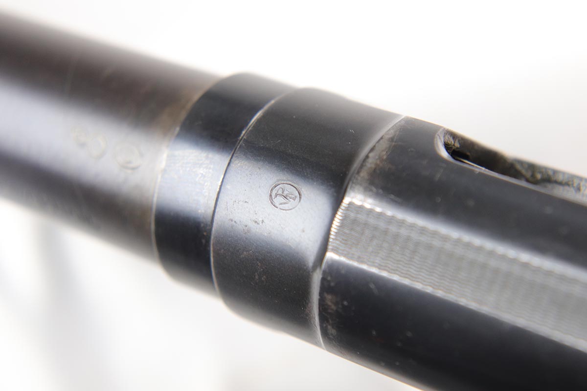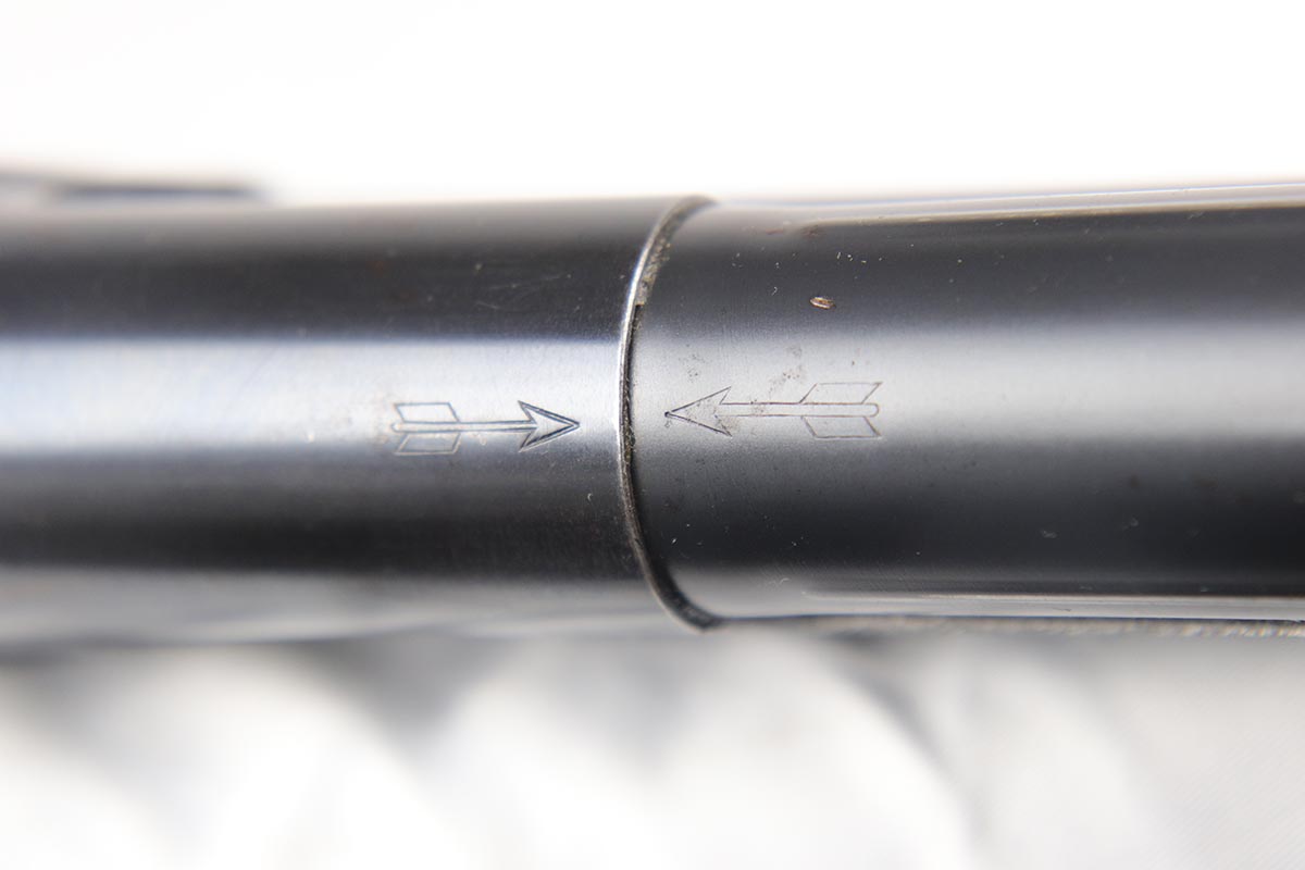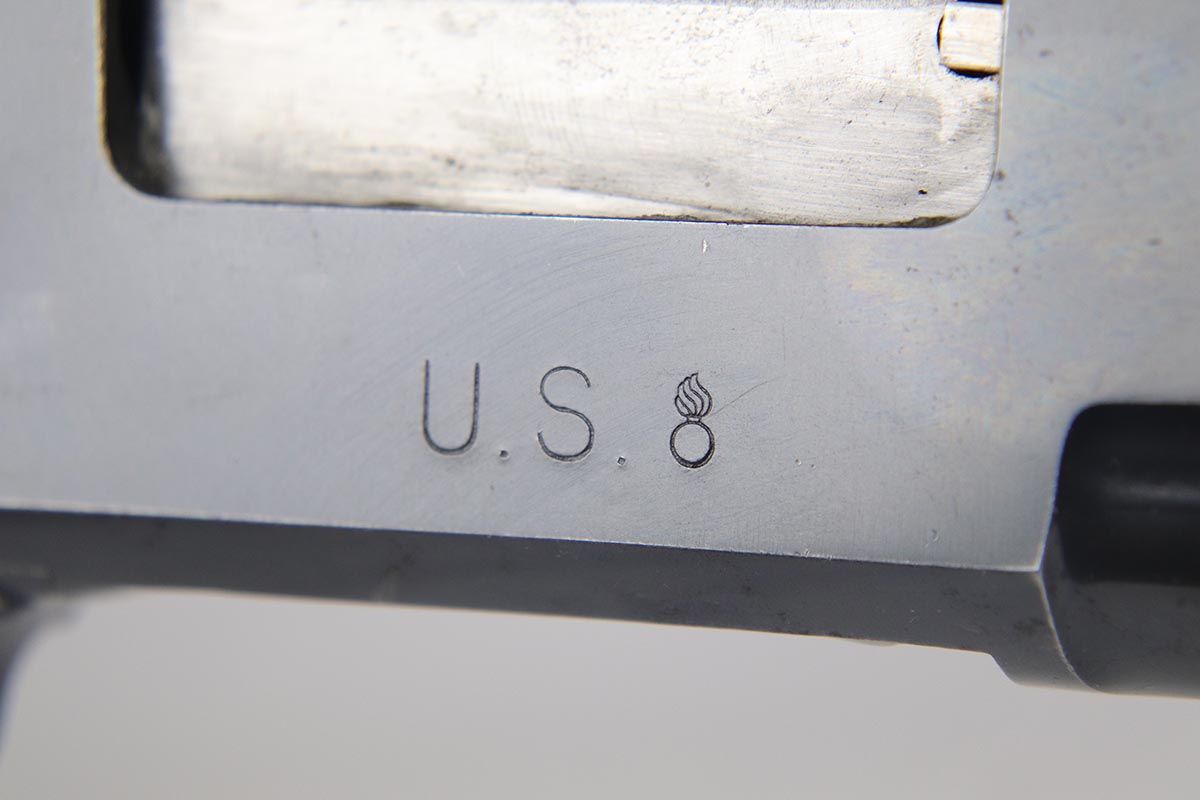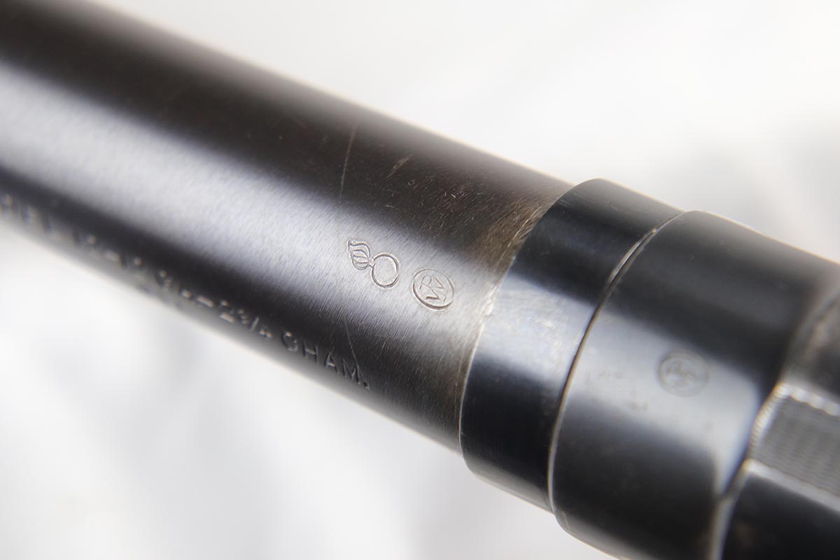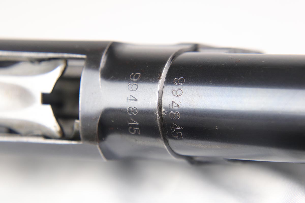 3/3/18 – This is one of the best conditioned Winchester Model 12 Trench shotguns that we have seen. All original with beautiful high-polished blue in mid-90s condition, excellent stock with sharp and all original cartouches, all original bayonet lug/heat shield, and beautiful bore. The gun was made in 1943 and has a 43 dated barrel with crisp flaming bomb and a Winchester oval proof on top. The receiver is marked with U.S. on the right side and shows just the lightest of wear. Has a few tiny spots of discoloration on the left side with no thinning of the finish and no pitting anywear. The stock is equally nice with original buttplate and sling swivel. Inspector’s cartouche and the Arsenal ordnance wheel are sharp and absolutely original. The heat shield shows some dulling to the finish, essentially protecting the barrel from any significant wear. Barrel is correctly marked “cyl”. Bayonet lug is correctly unmarked and all original as well. These guns were taken out of the Winchester commercial production and have the same deep, lustrous blue as their commercial counterparts. Most were heavily used in WWII and subsequently in the Korean War, so finding a pristine example like this is next to impossible.