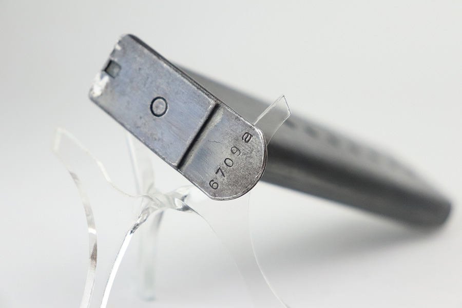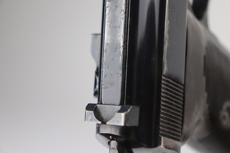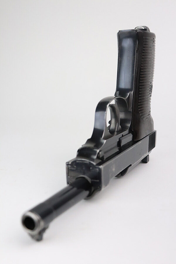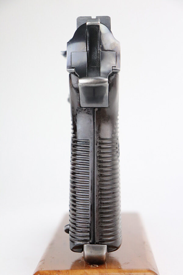 7/1/21 – This is a very nice example of a super rare variation of Walther P.38 issued to the Nazi military in 1941. There were only 400 of this variation produced! The gun is all matching and has the proper “Eagle 359” proofs throughout, even on the small parts. What makes this one rare is the mixed military proofs on the right side of the slide “Waffen 359” and “Eagle 359”. It has retained about 92-93% of its original high polish finish. There is wear around the high edges of the slide and around the muzzle. An area of spotty wear on the right side of the slide. Minor scratchy wear on the front strap. Minor pitting on the top plate. Comes with excellent matching grips and a period-correct numbered but mismatched magazine. The bore is shiny with strong rifling with freckling throughout. De-cocker is functional.