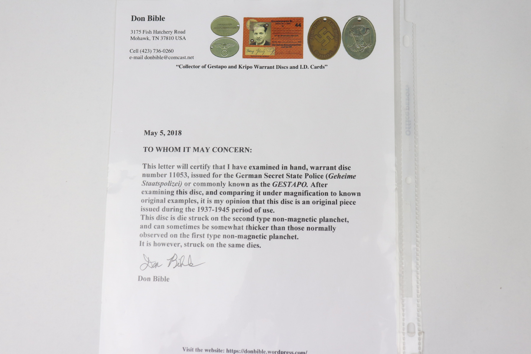 6/21/21 – This is a very rare and desirable Nazi Gestapo disc which has been personally authenticated by Don Bible, the leading expert on the Gestapo and Kripo discs. These discs were used as the official identification for plain-clothes officers under Himmler’s rule. This variation, which is die struck in nickel silver, is marked ‘GEHEIME STAATSPOLIZEI’ over the officer number 11053. It’s in excellent condition with minor surface wear but no notable defects. Comes with the signed authentication letter as issued by Don Bible.