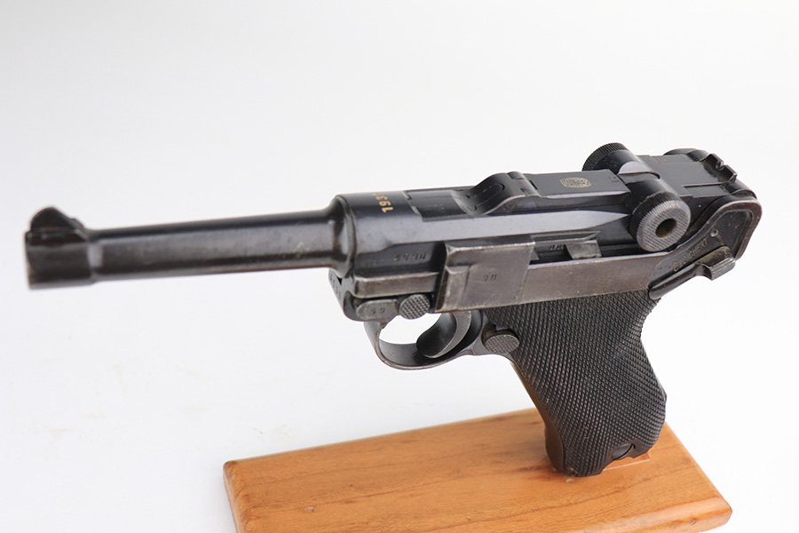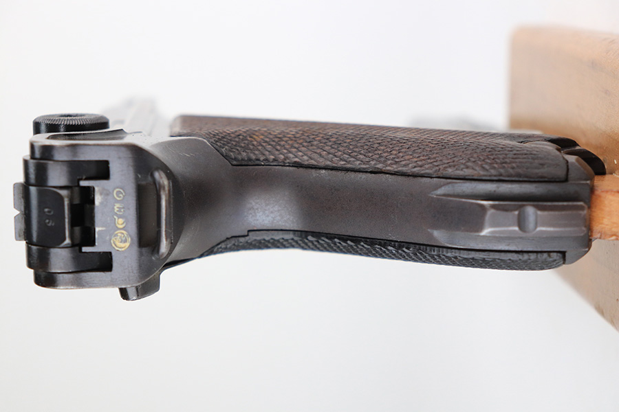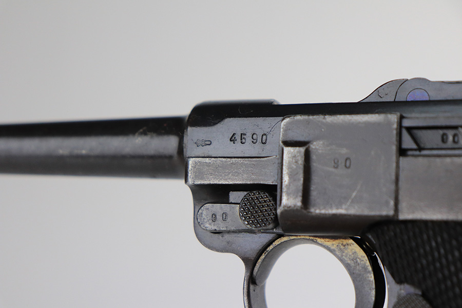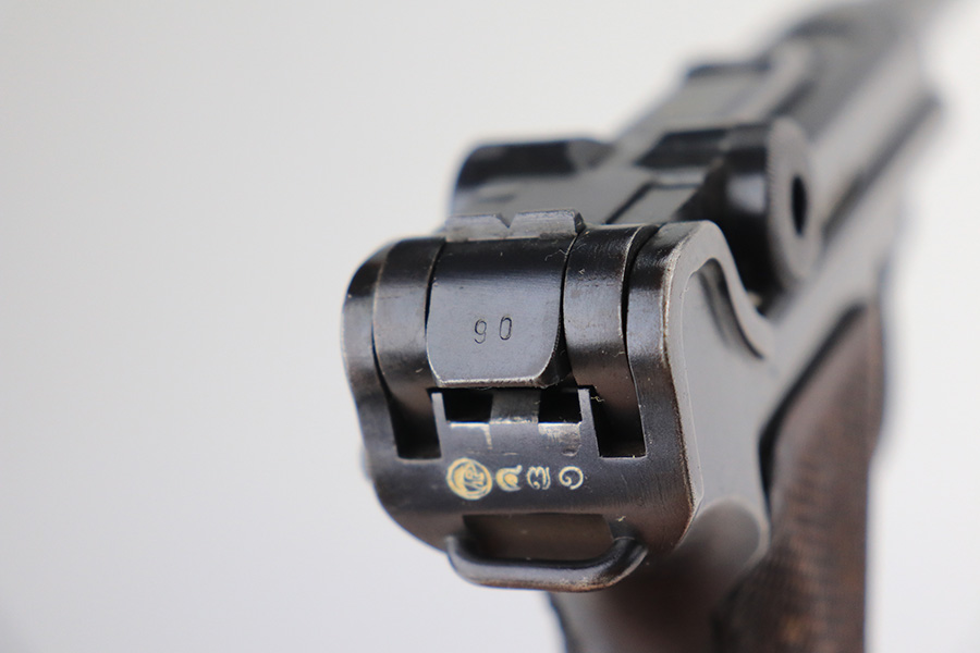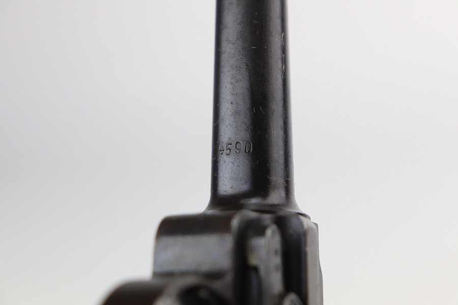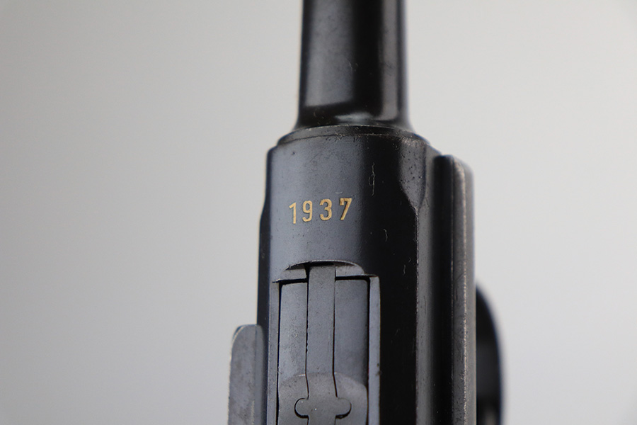 12/23/21 – This is a very rare 1937 Mauser Banner Luger that was part of a small contract order by Thailand’s government. It was reported only 150 were ordered, and roughly 35 now remain. These saw extensive use and the finish was presumably arsenal re-done in Thailand. It has all matching numbers, with a period original but mismatched magazine. Unmarked grips. Strong, shiny bore. The finish shows some visible patina on the grip straps, sideplate and left side frame. Not much bluing loss overall, some on trigger guard and rails. Smoothing of the checkering on the grips but no cracks or chips. Import mark on trigger guard.