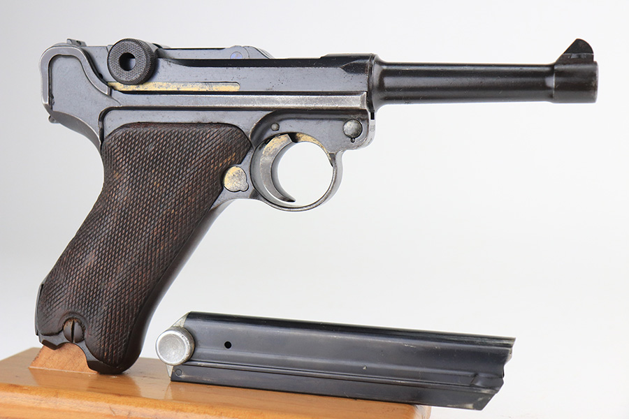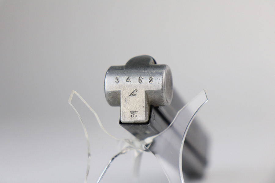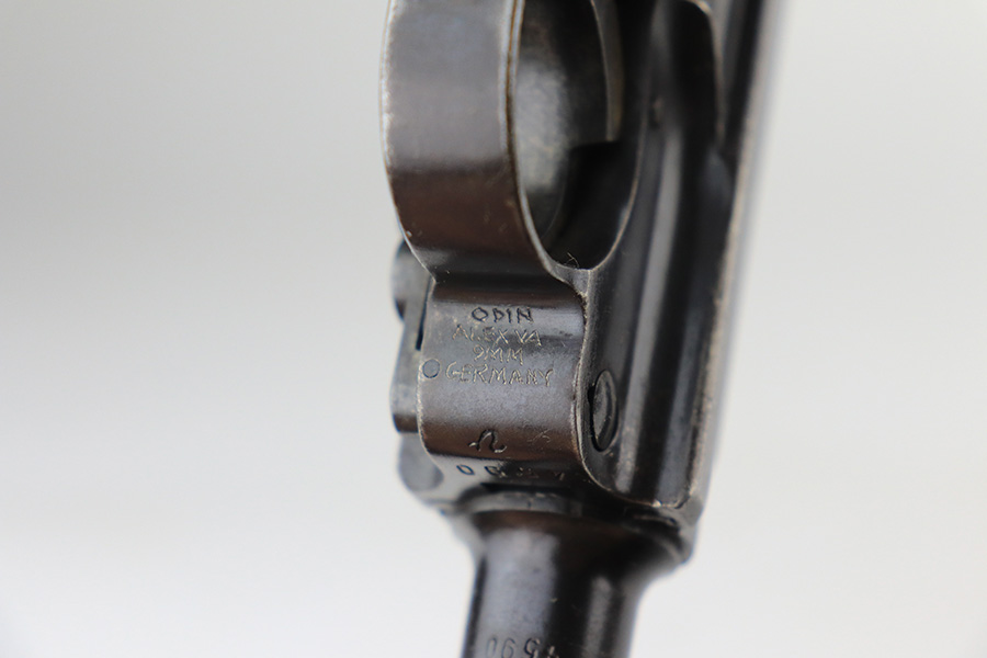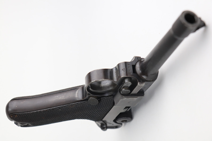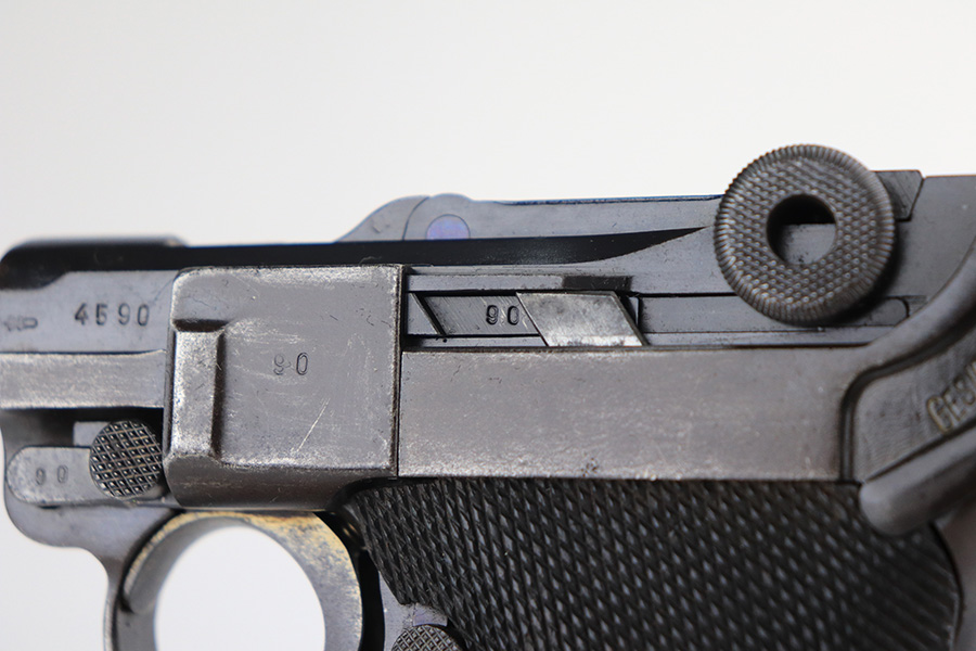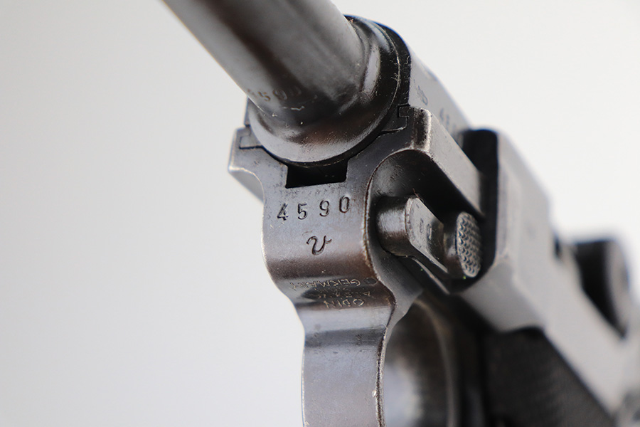 12/23/21 – This is a very rare 1937 Mauser Banner Luger that was part of a small contract order by Thailand’s government. It was reported only 150 were ordered, and roughly 35 now remain. These saw extensive use and the finish was presumably arsenal re-done in Thailand. It has all matching numbers, with a period original but mismatched magazine. Unmarked grips. Strong, shiny bore. The finish shows some visible patina on the grip straps, sideplate and left side frame. Not much bluing loss overall, some on trigger guard and rails. Smoothing of the checkering on the grips but no cracks or chips. Import mark on trigger guard.