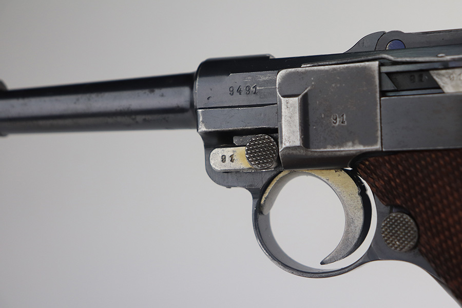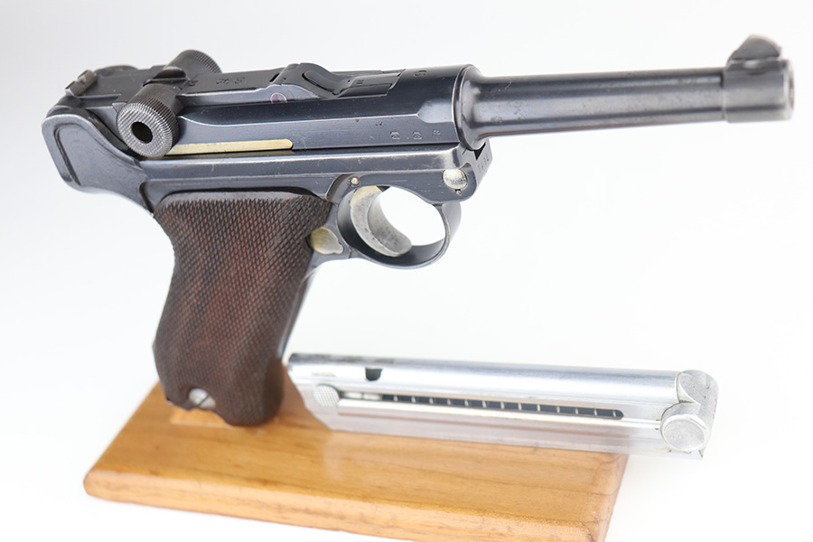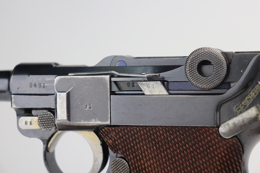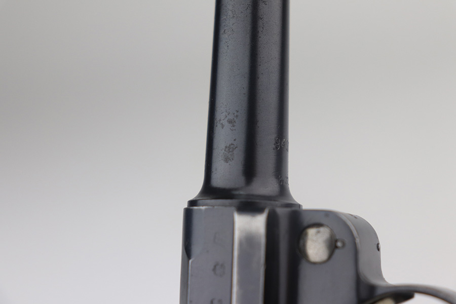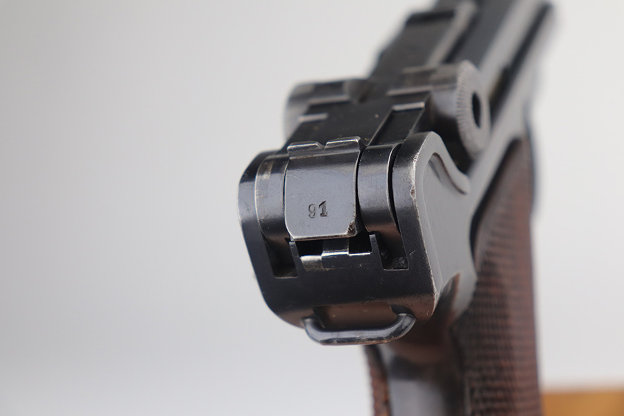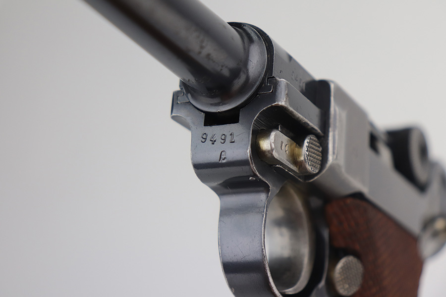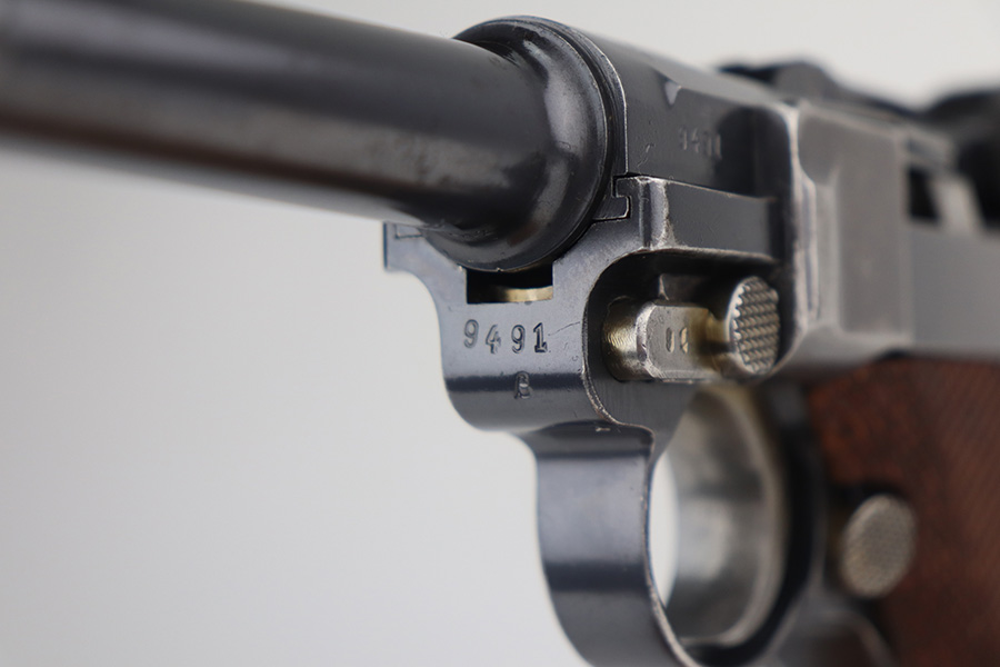12/28/21 – This is an extremely rare Nazi Mauser Luger from 1935 that was part of a fulfilled military contract that was diverted to the police. It is estimated that only 600 such examples were produced in 1935, with only 11 reported as known/documented in Third Reich Lugers! This one is all matching and original, including the magazine. The magazine is numbered in the police style with Haenel manufacturer’s mark. It’s in very good condition, with some wear on the muzzle, sideplate and straps. Excellent bore. Nearly all of the known examples are reported in the 9000e serial range, so this one fits. Police sear safety visible over sideplate. Excellent, unmarked grips but we do believe the left panel was replaced at some point due to fit.