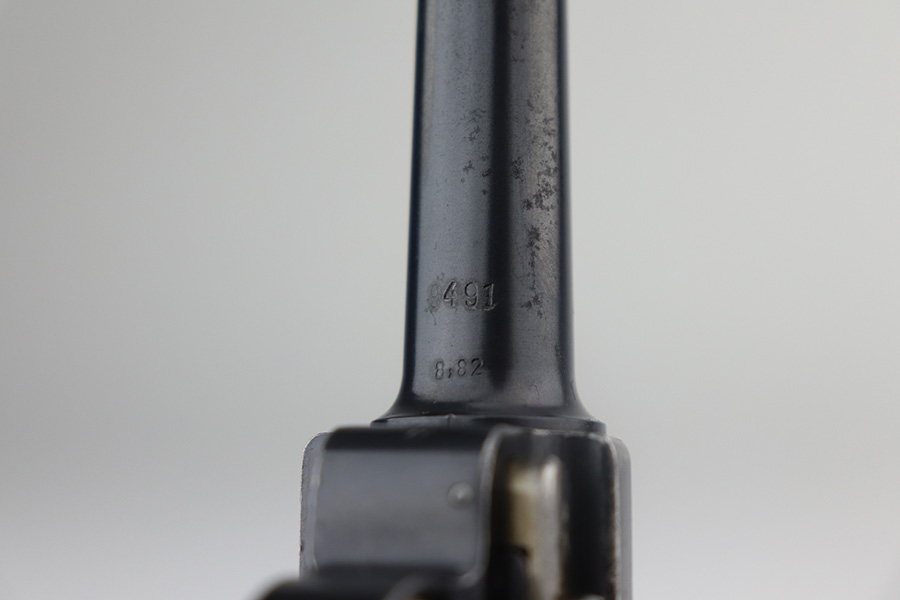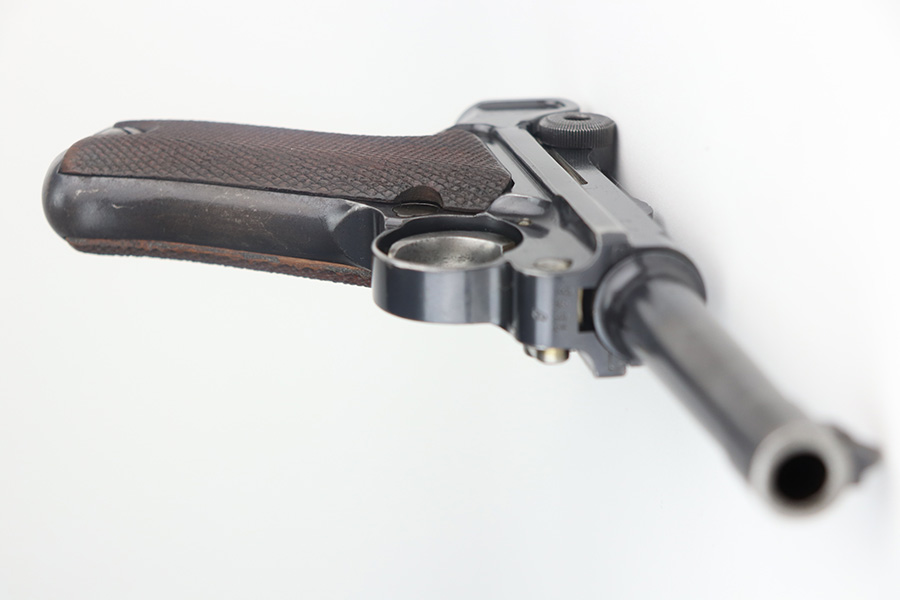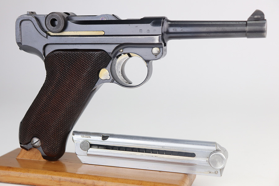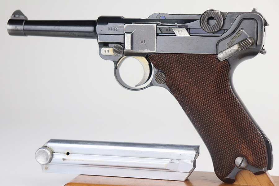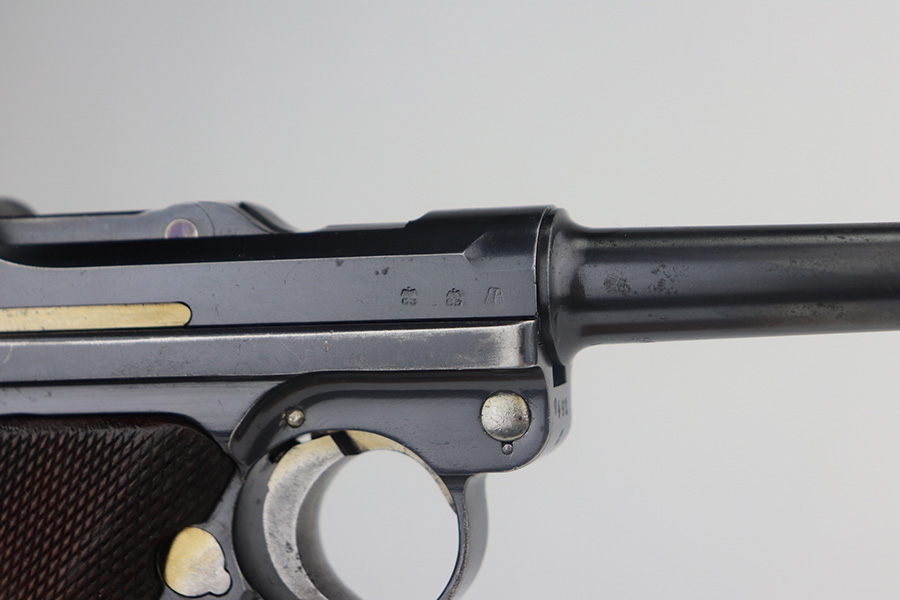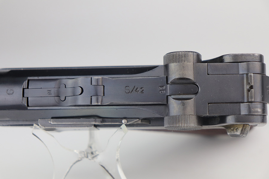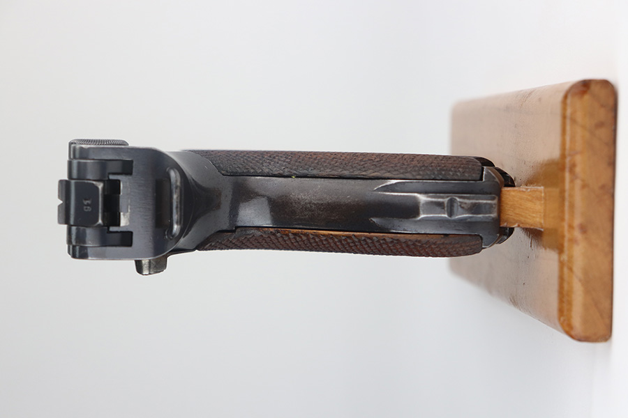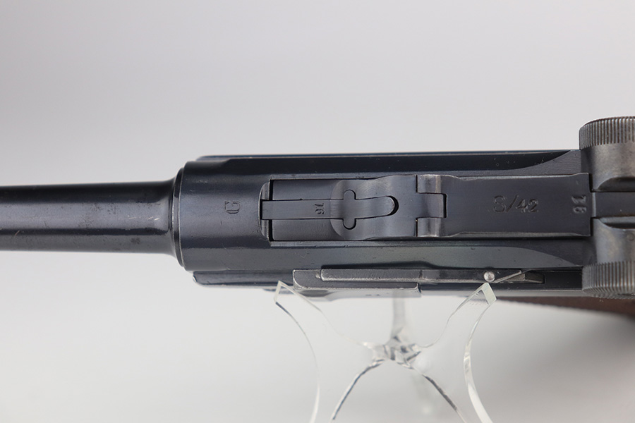 12/28/21 – This is an extremely rare Nazi Mauser Luger from 1935 that was part of a fulfilled military contract that was diverted to the police. It is estimated that only 600 such examples were produced in 1935, with only 11 reported as known/documented in Third Reich Lugers! This one is all matching and original, including the magazine. The magazine is numbered in the police style with Haenel manufacturer’s mark. It’s in very good condition, with some wear on the muzzle, sideplate and straps. Excellent bore. Nearly all of the known examples are reported in the 9000e serial range, so this one fits. Police sear safety visible over sideplate. Excellent, unmarked grips but we do believe the left panel was replaced at some point due to fit.