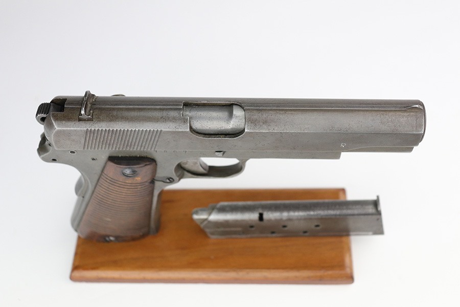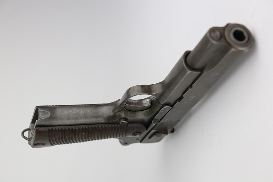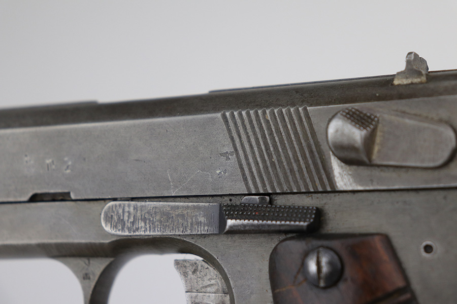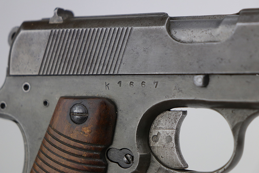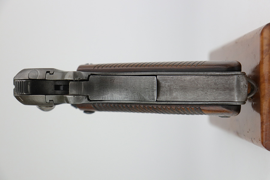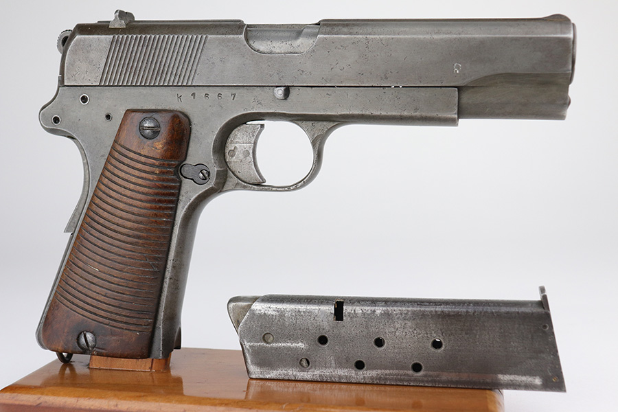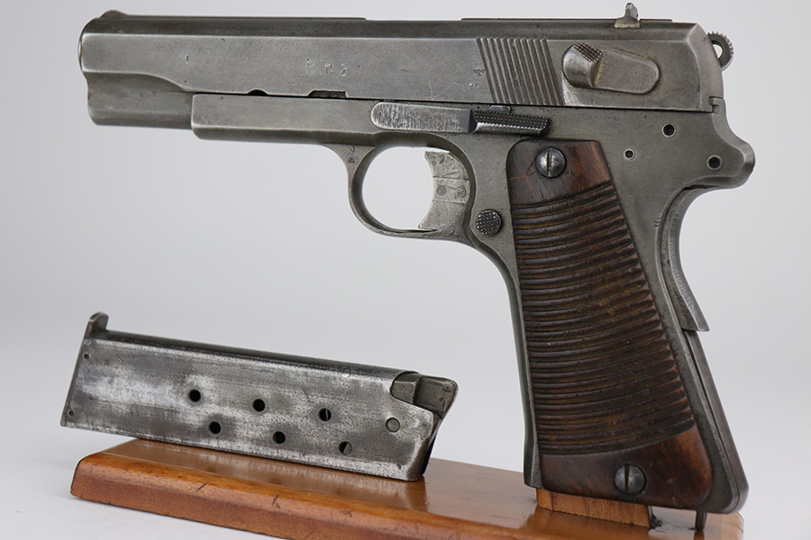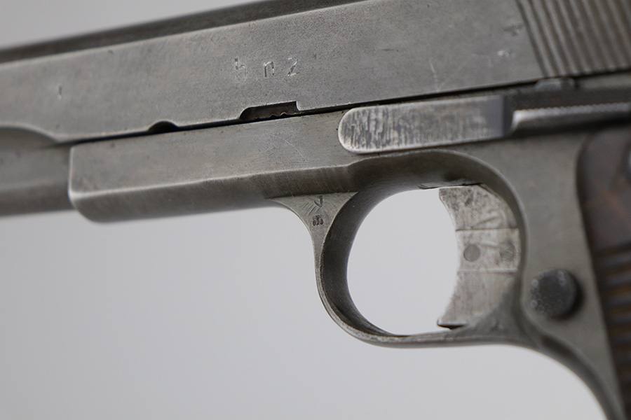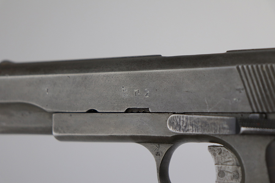 9/17/21 – This is a super rare and original example of the ‘bnz’ marked Nazi Radom VIS Model 35 that was produced at the Steyr factory at the end of the war. This is one of the most requested WW2 firearms from our collector community, and this one falls in the proper serial range of K1000-K2500. Original phosphate finish with matching slide, frame and barrel. Somewhat difficult to rate the finish but its in good shape overall, though there is some freckling on the right side of the pistol. Terrific, shiny bore. Scarce, original late-war grips are also in good shape, no major defects. Proper magazine which is also E/623 proofed, same as slide and frame.