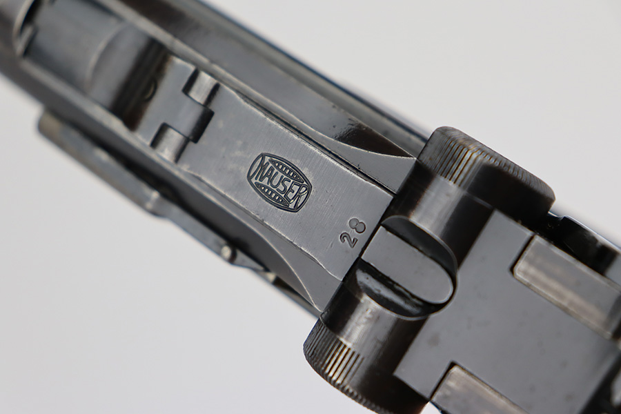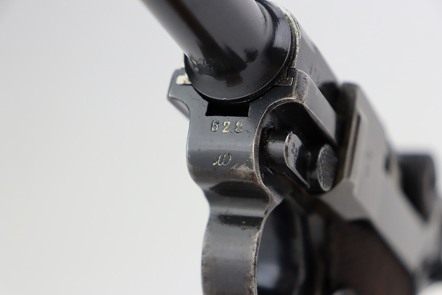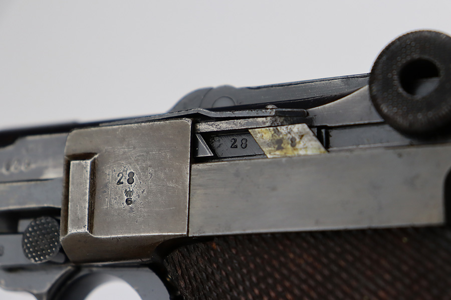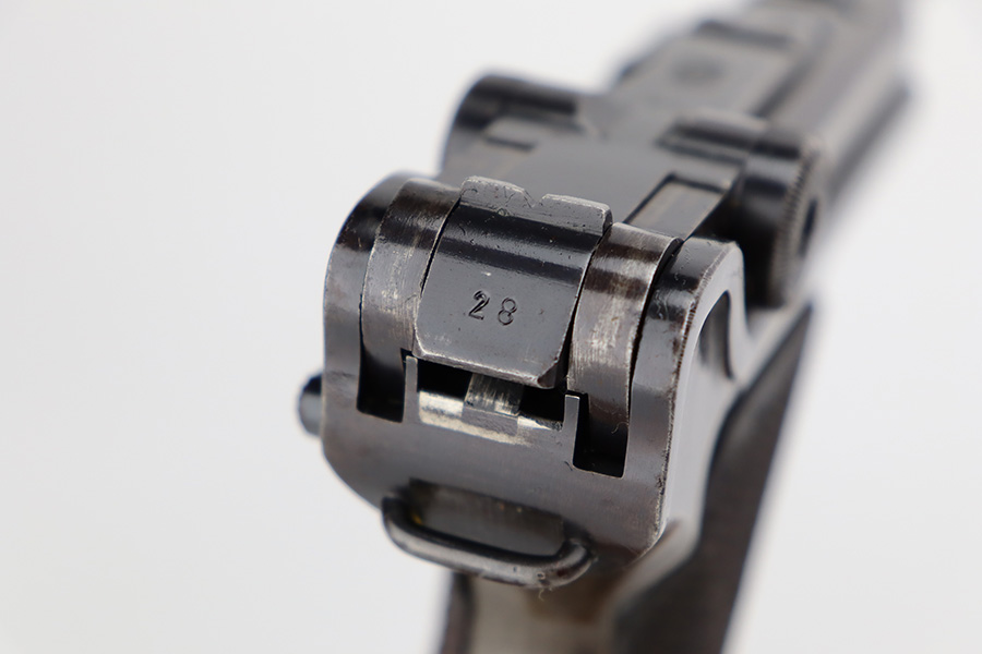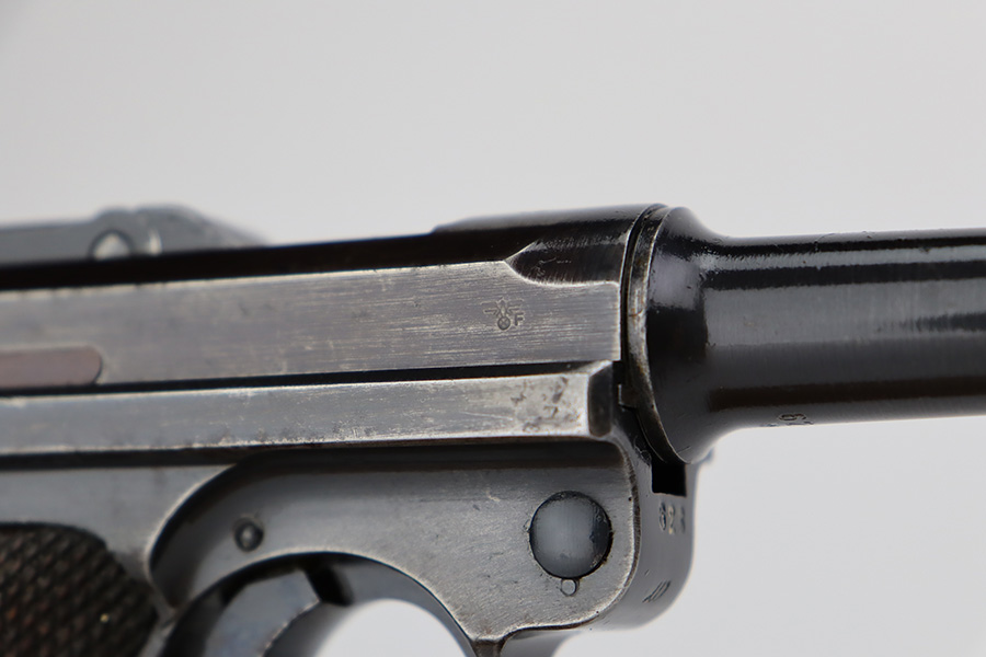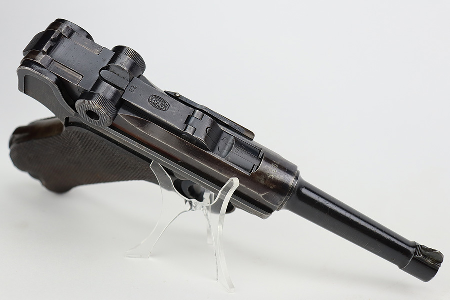 7/28/23 – This is a super rare Mauser Banner Luger that is police-issued with Eagle/F acceptance mark. There were only around 1200 ever produced with the the Eagle/F marking, all in 1939, and only 30 are known to still exist. This one has matching numbers throughout, including grips and magazine. Sideplate features the Simson E/6 proof. The finish is worn with notable thinning and patina on the straps, sideplate and left side of receiver. Magazine has the matching three-digit serial, and a ‘3’ but there’s a large gouge in the metal. Terrific bore. Nice grips with no cracks or chips.