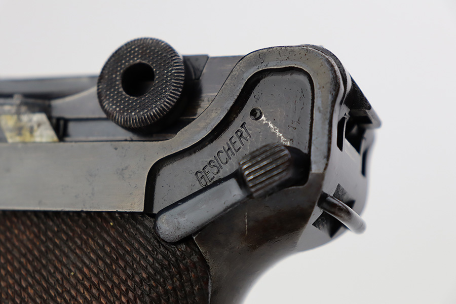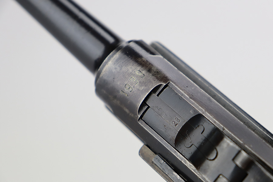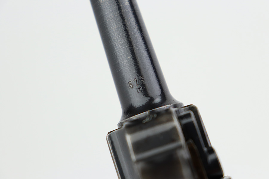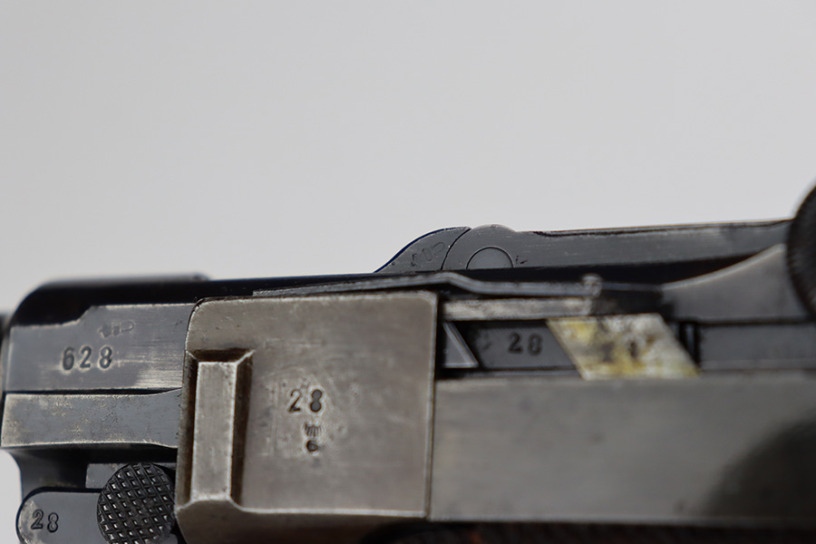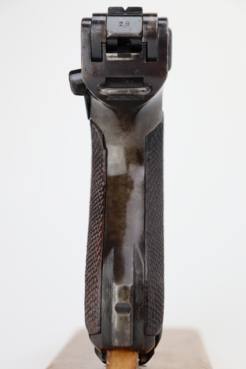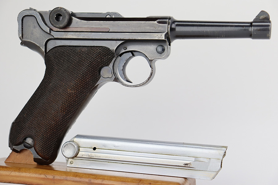 7/28/23 – This is a super rare Mauser Banner Luger that is police-issued with Eagle/F acceptance mark. There were only around 1200 ever produced with the the Eagle/F marking, all in 1939, and only 30 are known to still exist. This one has matching numbers throughout, including grips and magazine. Sideplate features the Simson E/6 proof. The finish is worn with notable thinning and patina on the straps, sideplate and left side of receiver. Magazine has the matching three-digit serial, and a ‘3’ but there’s a large gouge in the metal. Terrific bore. Nice grips with no cracks or chips.