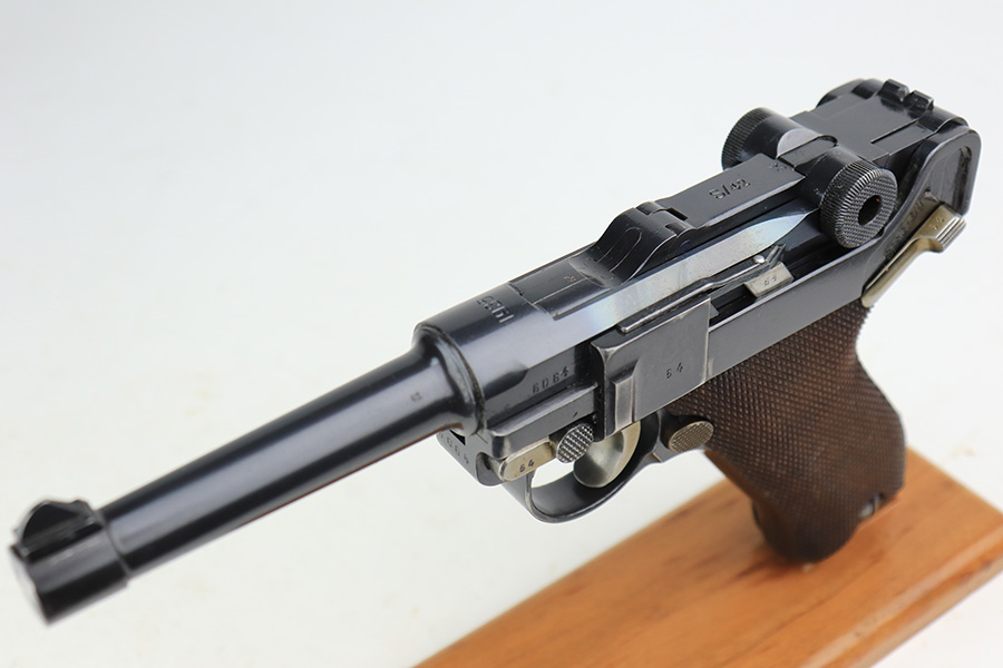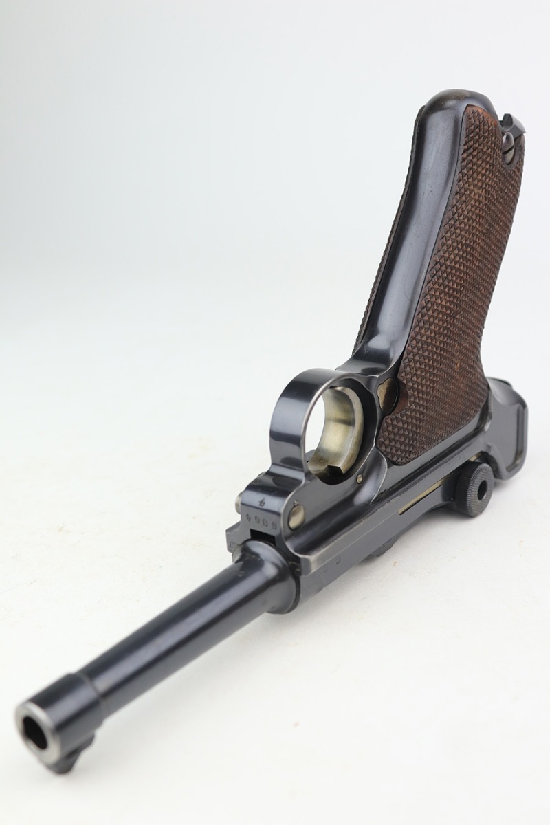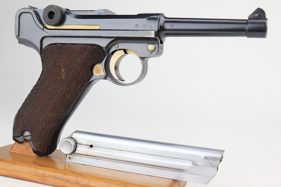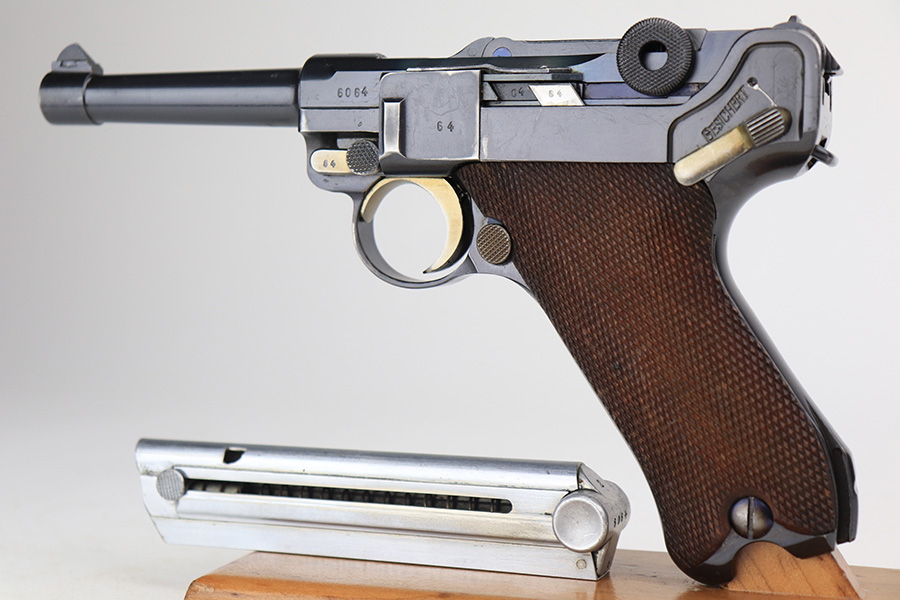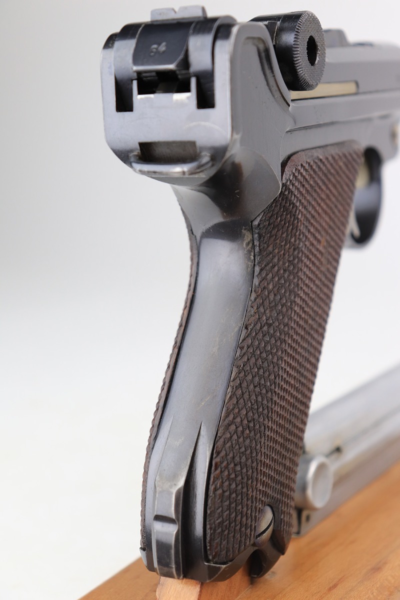 3/18/22 – This is an extremely rare Nazi Mauser Luger from 1936 that was part of a fulfilled military contract that was diverted to the police. It is estimated that only 200 such examples were produced, with only 4 reported as known/documented in Third Reich Lugers! This one is all matching and original, including the magazine. The magazine is numbered in the police style with Haenel manufacturer’s mark. It’s in great condition with minor wear on the grip straps, sideplate and right side rail. Excellent straw remains on the small parts. Bore is shiny with strong rifling, just has a little frost in the grooves. Excellent unmarked grips with sharp checkering.