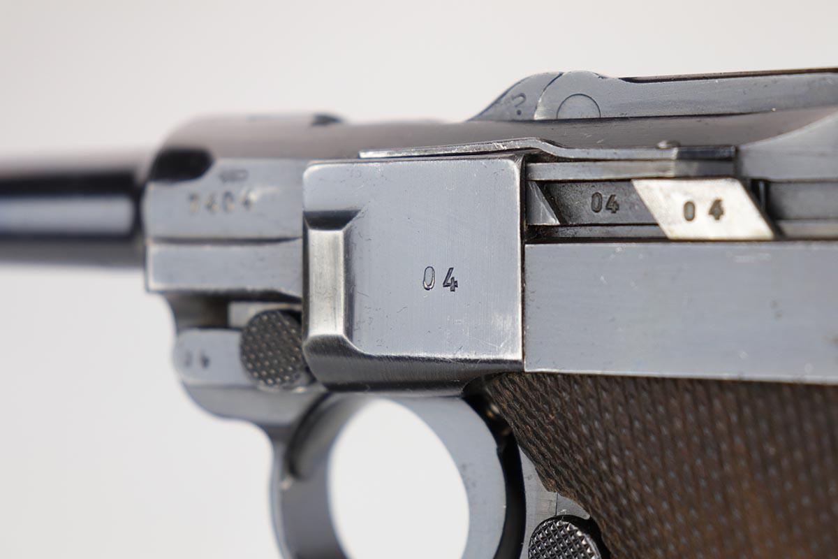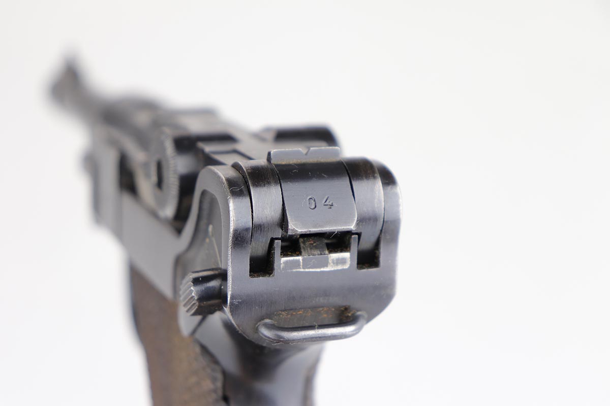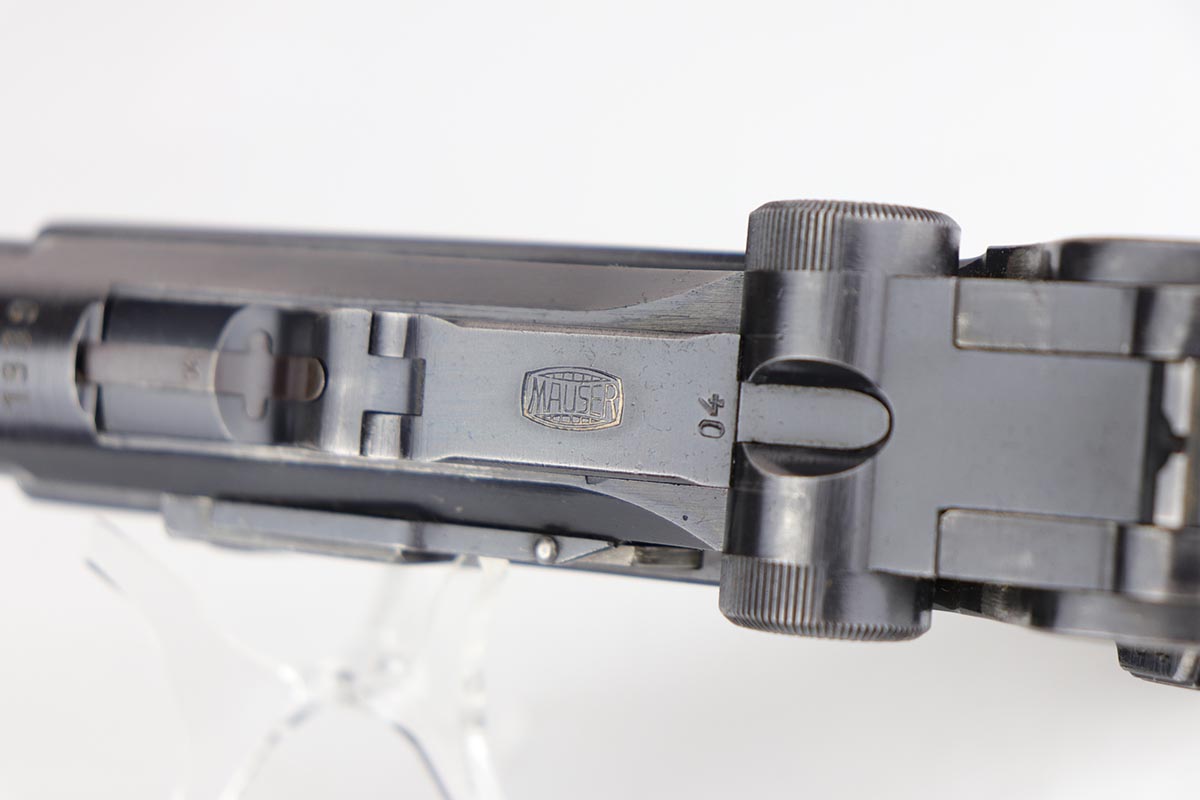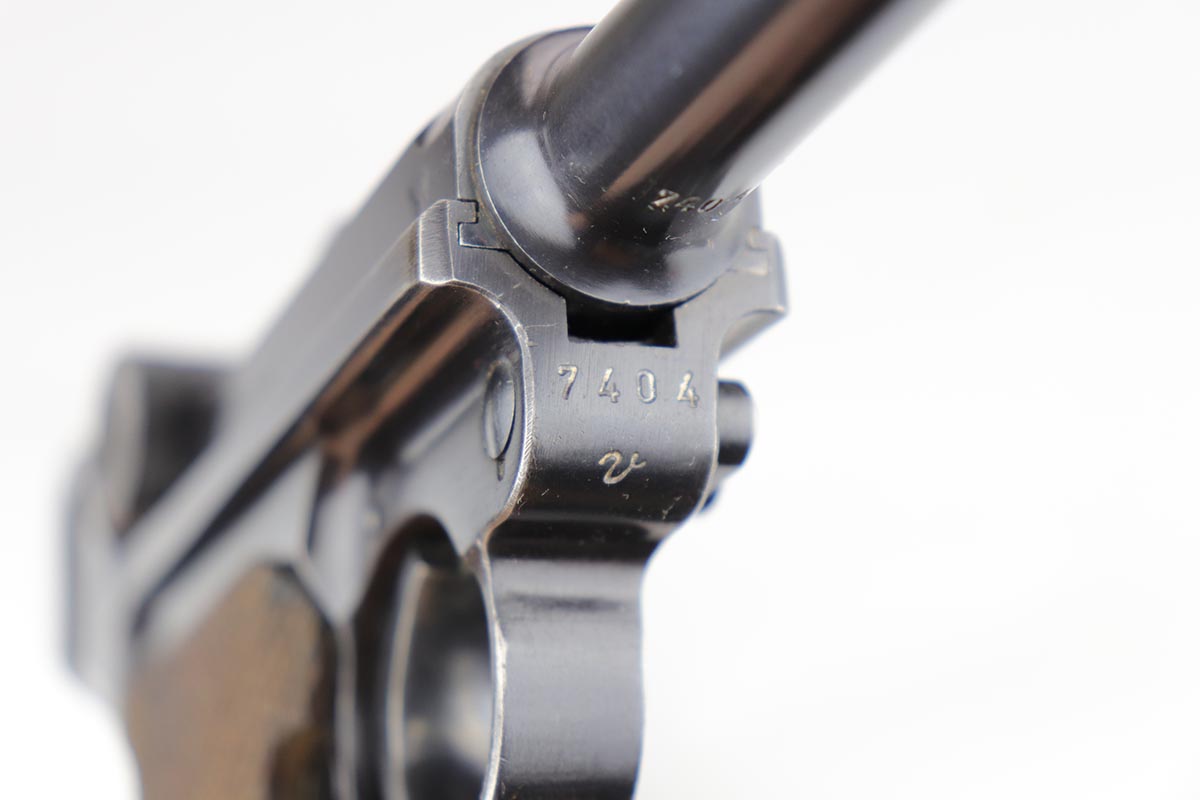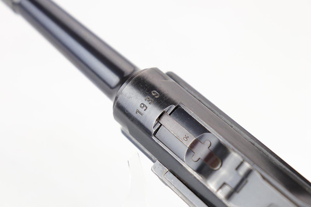 2/26/20 – This is a terrific example of a super rare Police Mauser Luger from 1939. It has Eagle over K marking on the right side of the receiver, which is the least common police marking for these Lugers. There were only about 1,100 ever produced, and only 850 with 1939 date. The pistol is all matching throughout, with 95-97% blue remaining. There’s standard high edge wear on muzzle, sideplate and stock lug. The magazine is period original but mismatched. The grips are not numbered, and have E/655 proofs. Strong, shiny bore.