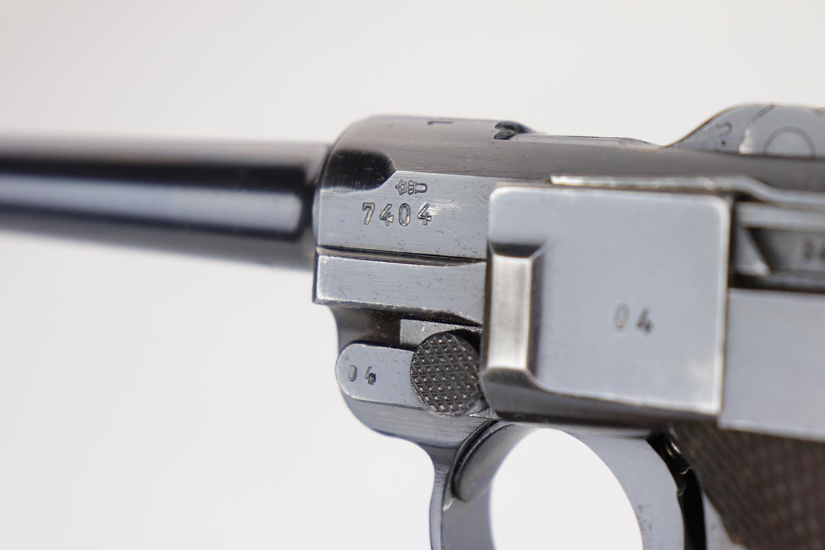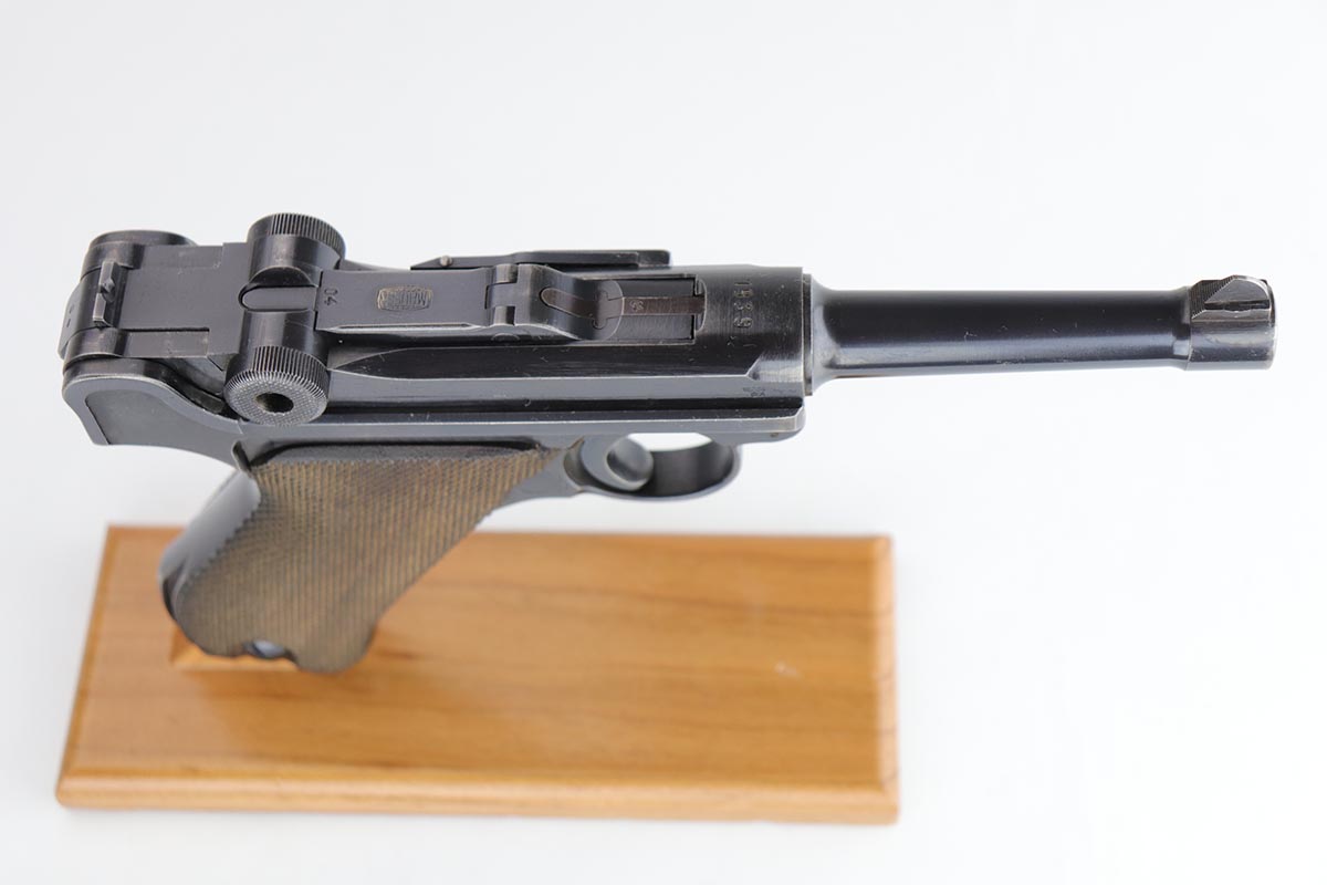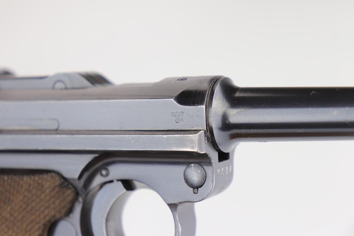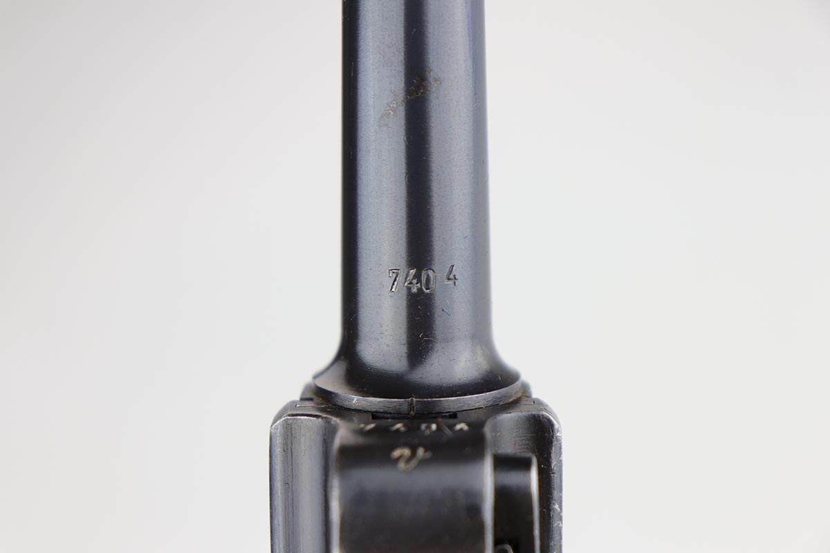 2/26/20 – This is a terrific example of a super rare Police Mauser Luger from 1939. It has Eagle over K marking on the right side of the receiver, which is the least common police marking for these Lugers. There were only about 1,100 ever produced, and only 850 with 1939 date. The pistol is all matching throughout, with 95-97% blue remaining. There’s standard high edge wear on muzzle, sideplate and stock lug. The magazine is period original but mismatched. The grips are not numbered, and have E/655 proofs. Strong, shiny bore.