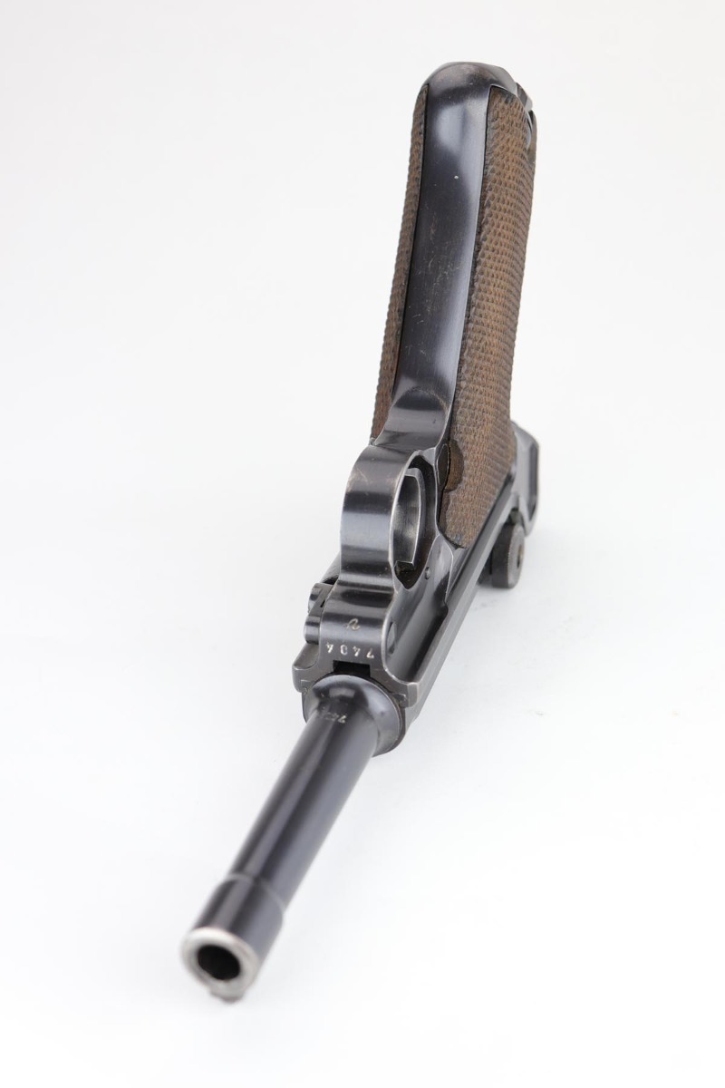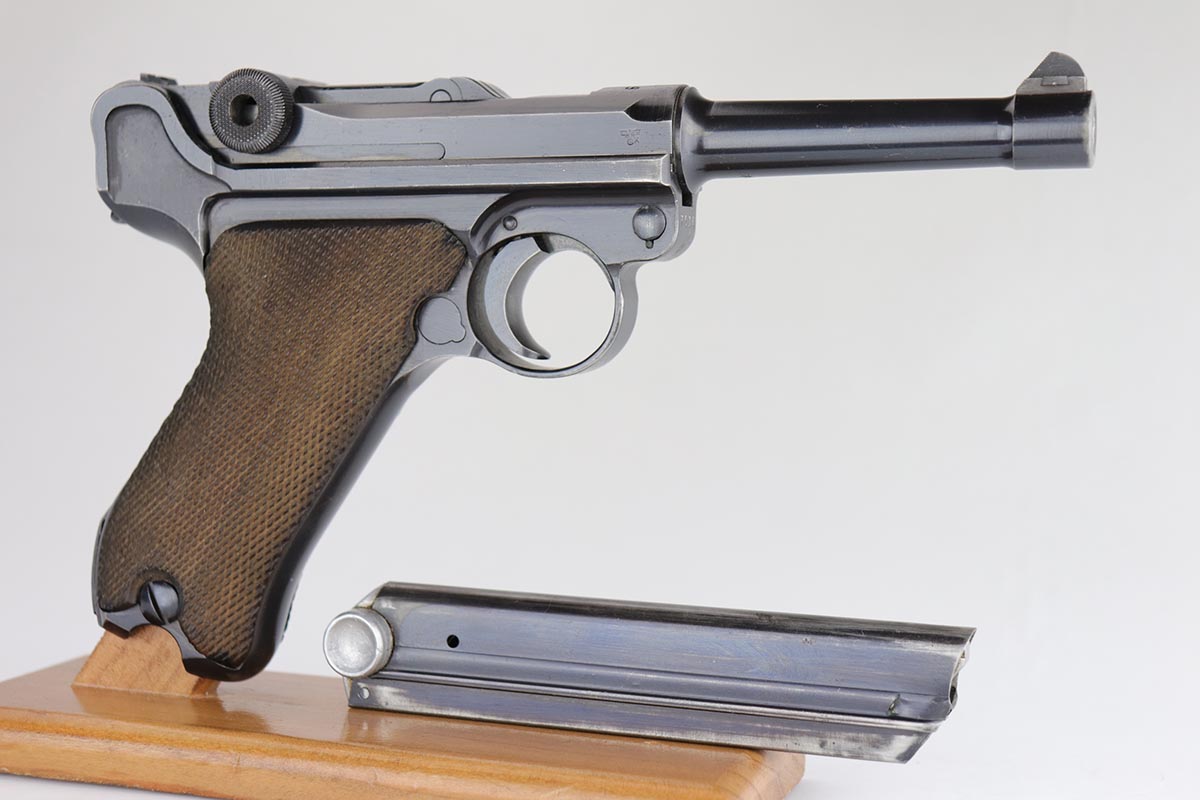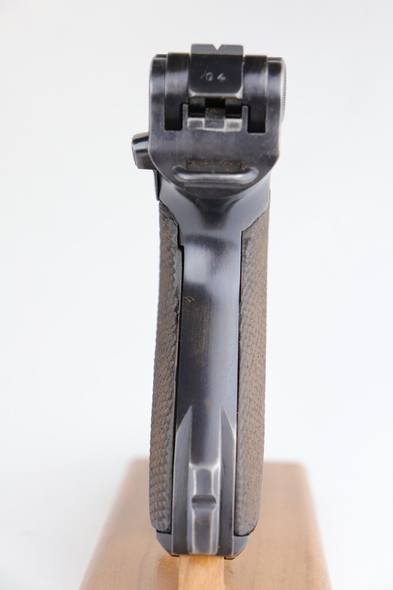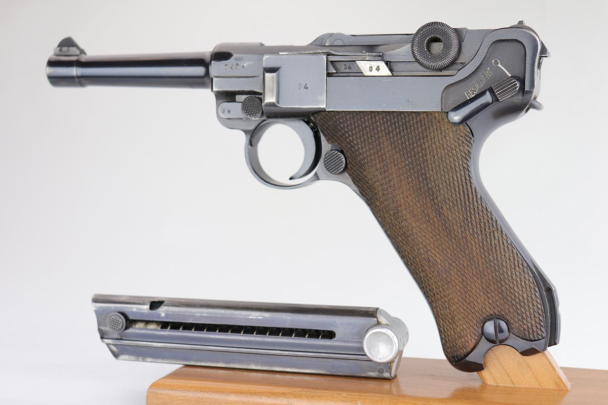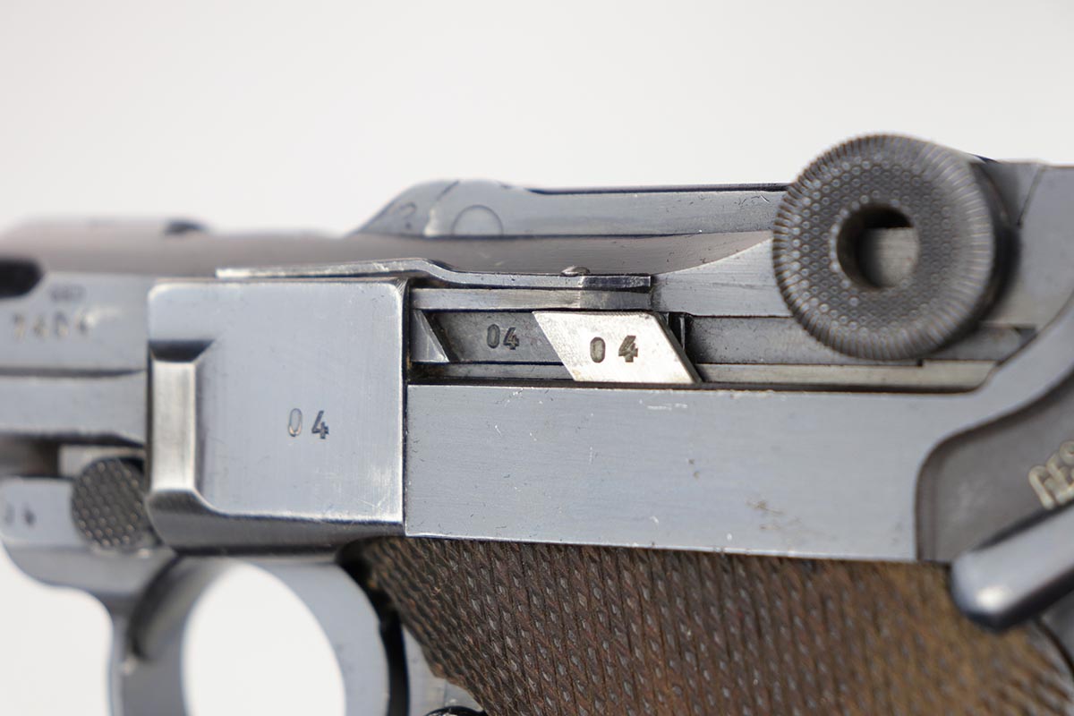 2/26/20 – This is a terrific example of a super rare Police Mauser Luger from 1939. It has Eagle over K marking on the right side of the receiver, which is the least common police marking for these Lugers. There were only about 1,100 ever produced, and only 850 with 1939 date. The pistol is all matching throughout, with 95-97% blue remaining. There’s standard high edge wear on muzzle, sideplate and stock lug. The magazine is period original but mismatched. The grips are not numbered, and have E/655 proofs. Strong, shiny bore.