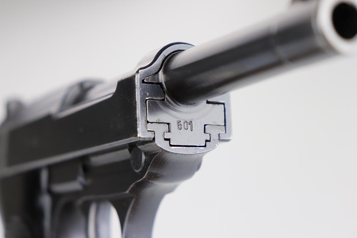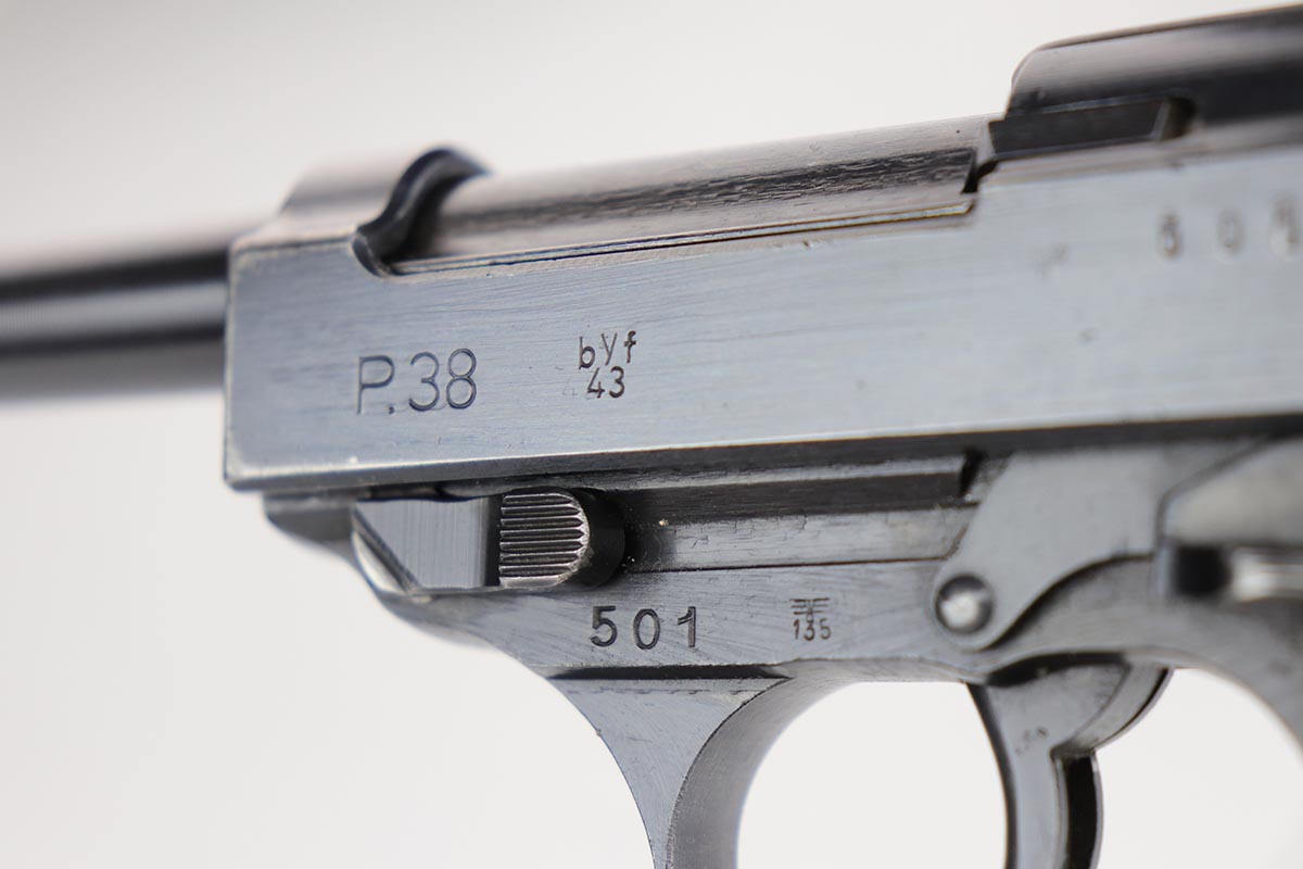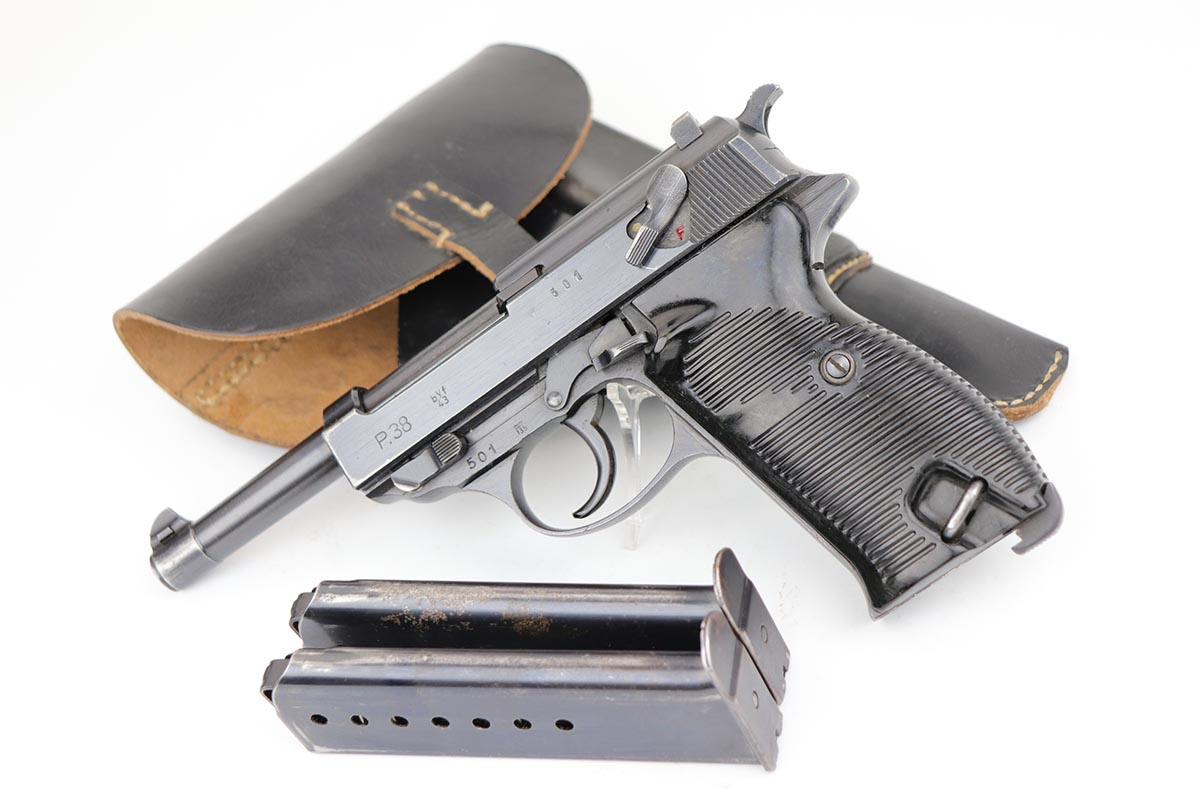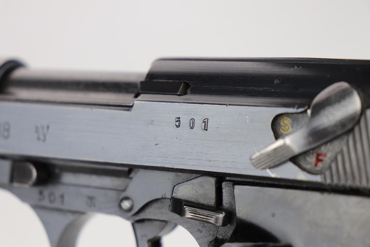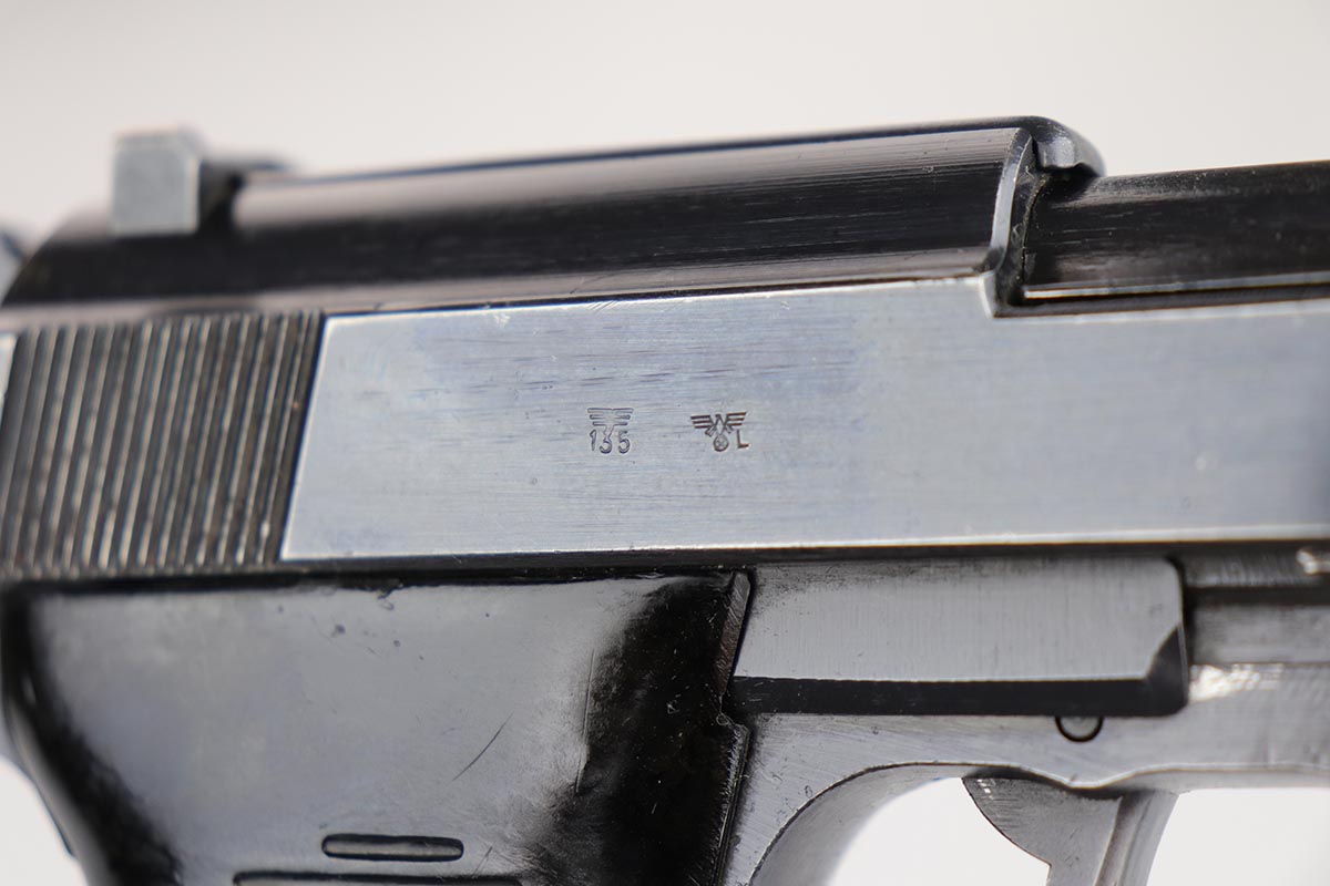 2/28/20 – This is a super rare Police Mauser P.38 rig that comes from the collection of Alex Krutzek, who wrote the book on P.38 pistols. There were only ~1,450 Police P.38s with ‘byf 43’ marked slides and Eagle/L proof. This is a variation 19b example, and there were only 550 of this specific variation produced as it also features E/135 acceptance stamps. The gun is all matching and original with only minor high edge wear on slide, muzzle and front strap. It’s in excellent condition overall, with a strong, shiny bore. Excellent grips. Walther magazine. Rig includes a spare magazine and an excellent police holster.