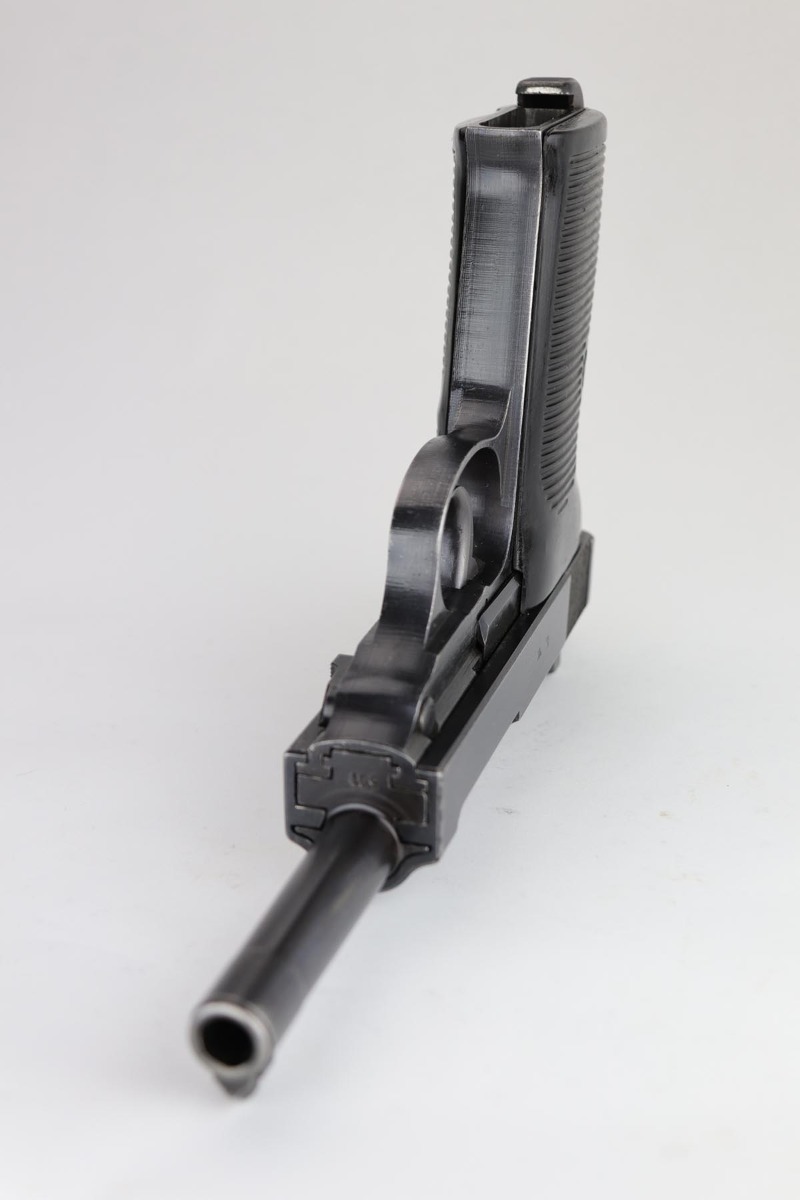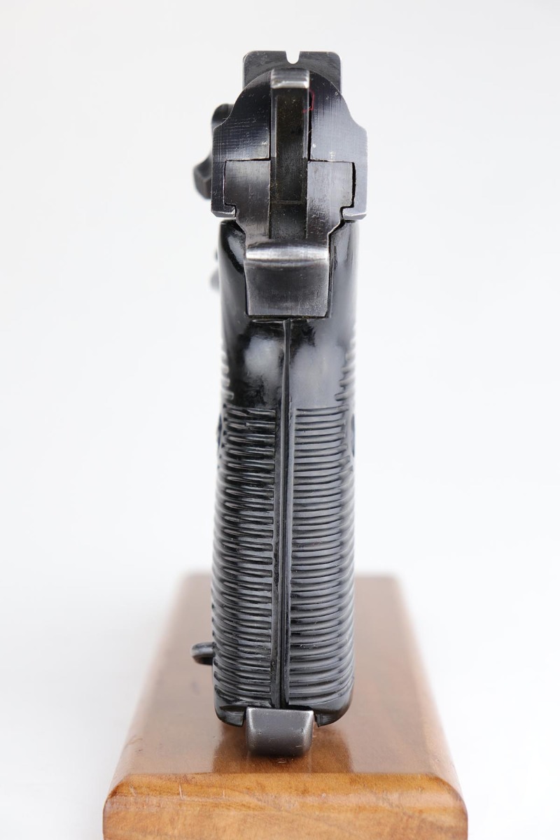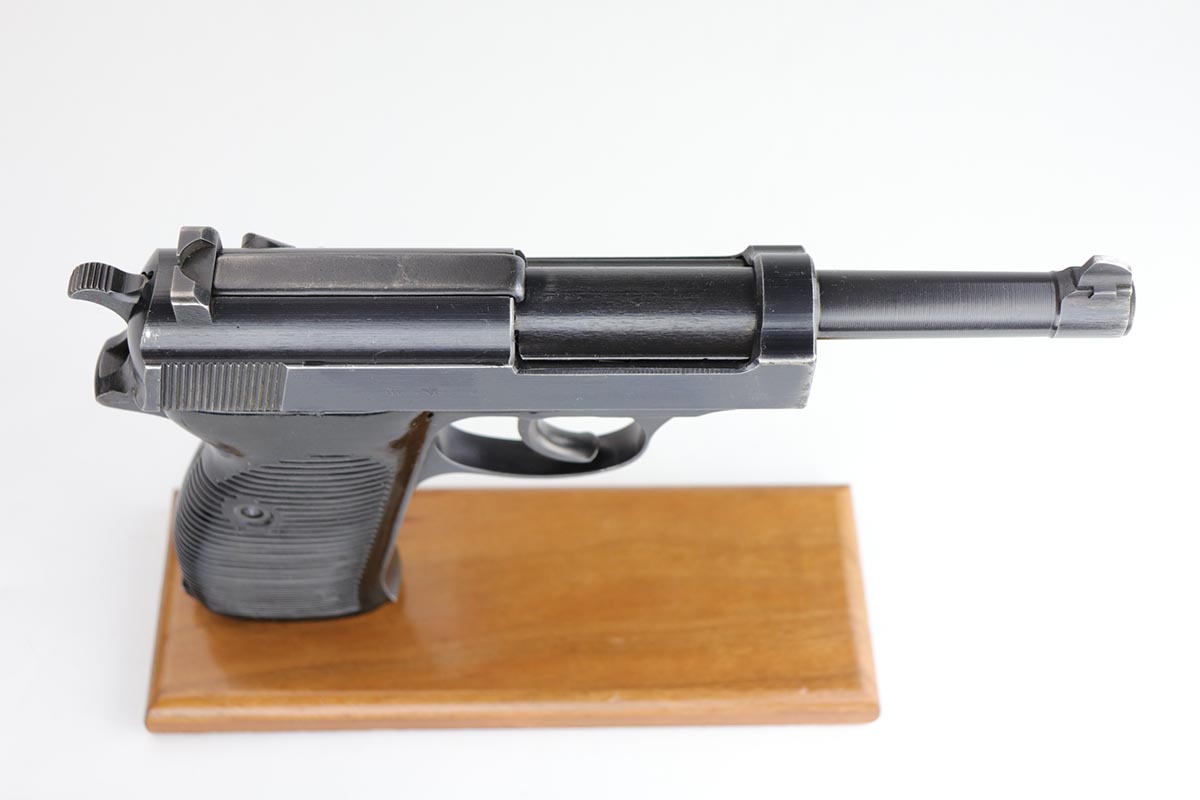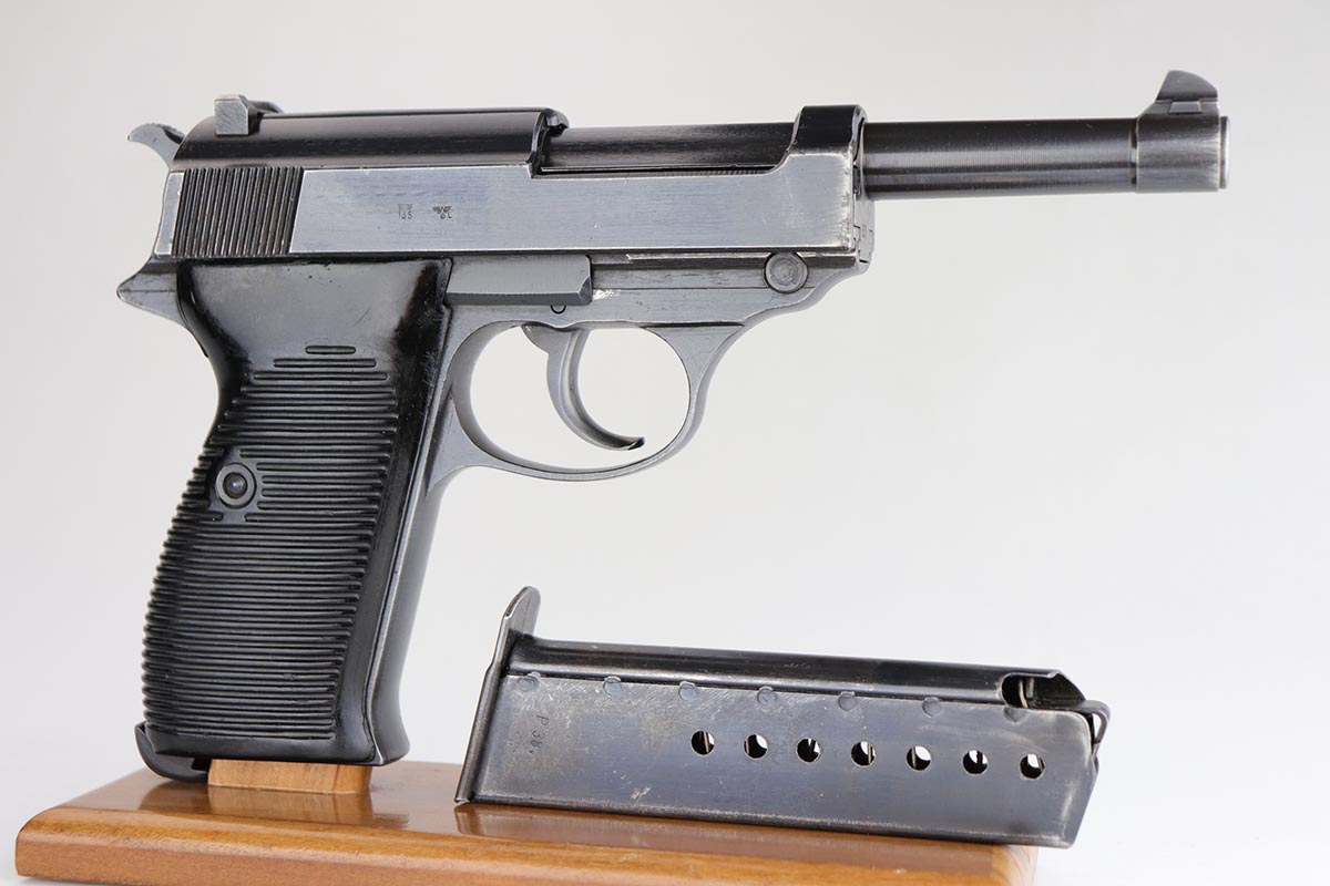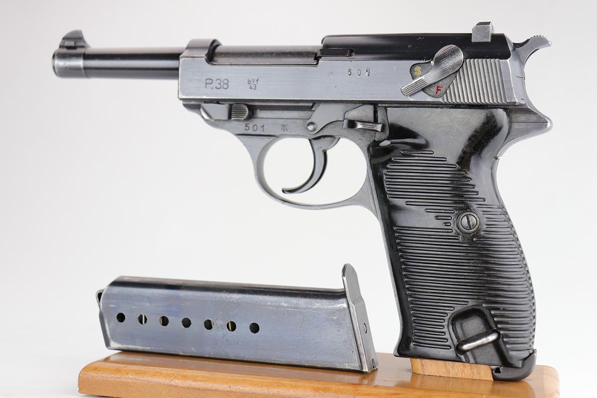 2/28/20 – This is a super rare Police Mauser P.38 rig that comes from the collection of Alex Krutzek, who wrote the book on P.38 pistols. There were only ~1,450 Police P.38s with ‘byf 43’ marked slides and Eagle/L proof. This is a variation 19b example, and there were only 550 of this specific variation produced as it also features E/135 acceptance stamps. The gun is all matching and original with only minor high edge wear on slide, muzzle and front strap. It’s in excellent condition overall, with a strong, shiny bore. Excellent grips. Walther magazine. Rig includes a spare magazine and an excellent police holster.