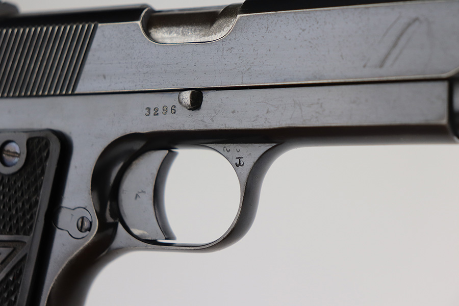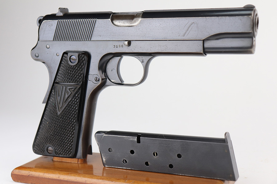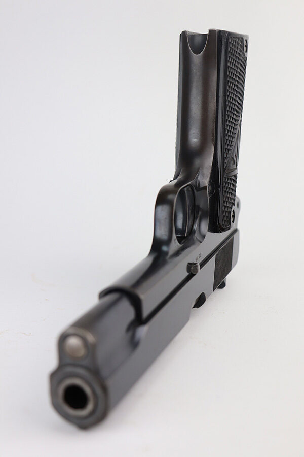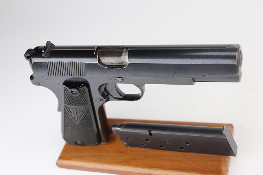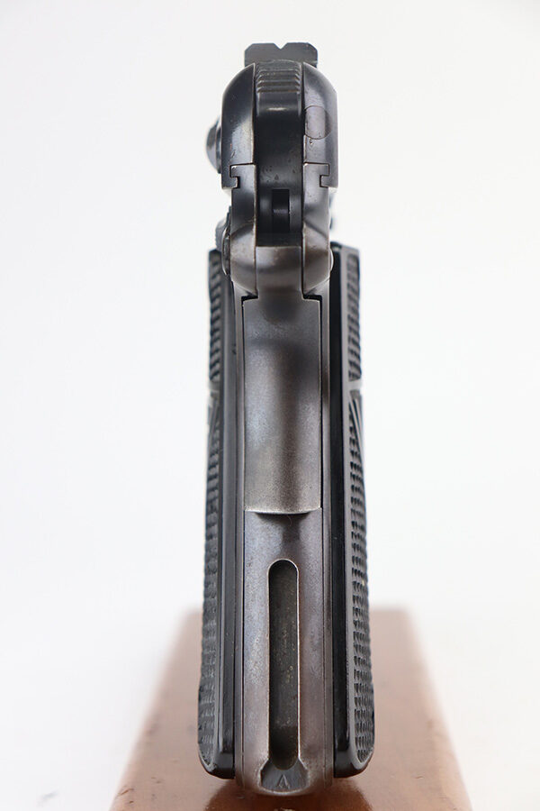 6/17/21 – This is a rare and highly desirable Polish Eagle Radom VIS P35 from 1936. There were only 5,500 of these Radom’s produced in 1936. It has the characteristic Polish eagle on the slide and “D2” proof on the trigger guard. The pistol is all matching and original with 85+% of the blue remaining. This one is a little tough to rate as there isn’t much actual bluing loss, but there’s patina on the front strap, and freckling all along the left side of the slide. It comes with excellent, original grips and a rare “G2”-proofed magazine. Bore has strong rifling but some freckling throughout.