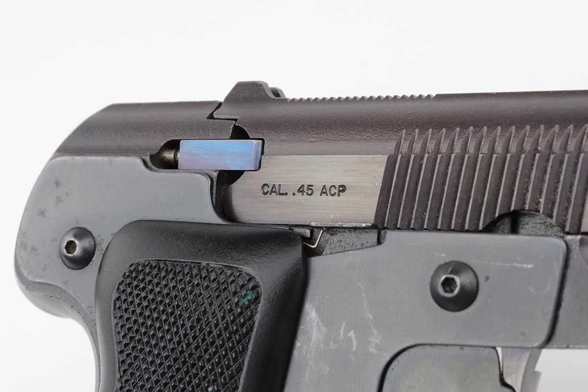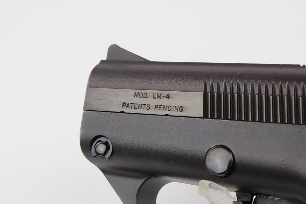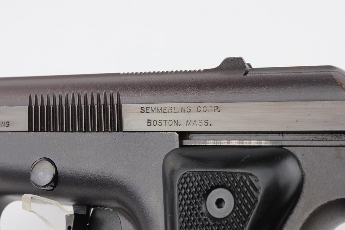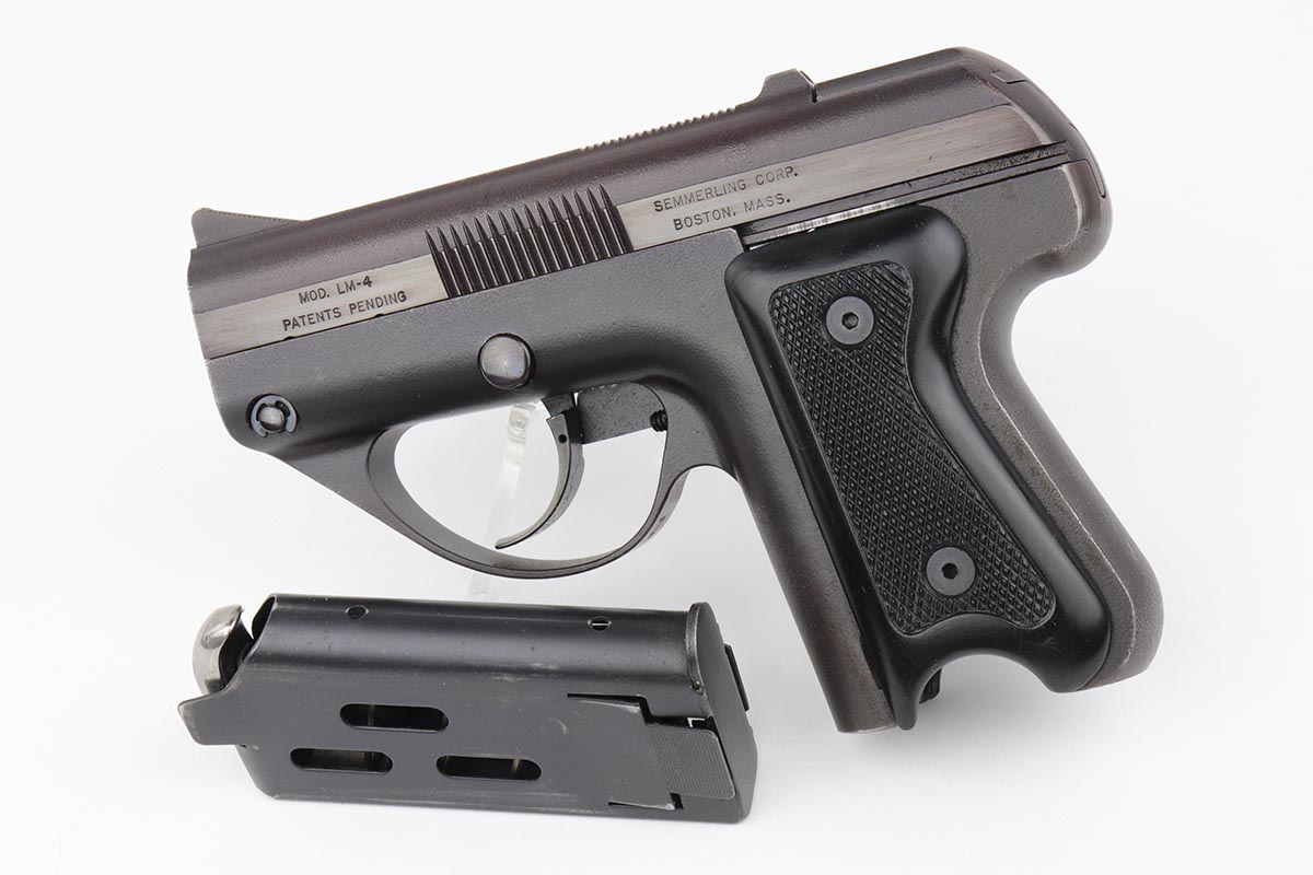 3/26/20 – This is a rare, original Semmerling LM-4 pistol with manually operated slide, chambered in the powerful .45 ACP. Built in the early 1980s and originally offered only to U.S. Army and government agencies, the Semmerling manual repeaters were and still are the world’s smallest and most powerful multi-shot pistols ever offered. The Semmerling LM-4 had only 33 parts and was offered as an amazing combination of stopping power, reliability and ease of concealment. Fully loaded with five rounds, the compact Semmerling LM-4 pistol weighed less than 20 ounces. Ingenious mechanism required manually cycling the barrel forward together with the slide to eject the fired case, then backward to feed another cartridge into the chamber. Each Semmerling pistol was Magnafluxed twice to detect any hidden metallurgical flaws. About 600 Semmerling LM-4 pistols were manufactured in the early 80s and now are highly collectible. This example is all original with about 97% of its finish intact, with just some minor spotting on the right side of the tang and some minimal holster wear on the straps. It does not appear that the gun was shot much at all.