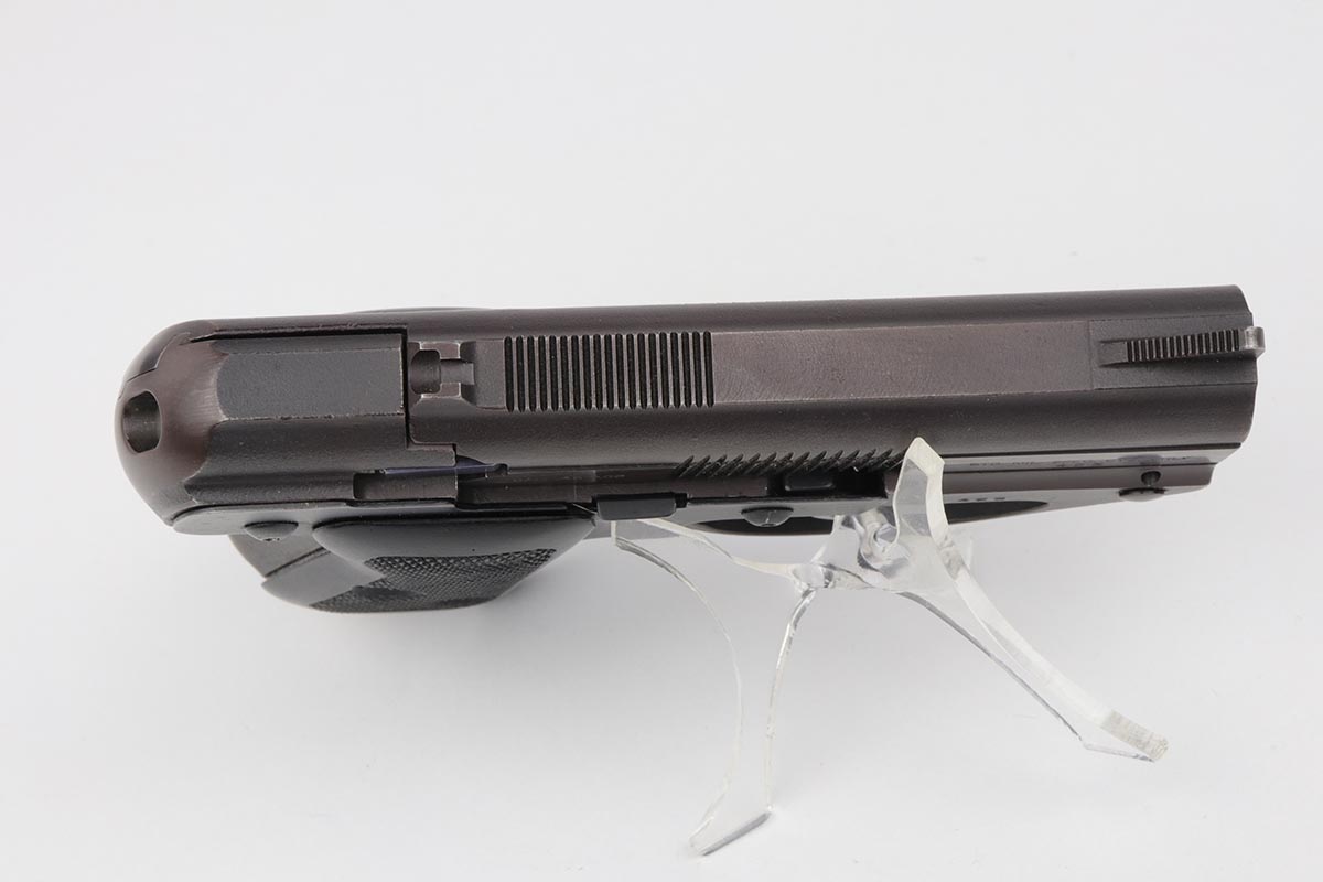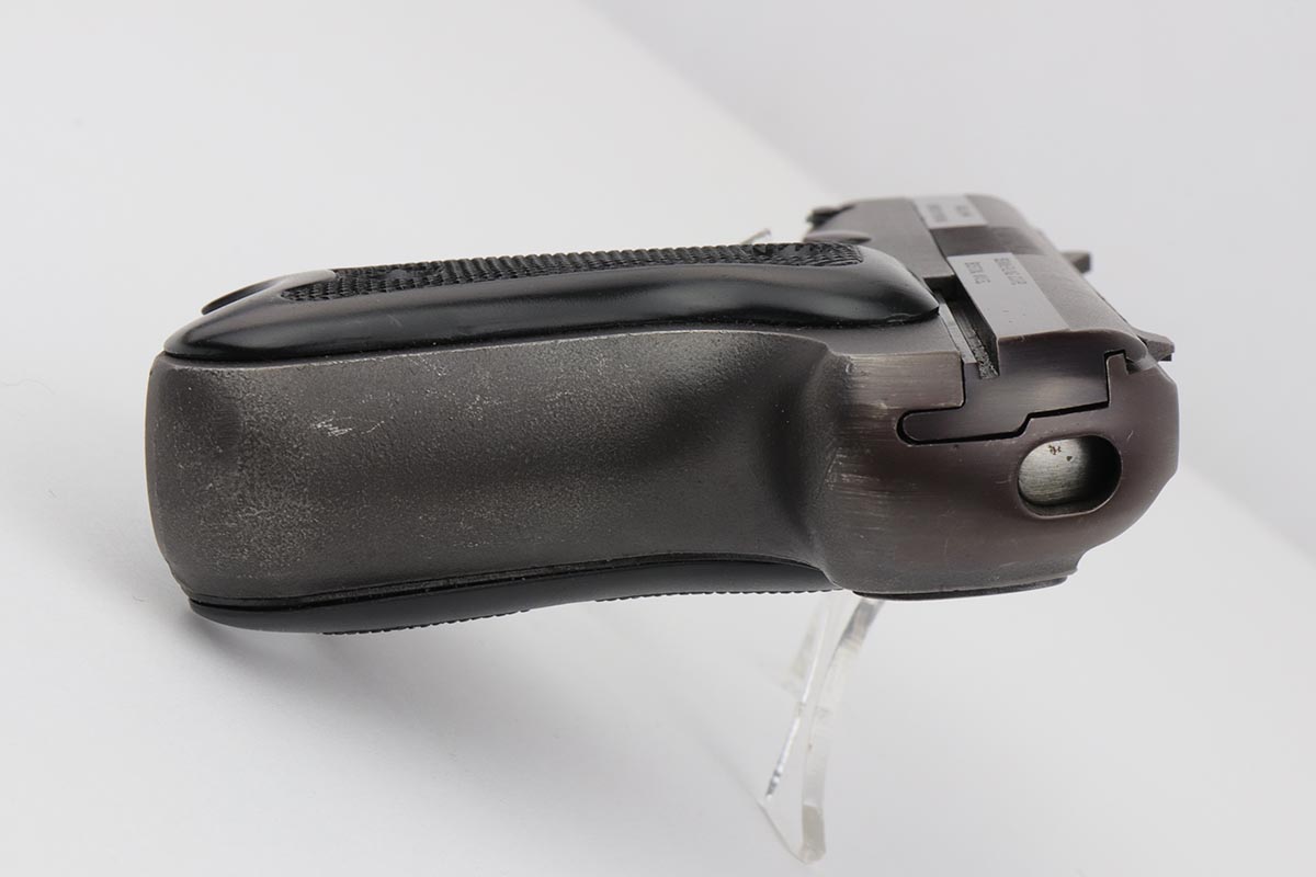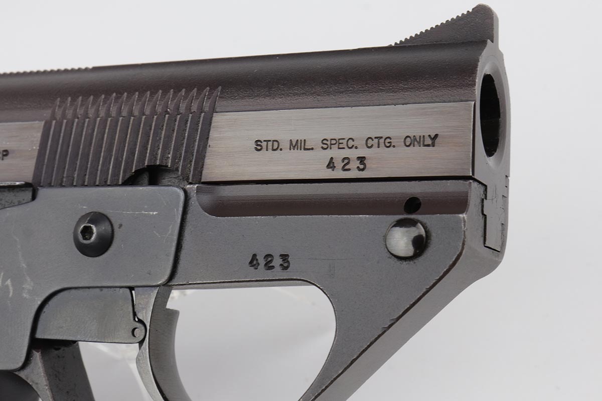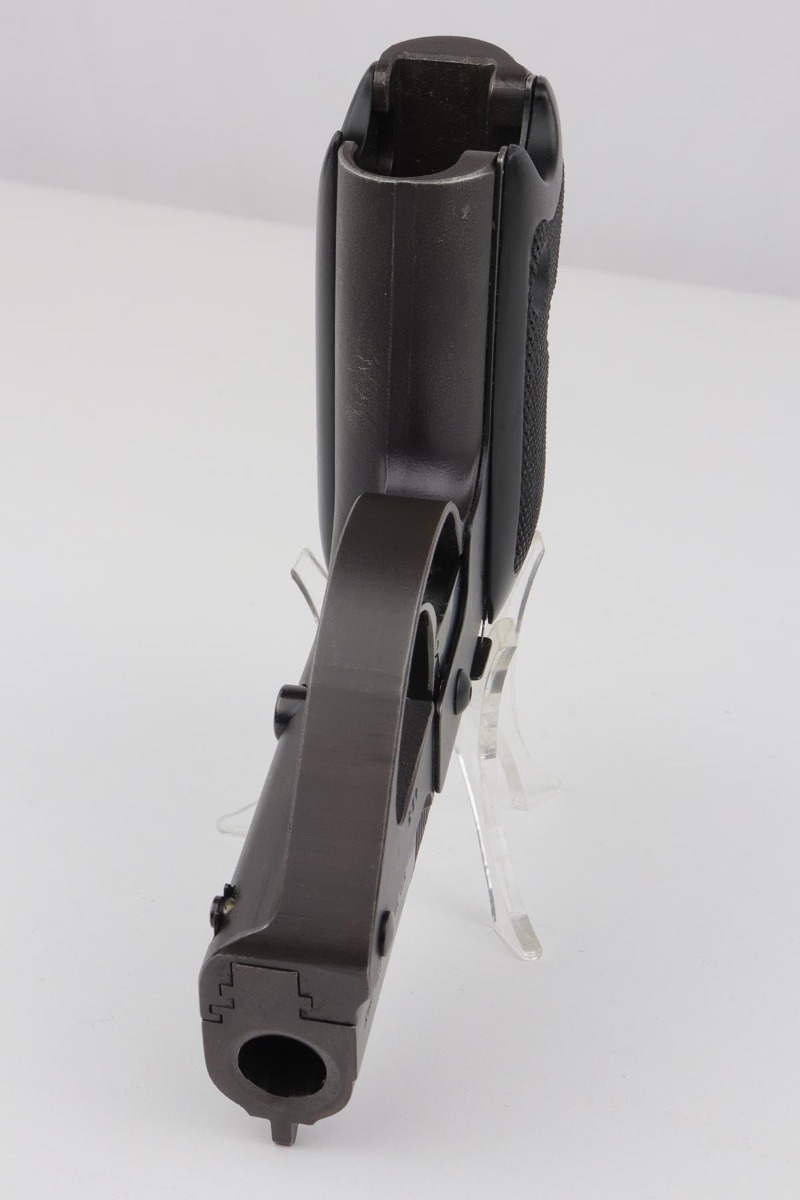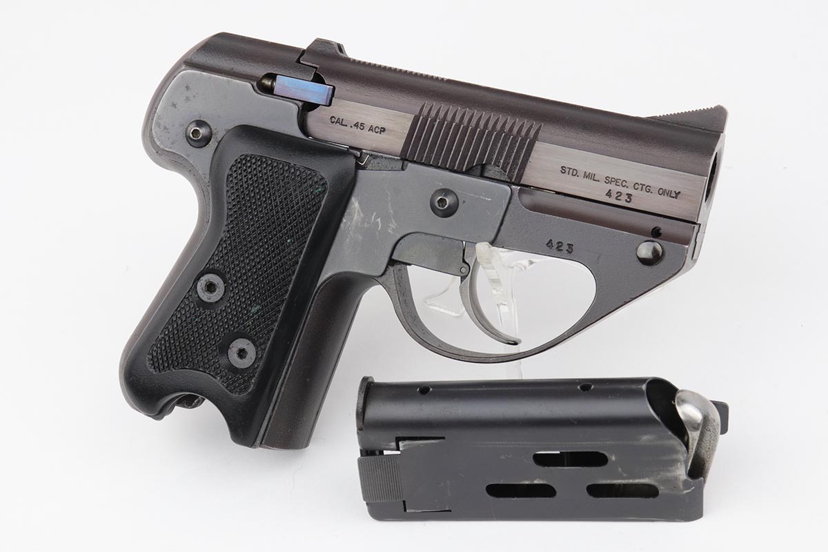 3/26/20 – This is a rare, original Semmerling LM-4 pistol with manually operated slide, chambered in the powerful .45 ACP. Built in the early 1980s and originally offered only to U.S. Army and government agencies, the Semmerling manual repeaters were and still are the world’s smallest and most powerful multi-shot pistols ever offered. The Semmerling LM-4 had only 33 parts and was offered as an amazing combination of stopping power, reliability and ease of concealment. Fully loaded with five rounds, the compact Semmerling LM-4 pistol weighed less than 20 ounces. Ingenious mechanism required manually cycling the barrel forward together with the slide to eject the fired case, then backward to feed another cartridge into the chamber. Each Semmerling pistol was Magnafluxed twice to detect any hidden metallurgical flaws. About 600 Semmerling LM-4 pistols were manufactured in the early 80s and now are highly collectible. This example is all original with about 97% of its finish intact, with just some minor spotting on the right side of the tang and some minimal holster wear on the straps. It does not appear that the gun was shot much at all.