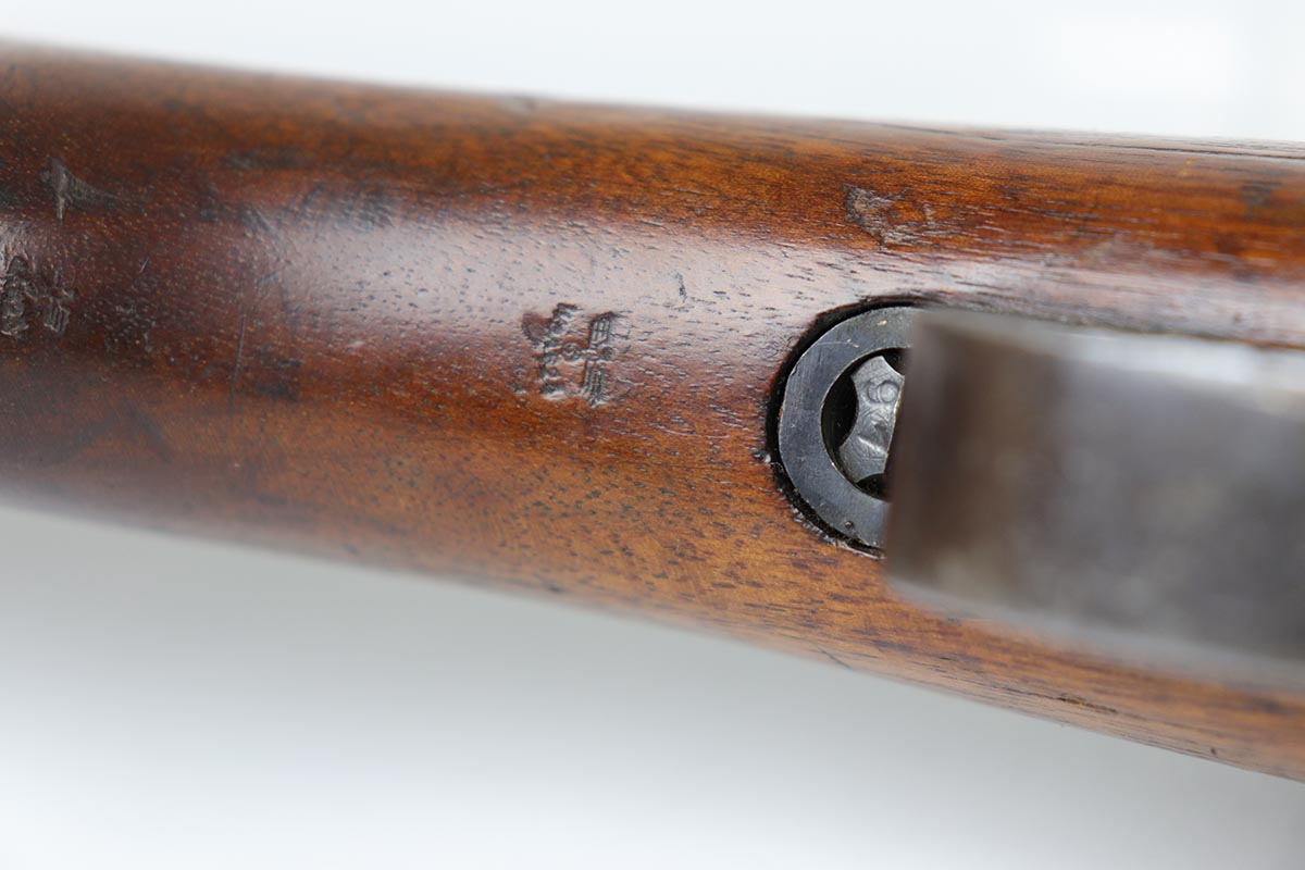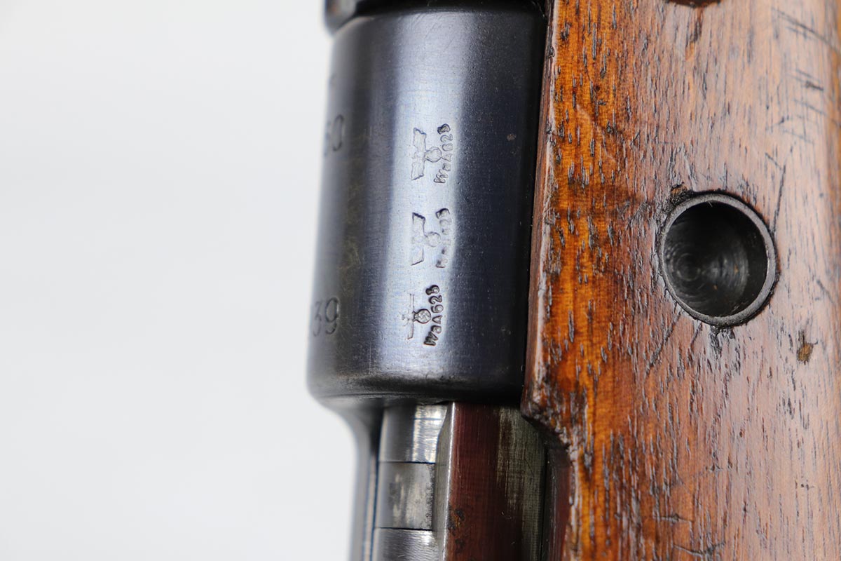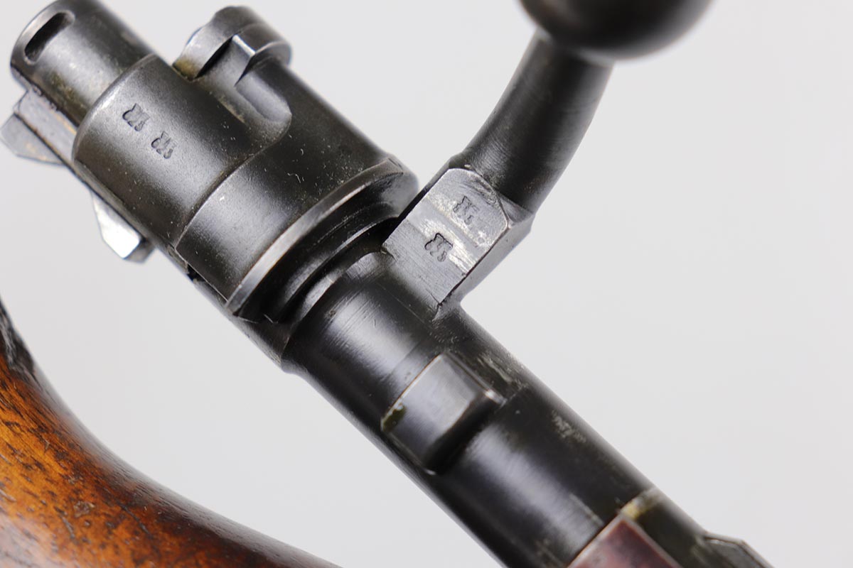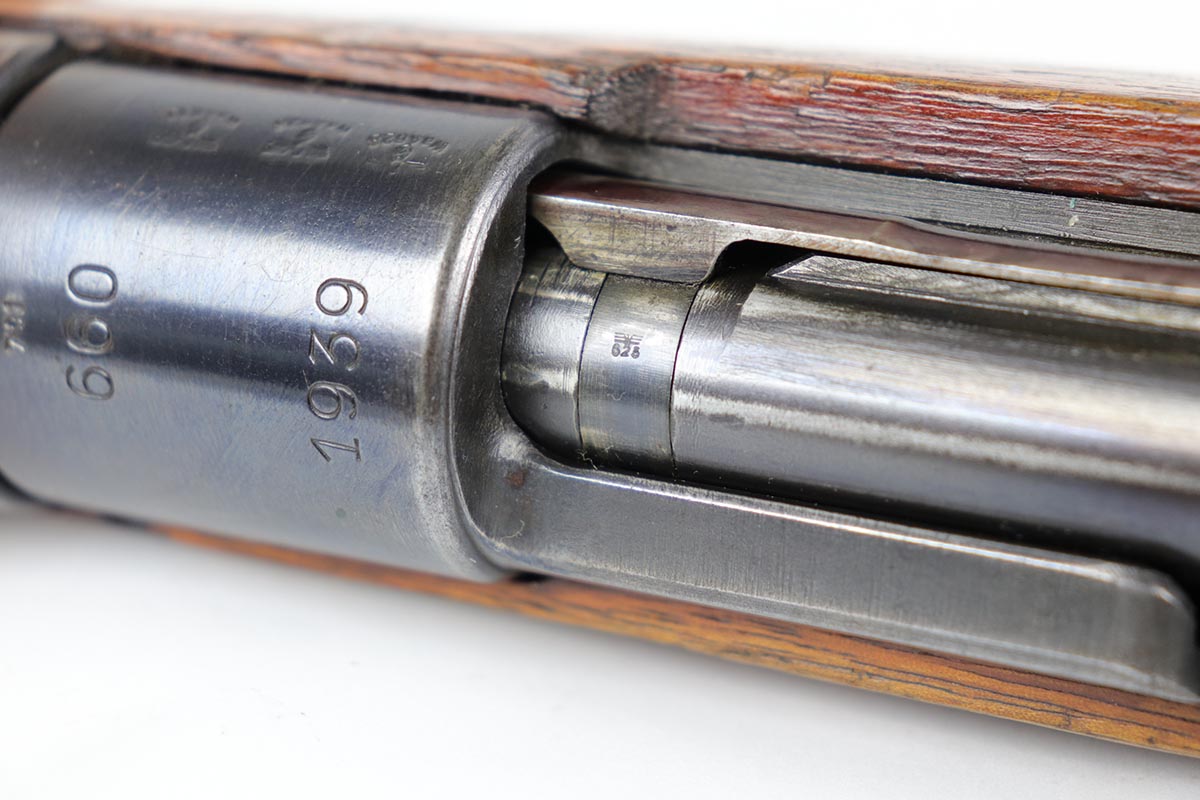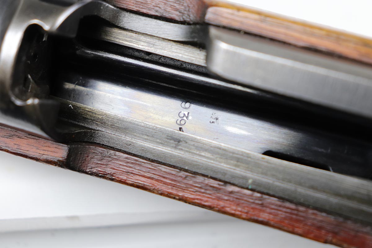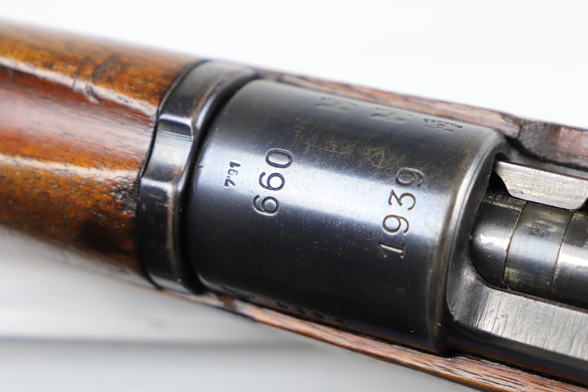 5/25/20 – This is an ultra rare and desirable Steyr G.12/34 that was made in 1939 as part of a Luftwaffe contract order by Hermann Goring. These rifles were part of a contract of Steyr Solothurn Colombian M12/34 rifles that was being manufactured at Steyr when the 1938 annexation of Austria occurred. These rifles are erroneously called the G.29O by collectors today, but Steyr documents called in the Luftwaffe Karabiner G12/34. The Luftwaffe, in desperate need of small arms, immediately took over the production and the rifle was modified as much as possible to the standard 98k Rifle configuration. This rifle has all original and matching parts, including the stock, buttplate, trigger assembly, bolt assembly, front bands, receiver, etc. Finish on the receiver is very nice but the bands and forward portion of the barrel show notable thinning. The stock has various dings throughout, and one notable chip on the wrist, but no cracks. Sharp waffenamts can be found all over the stock and receiver, with Steyr E/623 proofs found on all parts. Fantastic bore.
