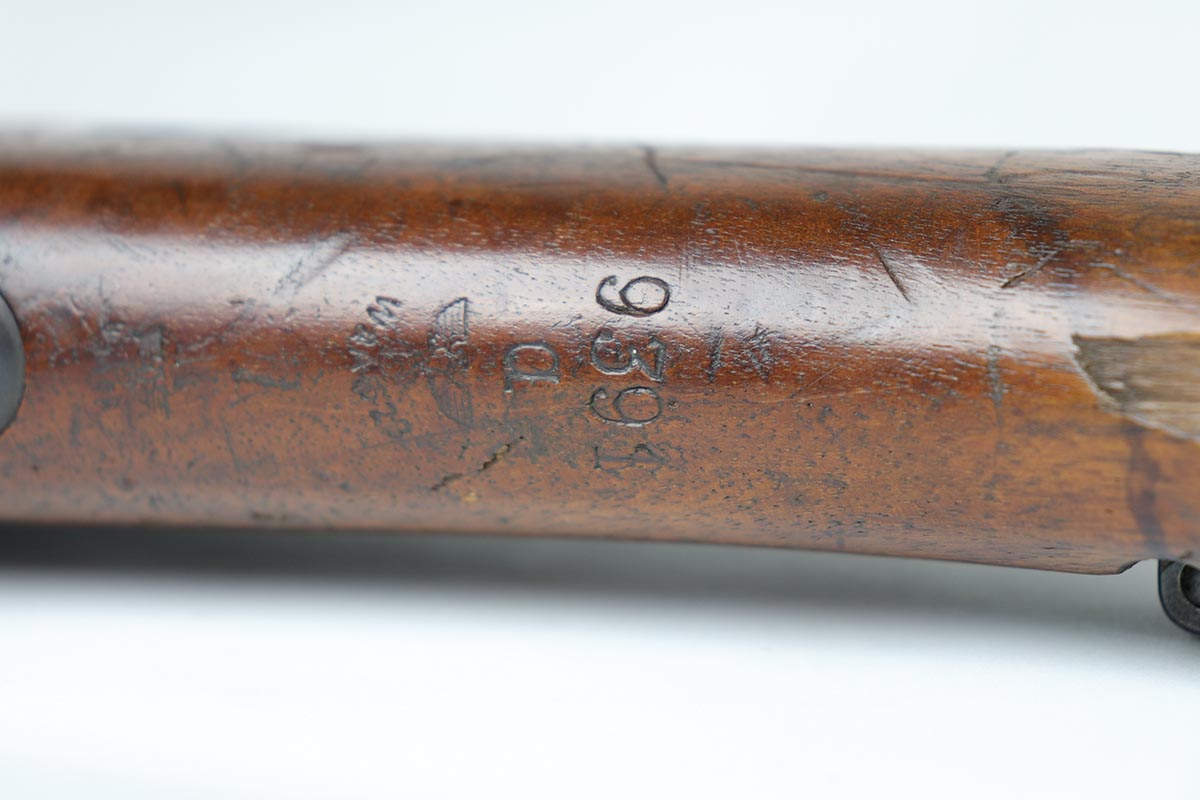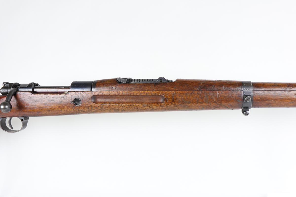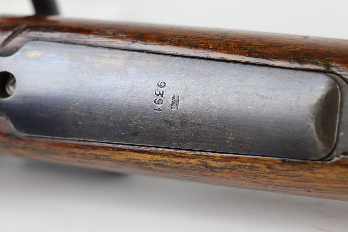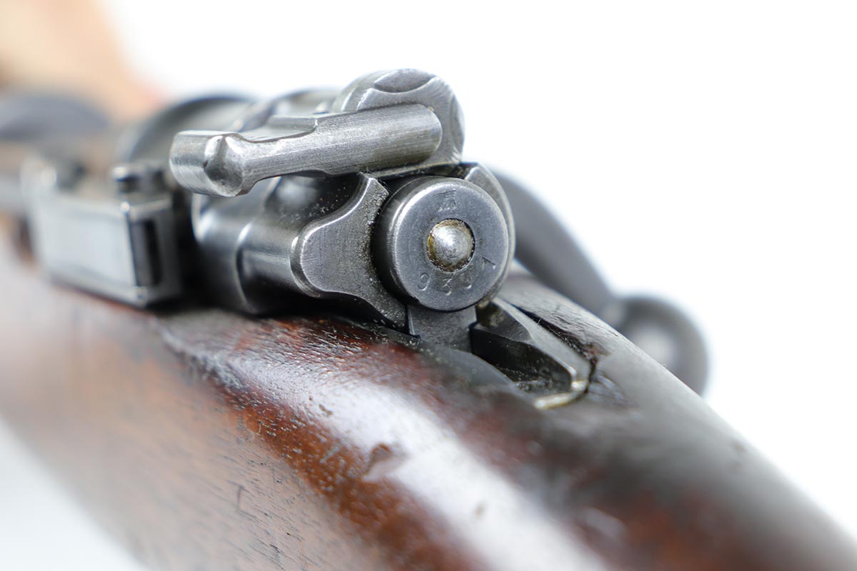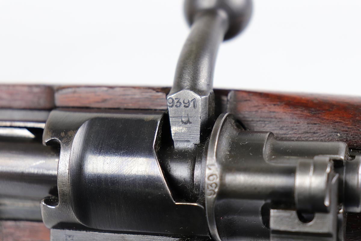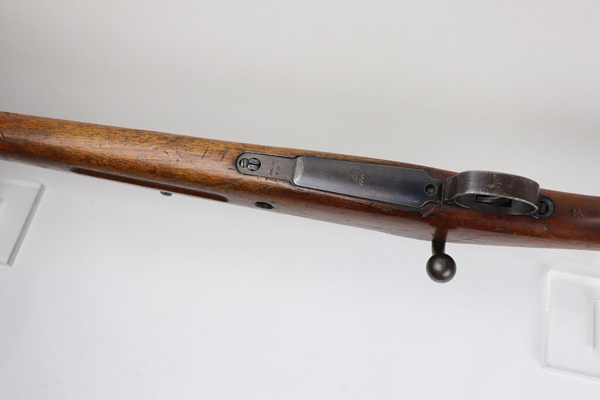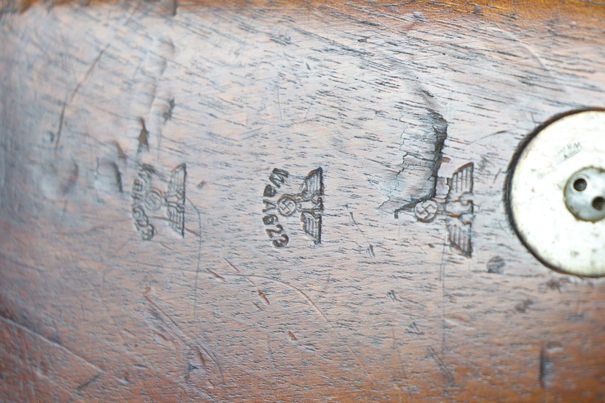 5/25/20 – This is an ultra rare and desirable Steyr G.12/34 that was made in 1939 as part of a Luftwaffe contract order by Hermann Goring. These rifles were part of a contract of Steyr Solothurn Colombian M12/34 rifles that was being manufactured at Steyr when the 1938 annexation of Austria occurred. These rifles are erroneously called the G.29O by collectors today, but Steyr documents called in the Luftwaffe Karabiner G12/34. The Luftwaffe, in desperate need of small arms, immediately took over the production and the rifle was modified as much as possible to the standard 98k Rifle configuration. This rifle has all original and matching parts, including the stock, buttplate, trigger assembly, bolt assembly, front bands, receiver, etc. Finish on the receiver is very nice but the bands and forward portion of the barrel show notable thinning. The stock has various dings throughout, and one notable chip on the wrist, but no cracks. Sharp waffenamts can be found all over the stock and receiver, with Steyr E/623 proofs found on all parts. Fantastic bore.