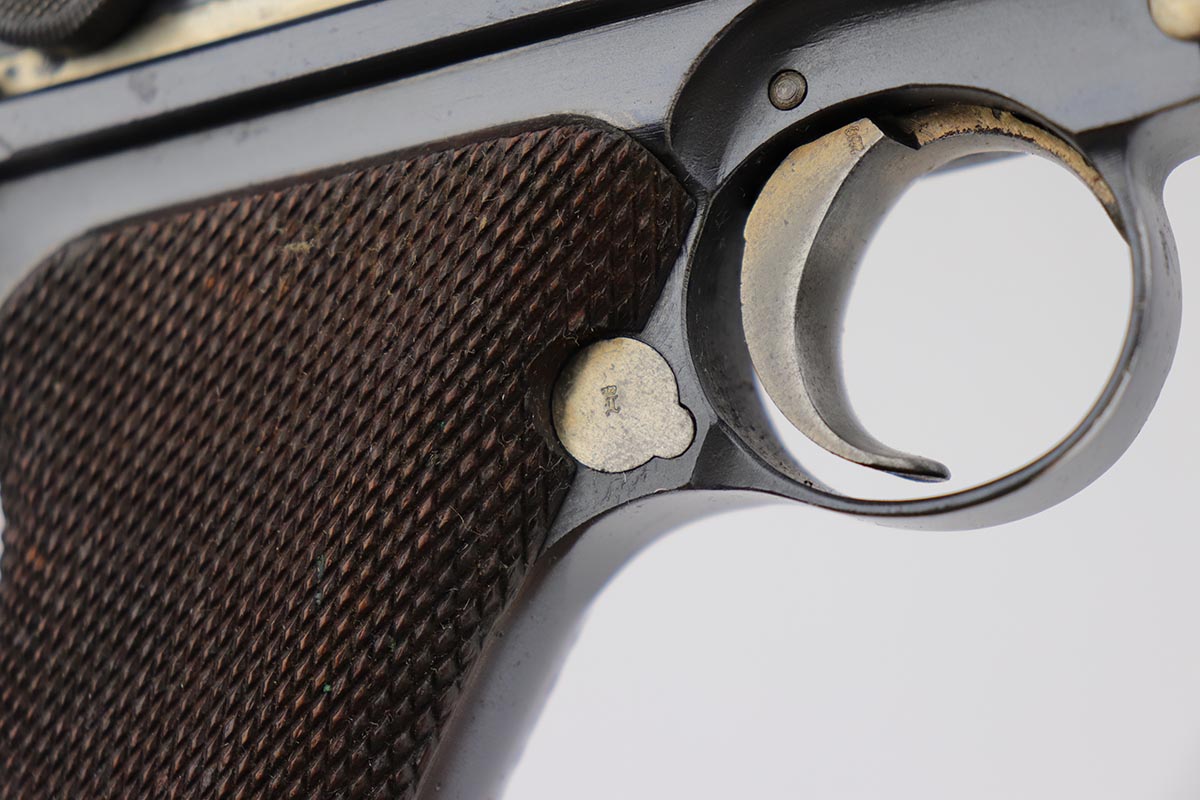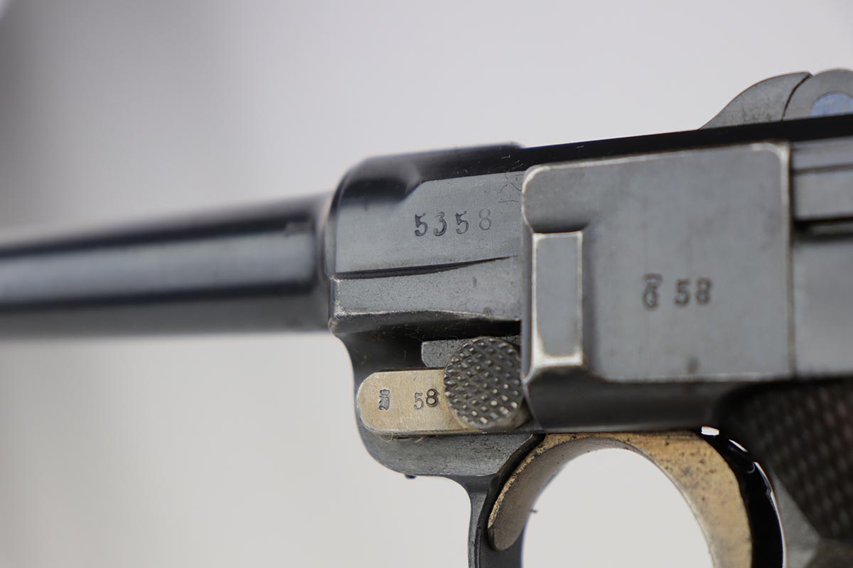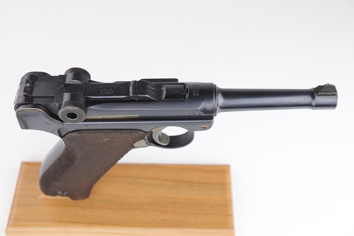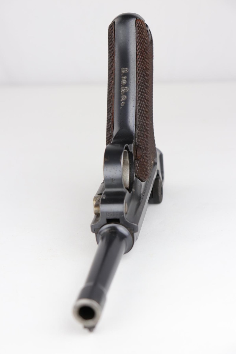 7/11/19 – This is an exceptional 1912 dated Erfurt made luger in 96-97% original condition, all matching with one matching mag and a rare Reichsrevolver conversion holster. The gun is all original and shows just a touch of holster wear on the high points with some minimal spotting on the grip straps. It is all matching, including one magazine and is unit marked to a Bavarian Infantry regiment on the front grip strap. Excellent grips and bore. All the markings and Imperial proofs and acceptance marks are sharp. The holster is a rarely seen Reichsrevolver conversion in fantastic condition, dated 1910 and unit marked as well. The extra magazine is not matching to the gun but is correct for the era. Finally, the rig comes with capture papers, making it ever more desirable collector piece. This early pre-WWI Luger would be very difficult to upgrade.
