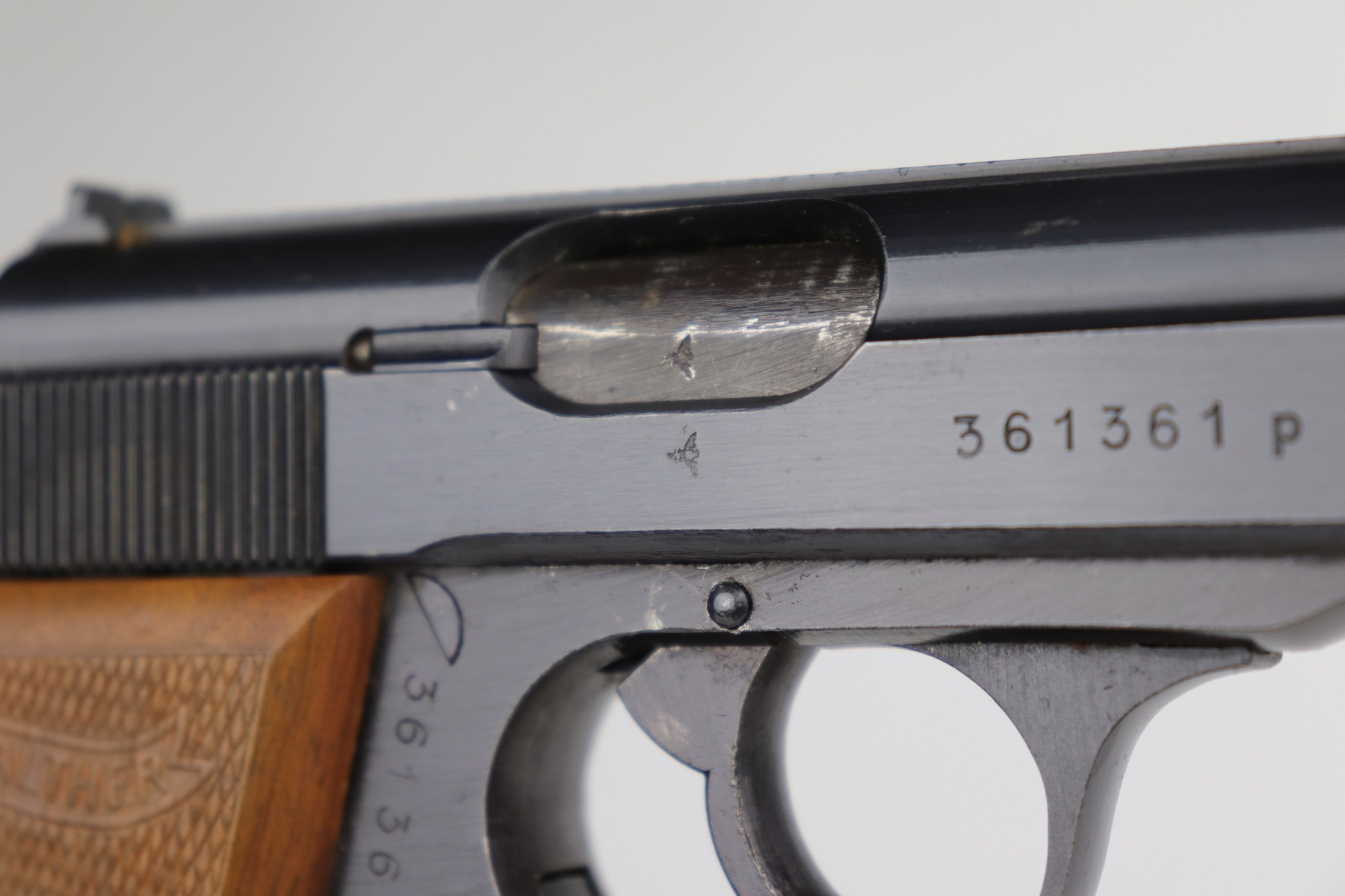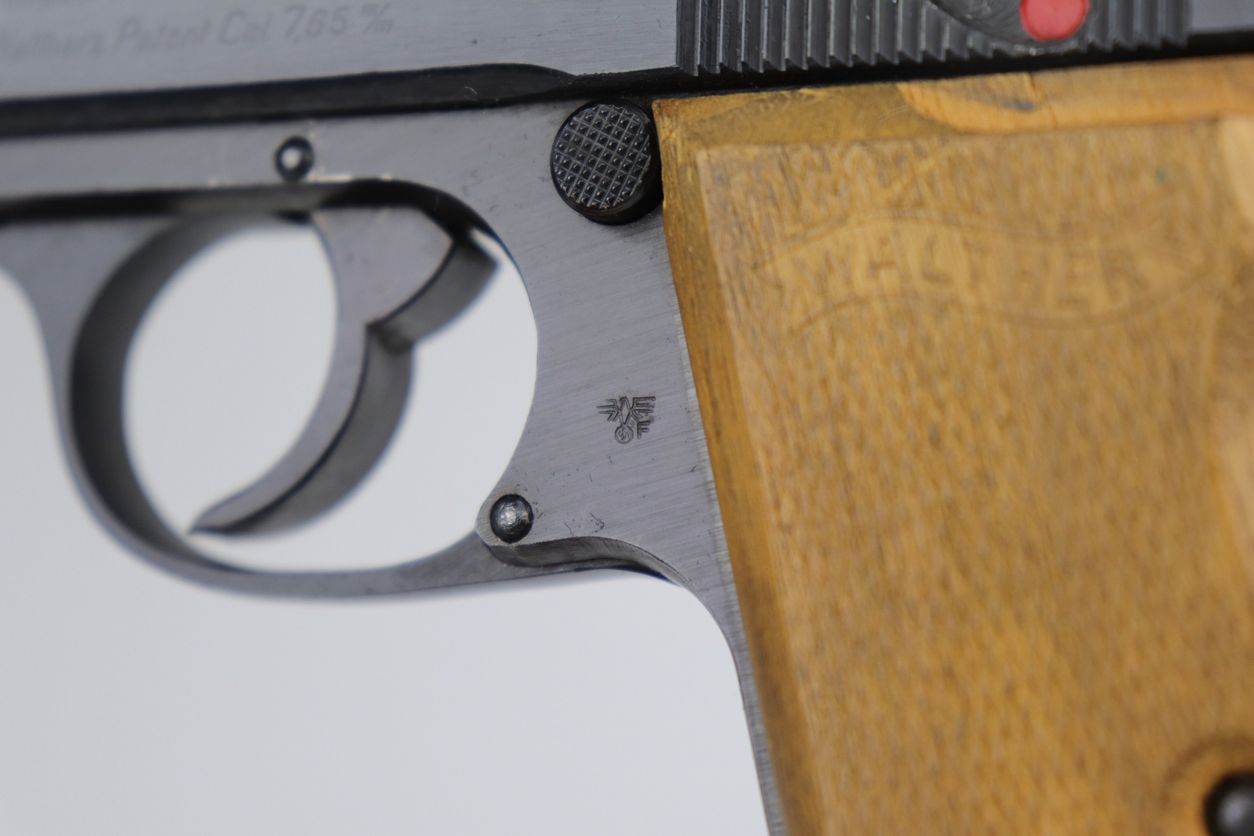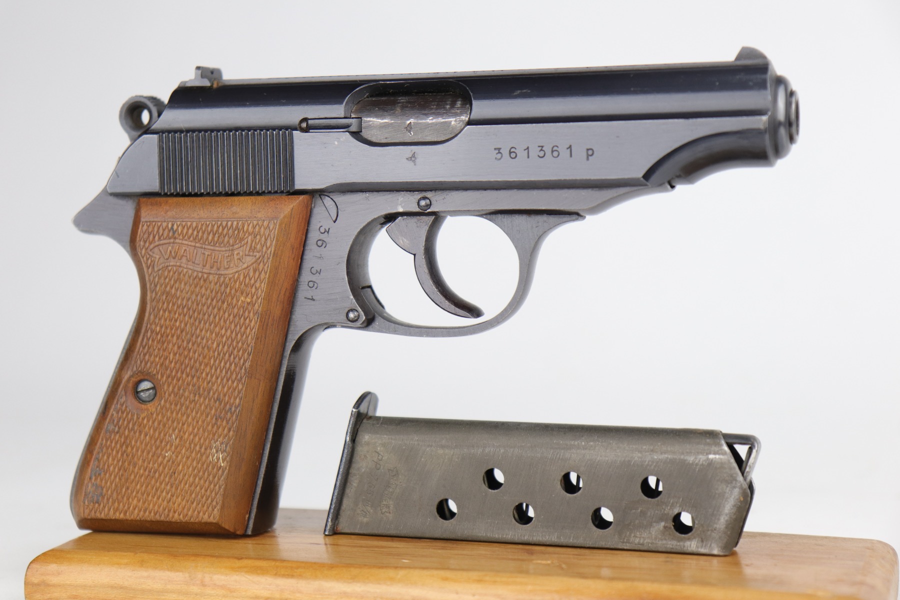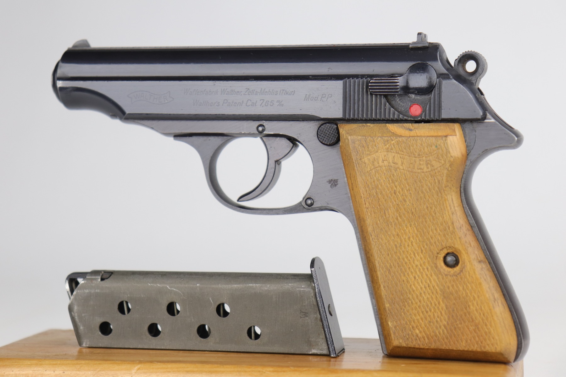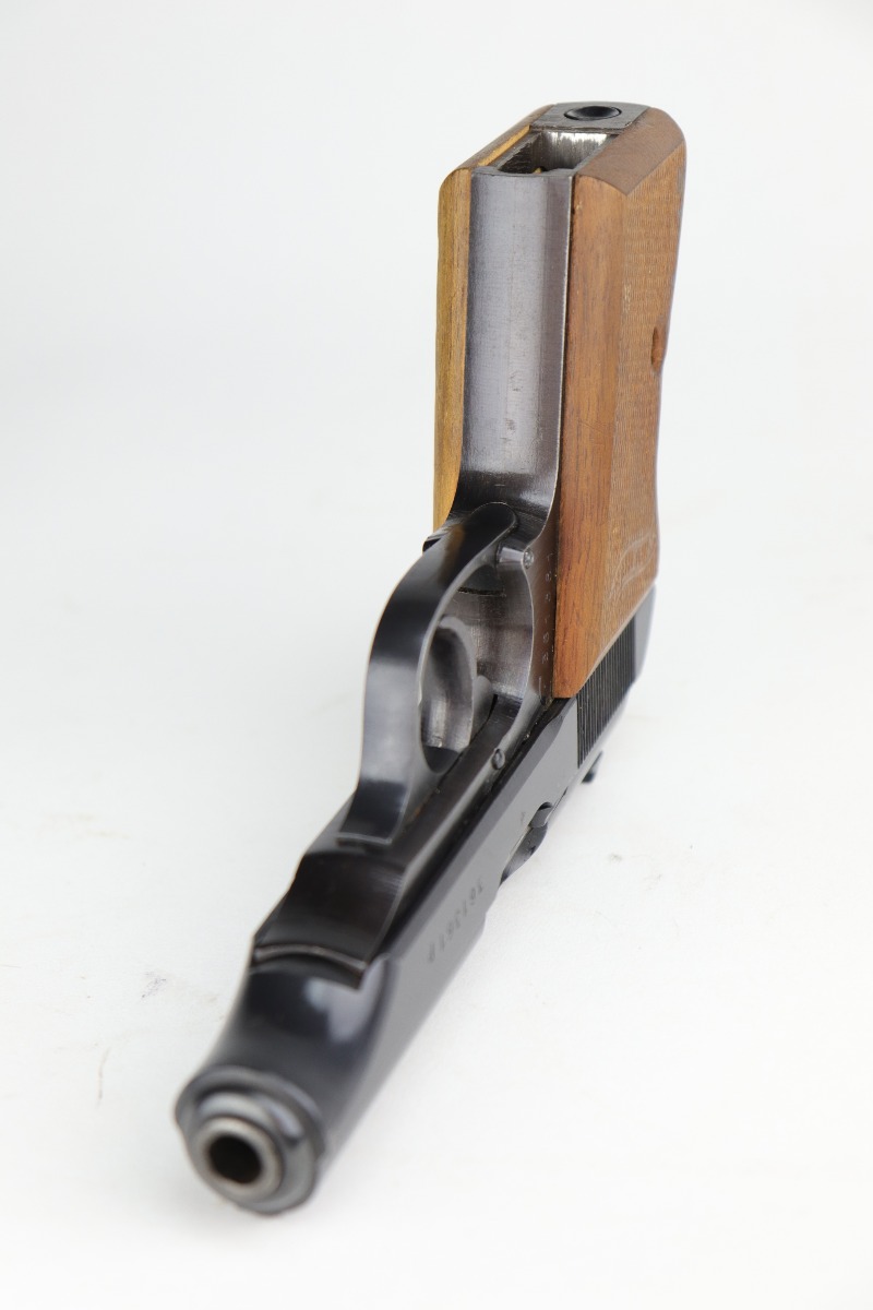 10/6/20 – This is a stone-mint example of a Walther PP issued to the Nazi Police force in 1944. It is all matching and has a police “Eagle F” marking on the trigger guard. The gun is in mint condition. The only sign of wear is a few very small surface marks here and there. Very minor wear on the high edge of the tang. Mint late-war wood grips. It comes with a scarce late-war “W” marked magazine. The bore is stone-mint. Gorgeous gun.