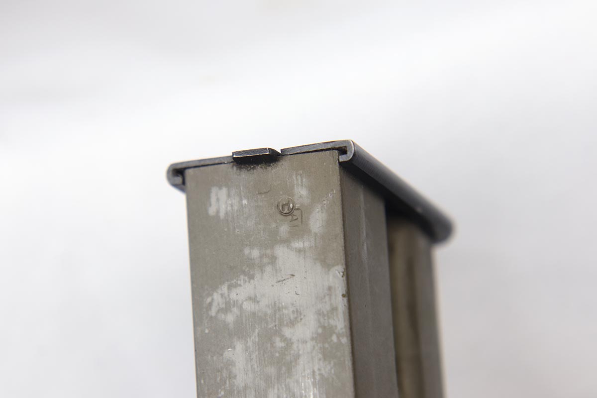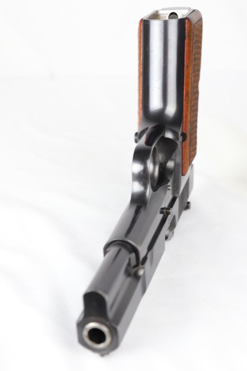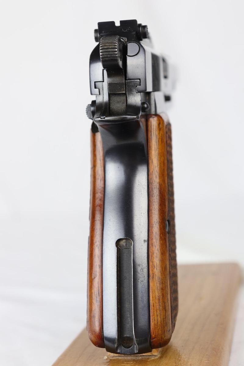 10/15/18 – This is an excellent example of an early pre-war Belgian High Power pistol with Belgian military proofs. These pistols were manufactured by Fabrique Nationale in Herstal, Belgium, prior to the start of any hostilities in Europe. This gun is all matching and original with brilliant 98+% high-polish blue remaining, showing only minor muzzle wear on each side of the slide and the lightest of high-edge wear elsewhere. Fantastic early grips with the red paint inside. Tanget sight with stock slot in frame. Terrific bore.