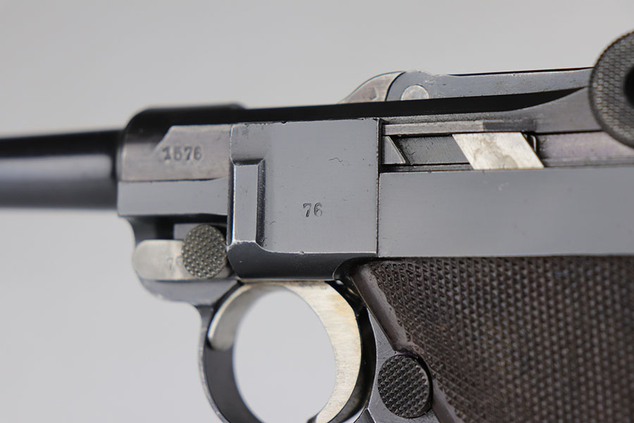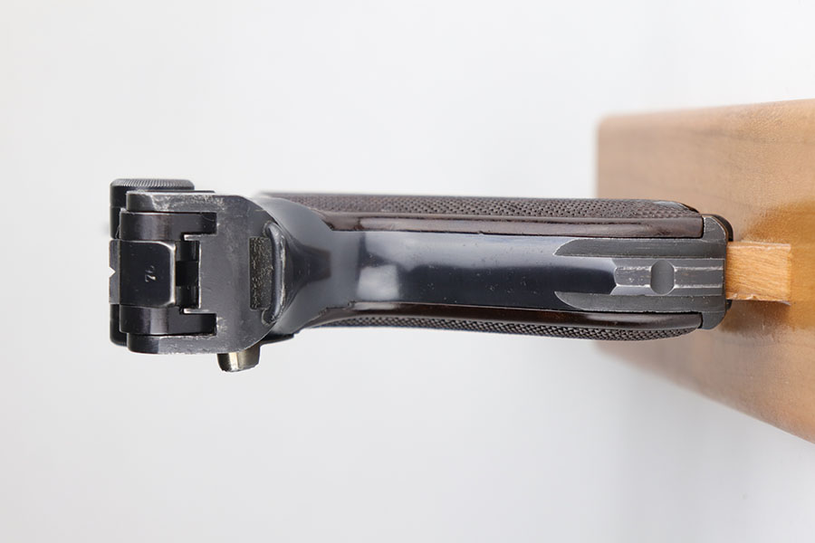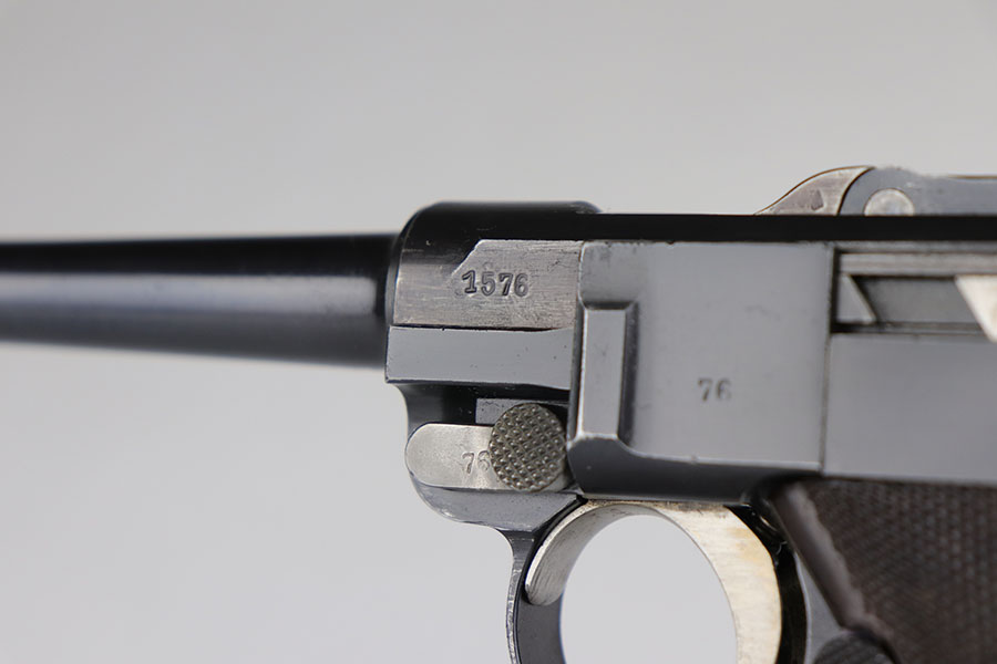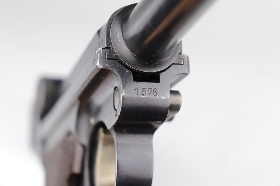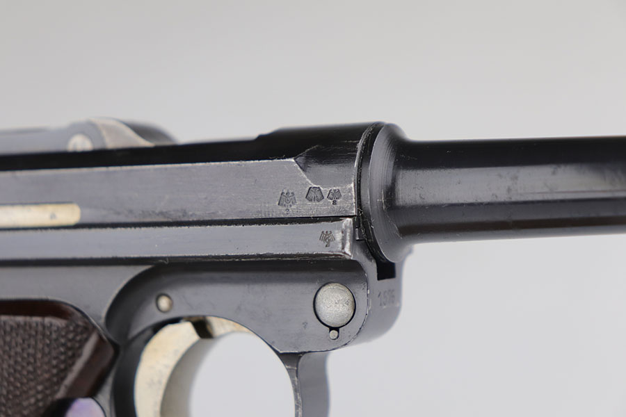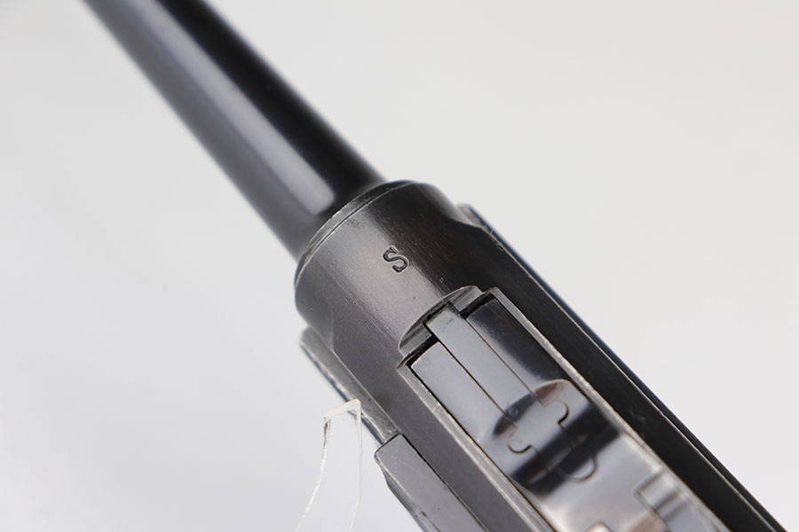 12/29/20 – This is a fantastic example of an early S-code Krieghoff Luger, made around 1936 for the Luftwaffe. The gun is in excellent original condition, retaining about 97-98% of its high polished blue with minimal wear on high edges and some minimal thinning of blue on the sides of the slide. The straw on the small parts is still vivid. All the markings are crisp. The gun is all matching except for an original magazine that is 30 digits off the gun’s serial. The grips appear to be of a slightly later vintage – made around 1936 / 37, but are in great shape as well. These early guns usually had a wood grip, or Ritzmann fine checkered, but they were not always put together in serial number sequence according to Gibson’s book. This example has the Ritz grips on it. The gun came to us with the grips that are in the photos. Bore has strong rifling but minor frost throughout. A great example of a very desirable early Krieghoff Luger.