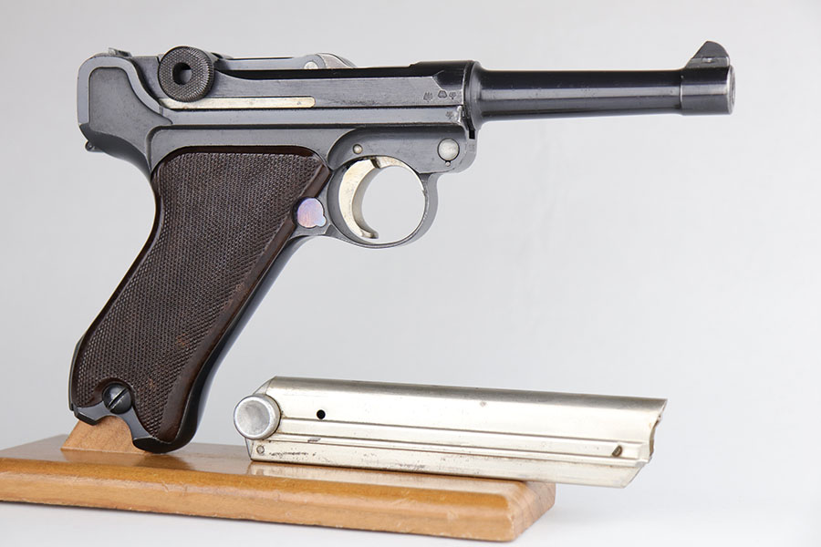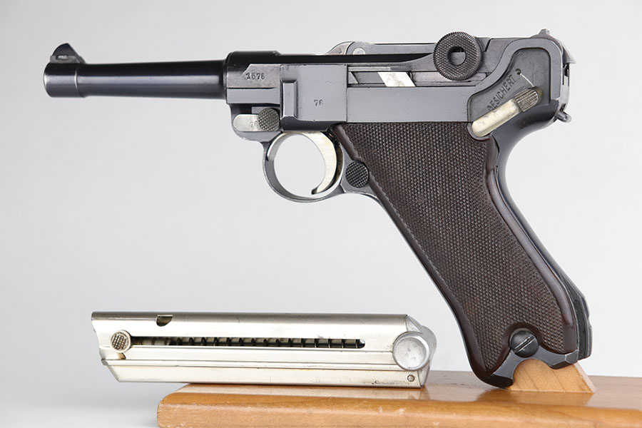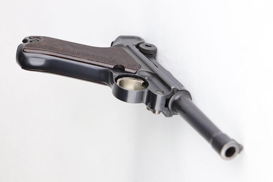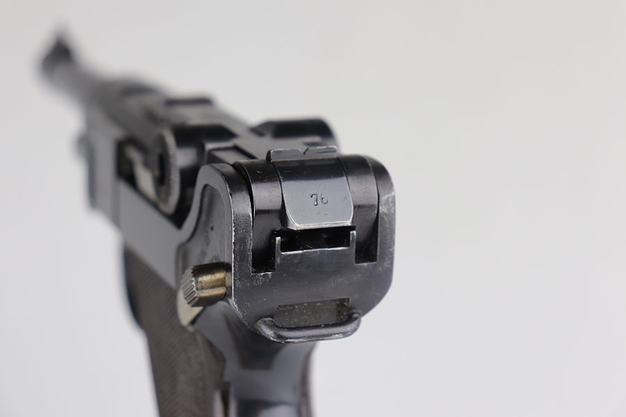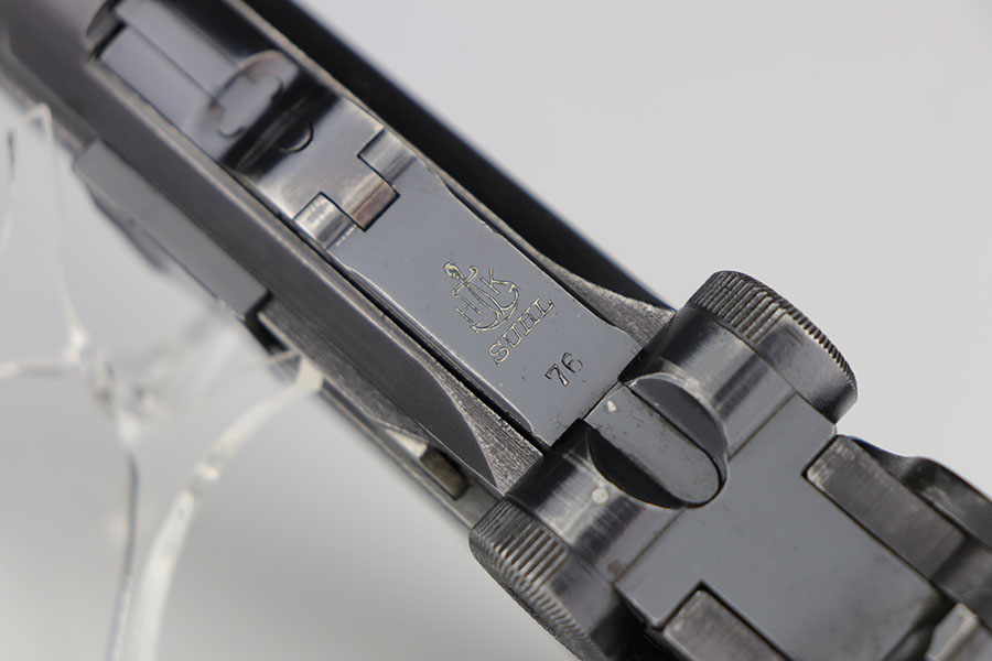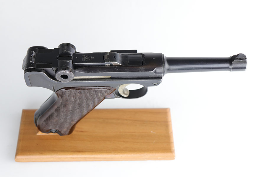 12/29/20 – This is a fantastic example of an early S-code Krieghoff Luger, made around 1936 for the Luftwaffe. The gun is in excellent original condition, retaining about 97-98% of its high polished blue with minimal wear on high edges and some minimal thinning of blue on the sides of the slide. The straw on the small parts is still vivid. All the markings are crisp. The gun is all matching except for an original magazine that is 30 digits off the gun’s serial. The grips appear to be of a slightly later vintage – made around 1936 / 37, but are in great shape as well. These early guns usually had a wood grip, or Ritzmann fine checkered, but they were not always put together in serial number sequence according to Gibson’s book. This example has the Ritz grips on it. The gun came to us with the grips that are in the photos. Bore has strong rifling but minor frost throughout. A great example of a very desirable early Krieghoff Luger.