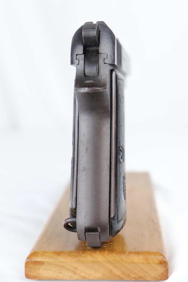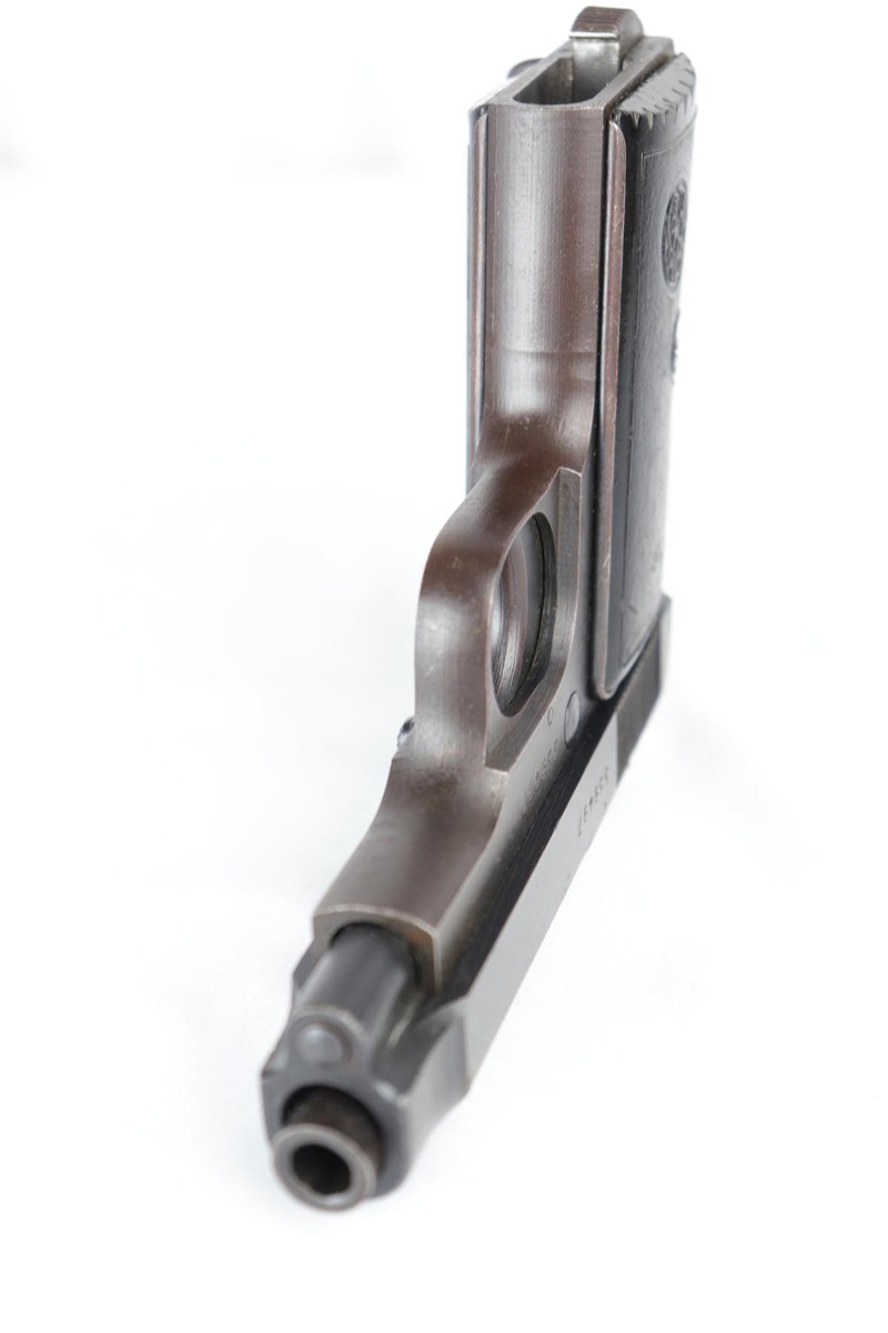 10/24/18 – This is a terrific Nazi Beretta M1935, manufactured in 1944 and marked ‘4UT’ on left side frame. The pistol shows minor finish loss on the top of the barrel, and some browning to the color on the straps. Nice original grips and magazine, though the grips have a few notches carved into them on the bottom of both panels. Nice, shiny bore.