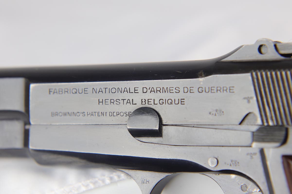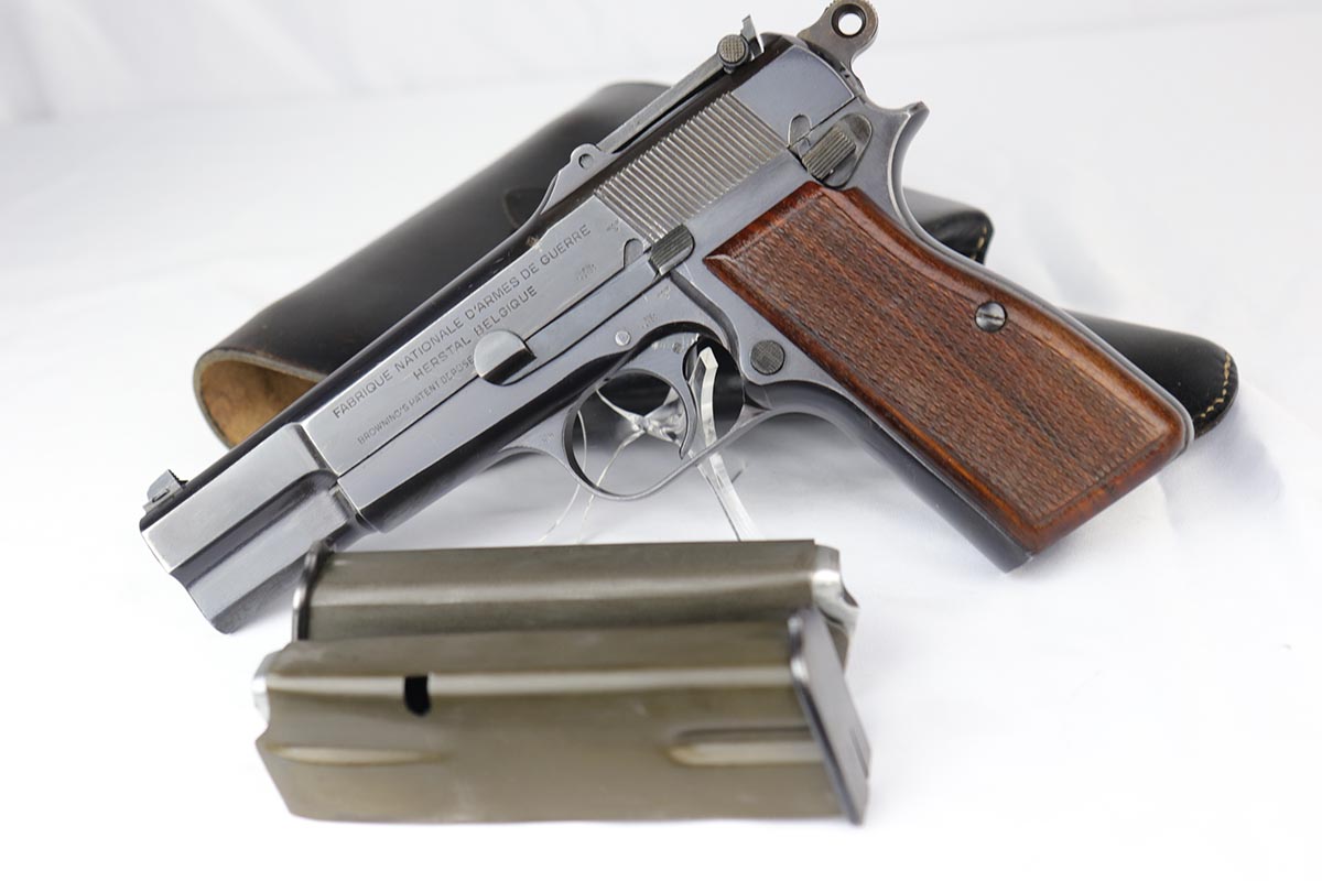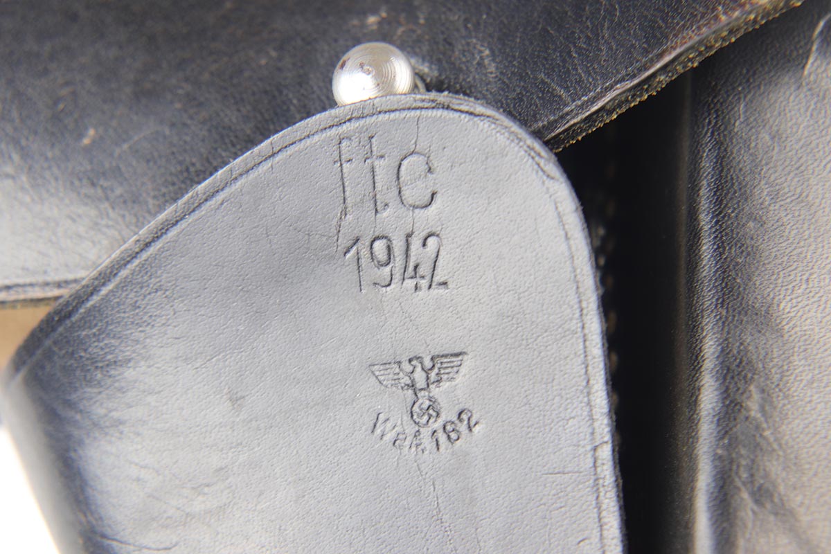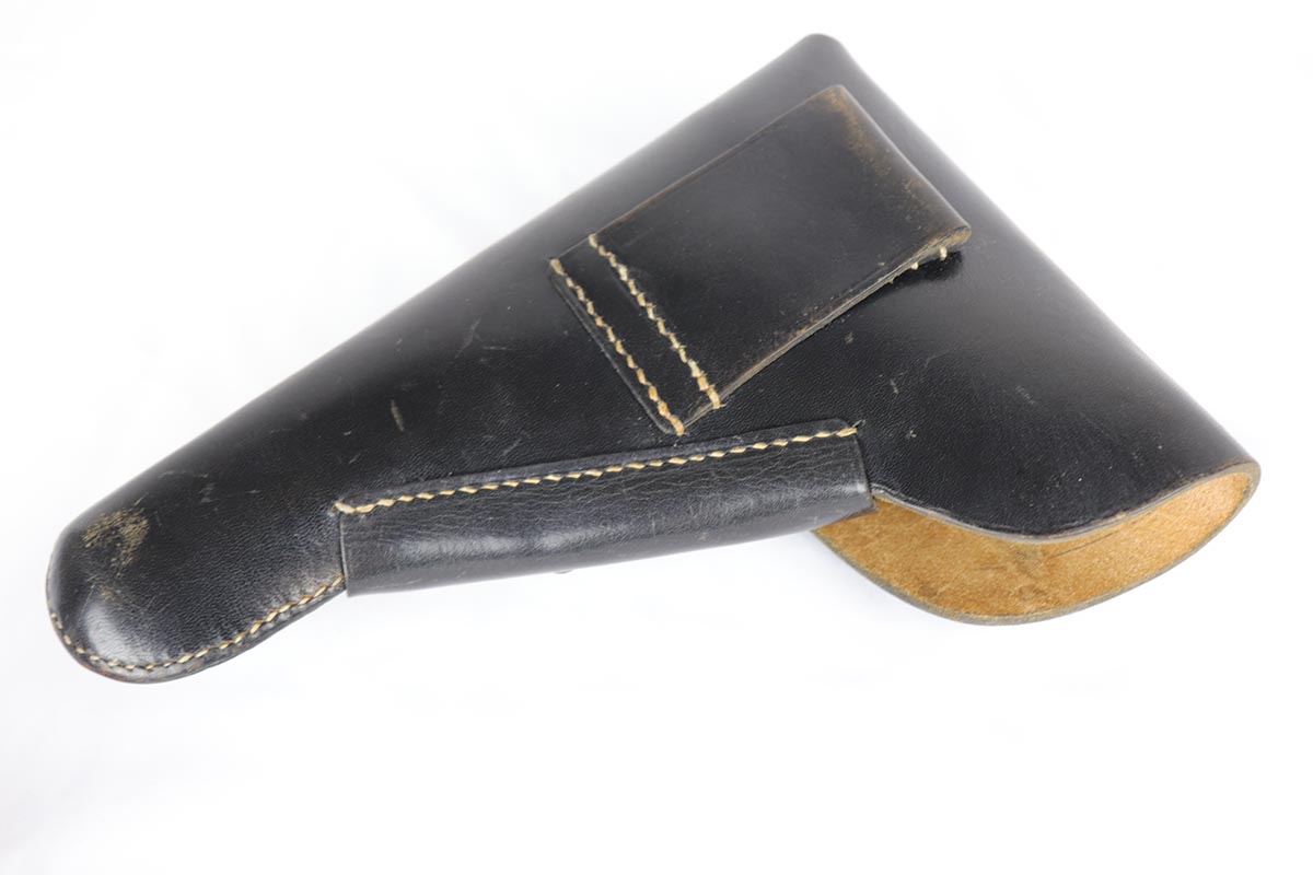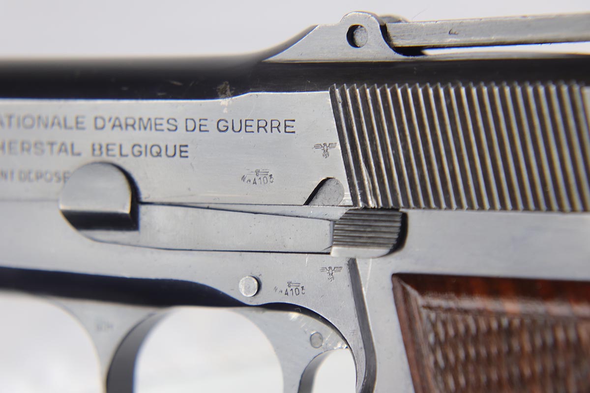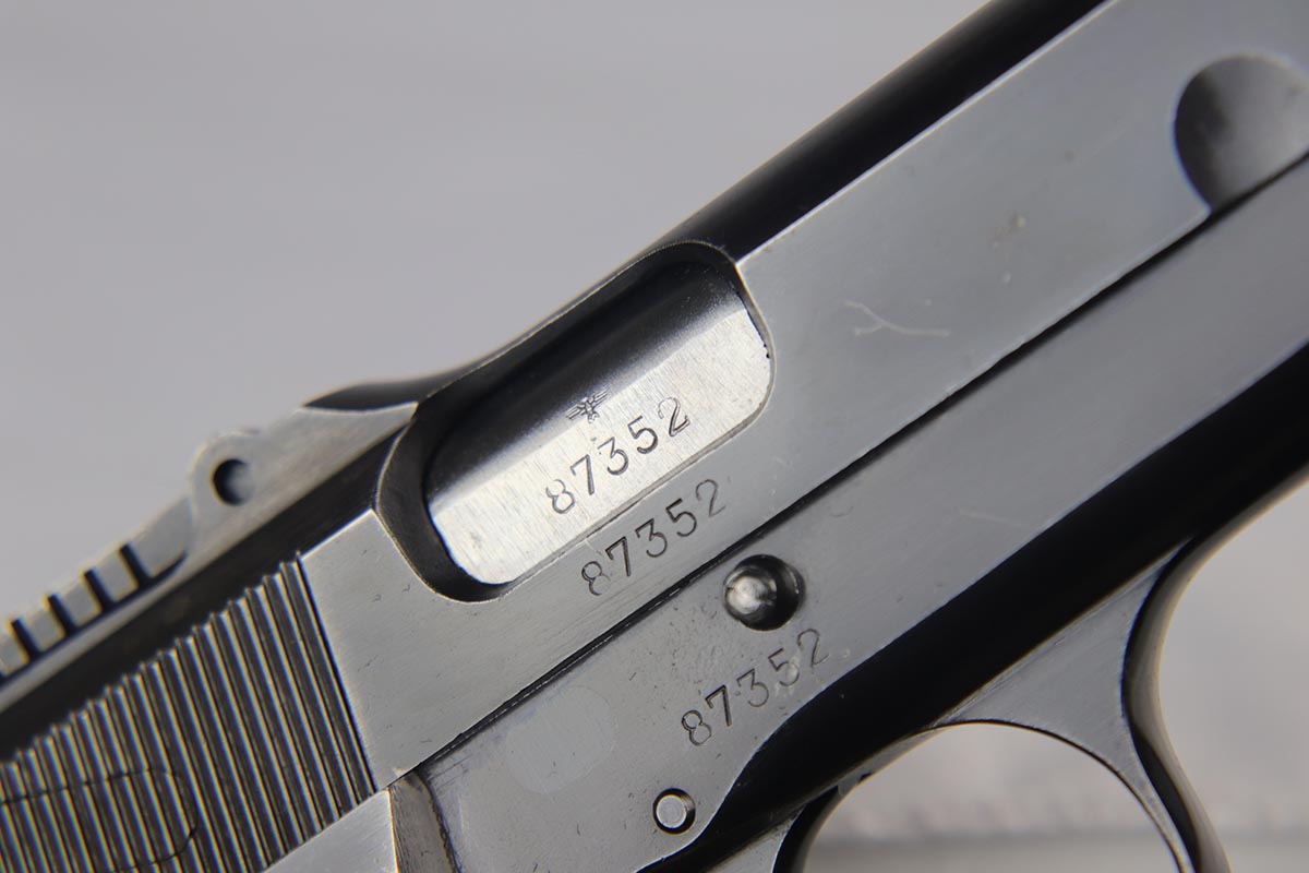 10/3/18 – This is a superb example of a complete Nazi Browning Hi Power rig with early tangent sight and more desirable WaA103 proofs on slide and frame. The pistol is all matching and original, and the high-polish bluing rates at 97% with minor holster wear on high edges and a spot of finish loss on the bottom of the back strap. The pistol has a mint bore and comes with two waffen proofed magazines in fantastic condition, both still showing the early green tinge from the phosphate finish. This gun also features the original walnut grips that have the unusual “red-lead” primer paint internally, which was only found on the earliest grips. It also includes a mint 1942 dated black holster, with clear waffen and maker marks.