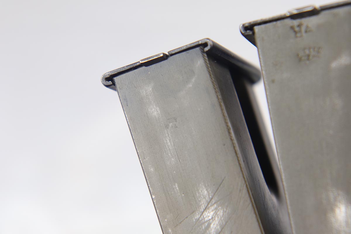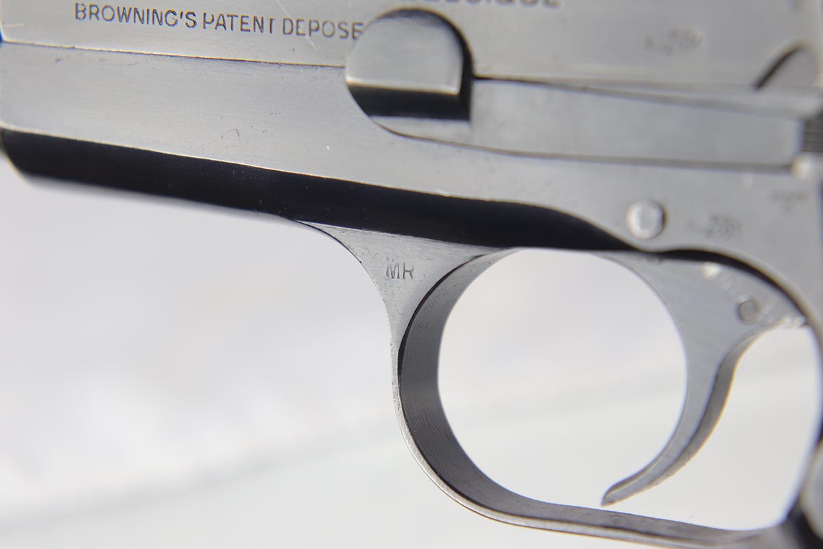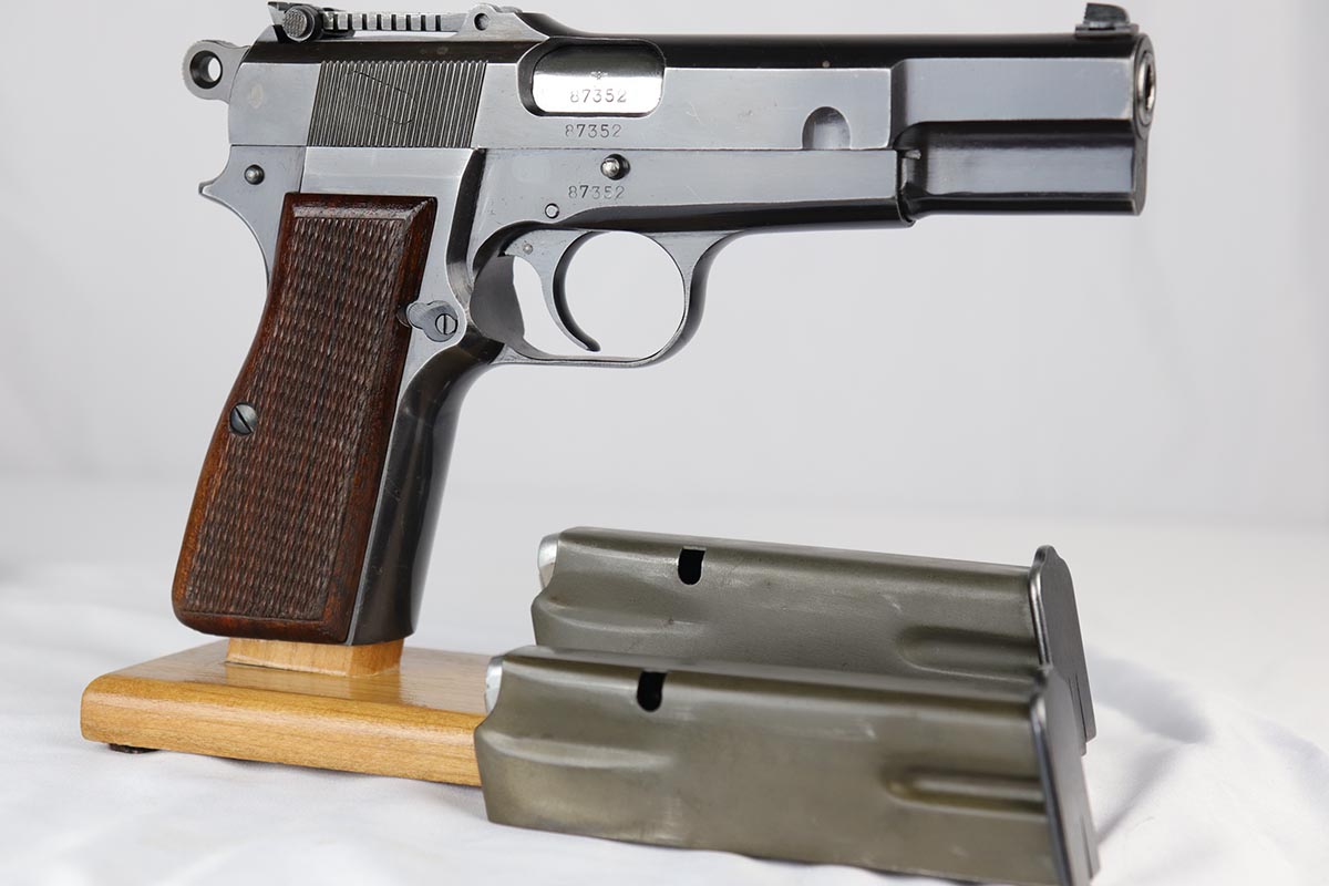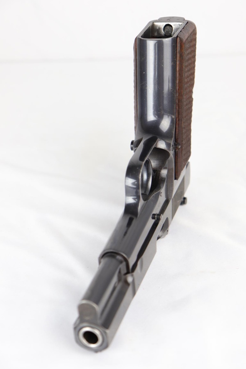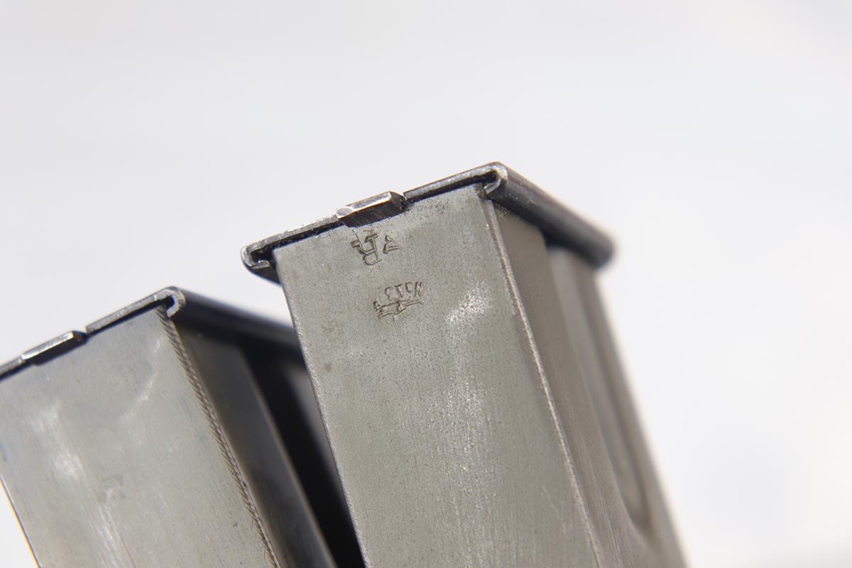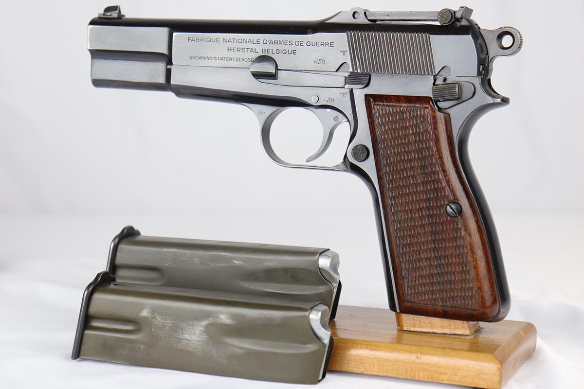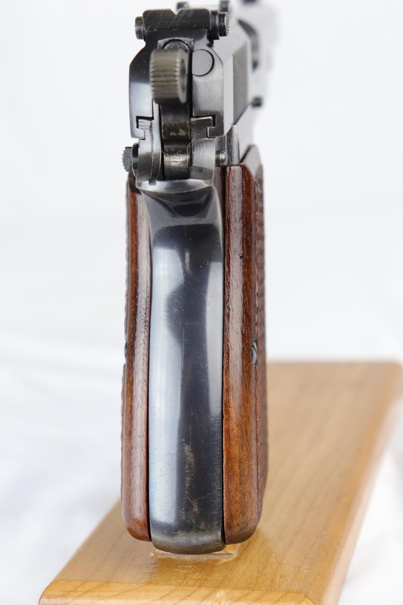 10/3/18 – This is a superb example of a complete Nazi Browning Hi Power rig with early tangent sight and more desirable WaA103 proofs on slide and frame. The pistol is all matching and original, and the high-polish bluing rates at 97% with minor holster wear on high edges and a spot of finish loss on the bottom of the back strap. The pistol has a mint bore and comes with two waffen proofed magazines in fantastic condition, both still showing the early green tinge from the phosphate finish. This gun also features the original walnut grips that have the unusual “red-lead” primer paint internally, which was only found on the earliest grips. It also includes a mint 1942 dated black holster, with clear waffen and maker marks.