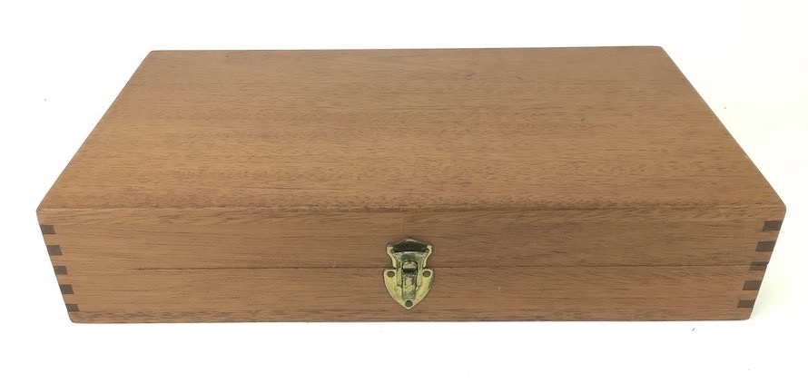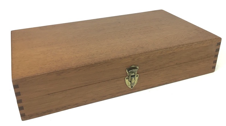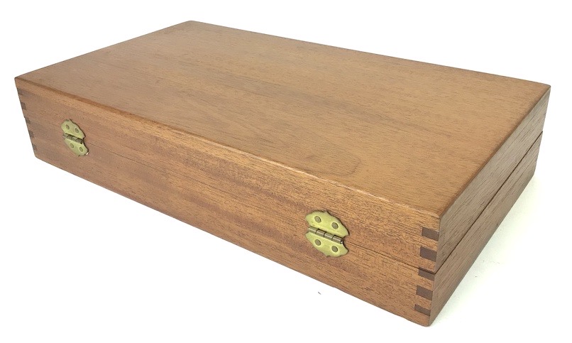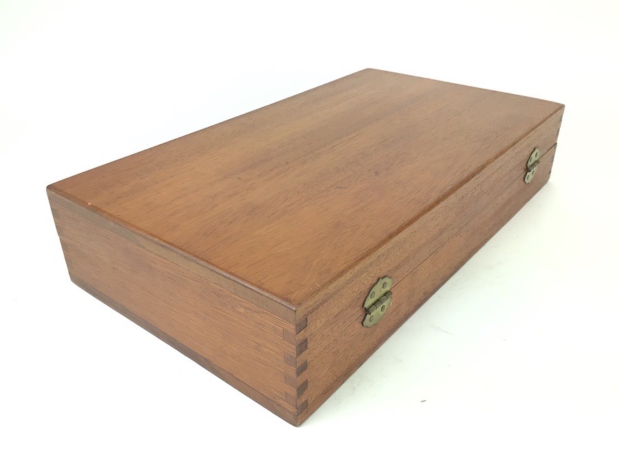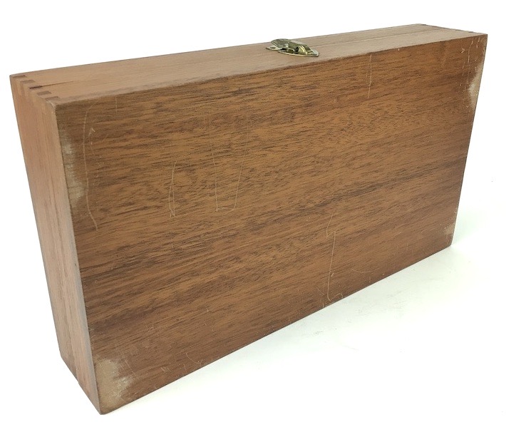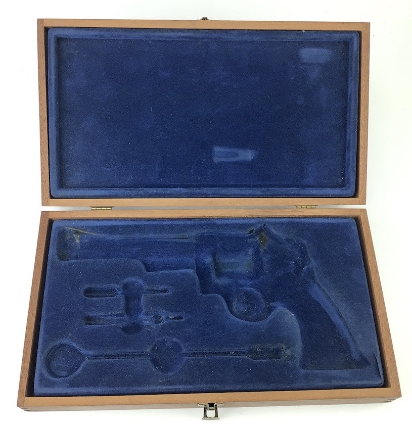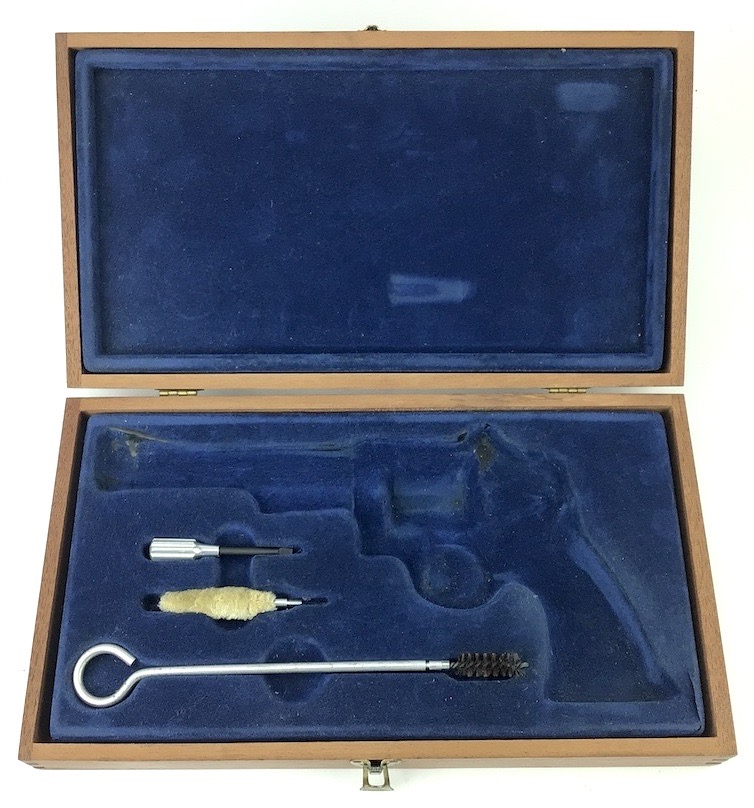 10/24/23 – Great condition. hardwood display / storage case for the S&W M29 revolver. Includes cleaning rod with a swab and brass brass, along with screwdriver. The blue felt interior shows minor wear and usage, but still very presentable. Hinges and clasp are all intact and functional. Bottom of the case shows minor wear marks.