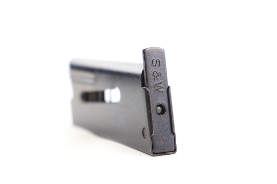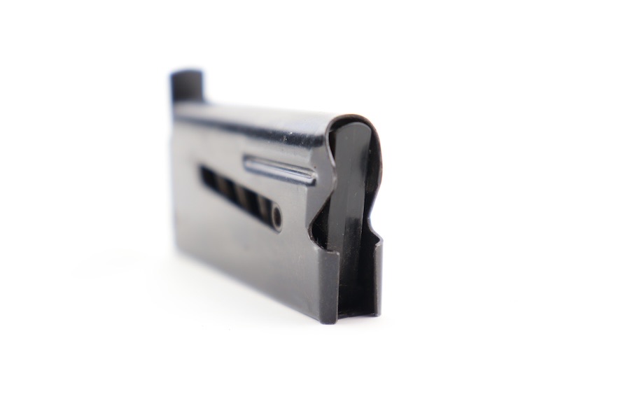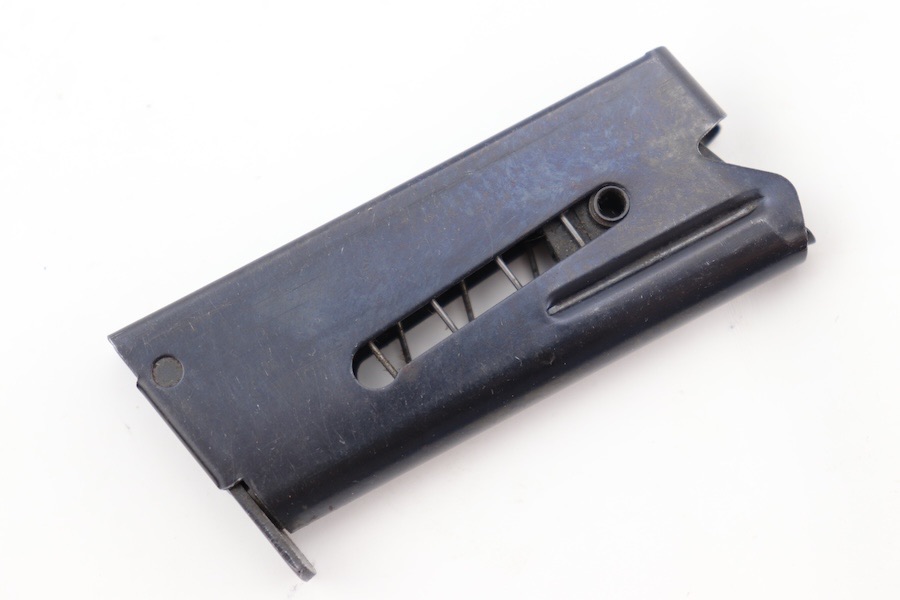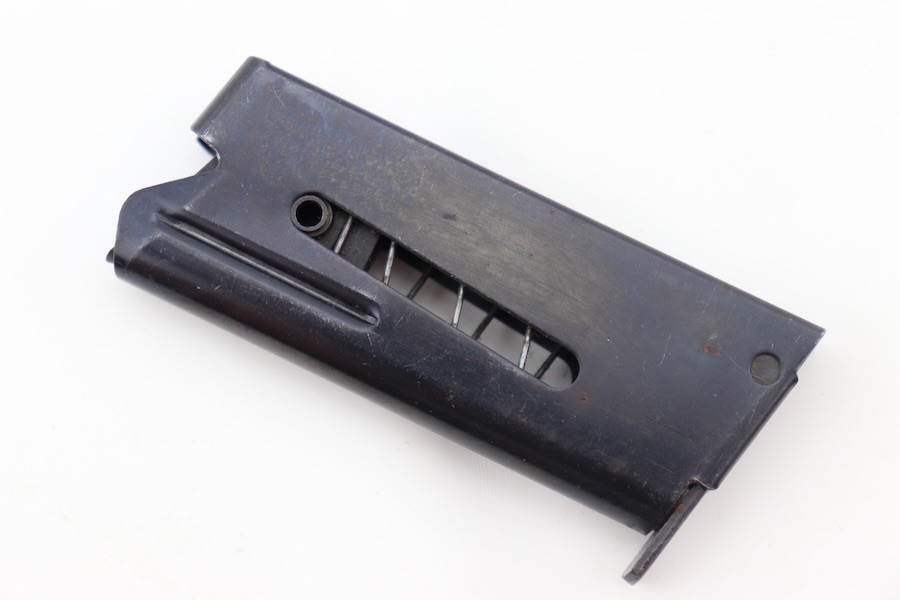 2/6/24 – This is a great and orignal condition S&W model 61 Escort magazine in .22 LR. There are a few small spots of surface oxidation on the bottom left side, but the magazine retains 95+% of its original bluing finish. Spring has excellent retention and smooth operation. S&W is displayed across the footplate.