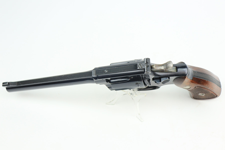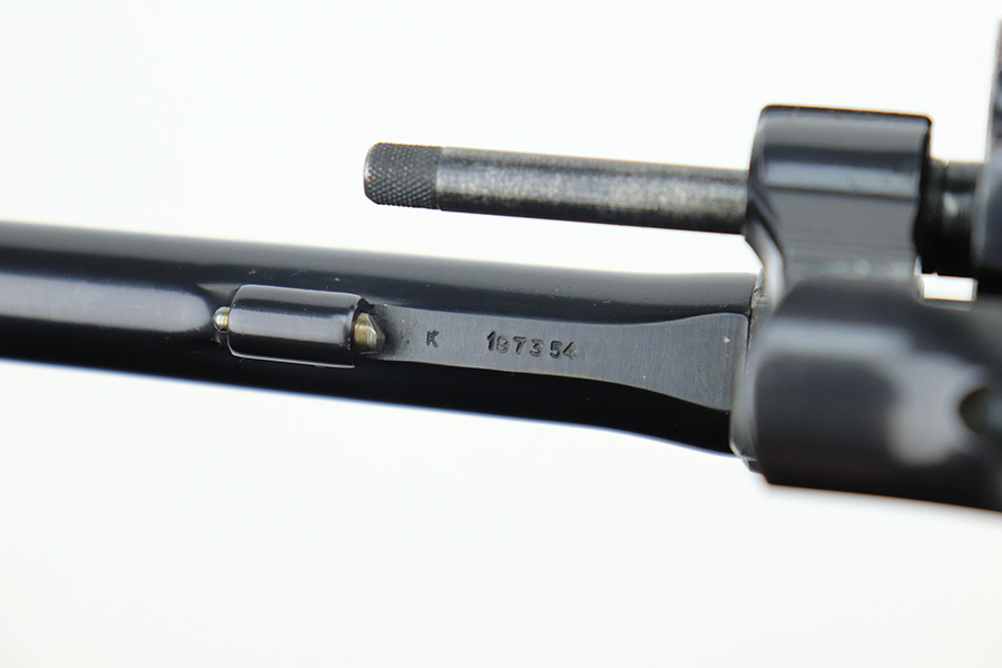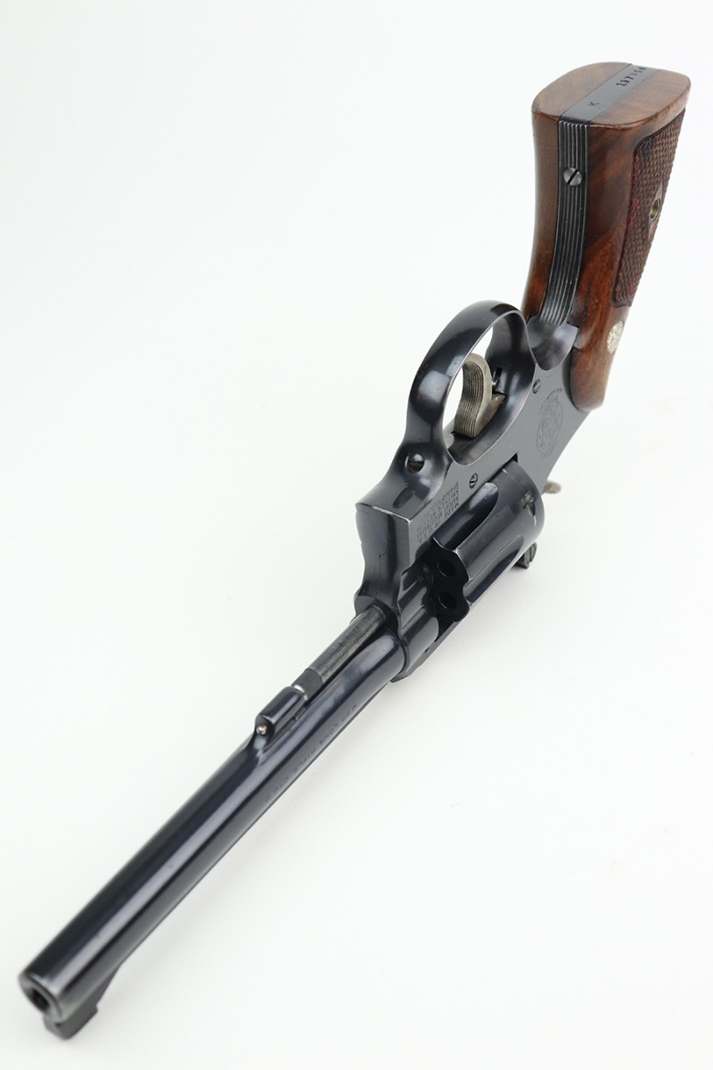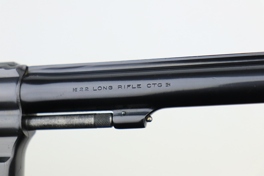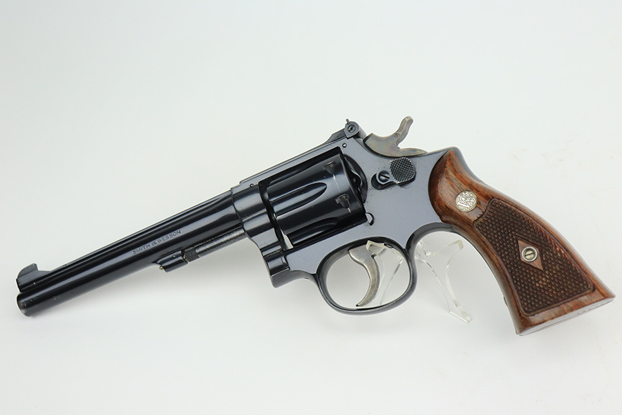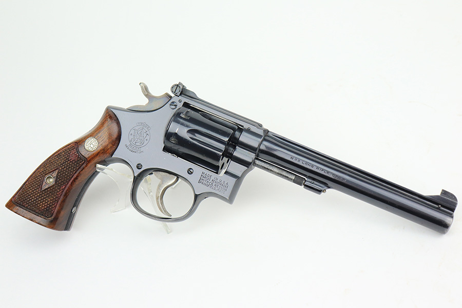 5/23/22 – This is a minty example of a Smith & Wesson Model K-22 Masterpiece revolver manufactured in 1953. It is all matching, has a 6 inch barrel, and is chambered in .22 LR. It has retained about 98% of its original high polish finish. There is minor muzzle wear, a light roll mark on the cylinder, and some very light scratches here and there on the barrel and right side of the frame. Hammer and trigger have very nice case-hardening. Excellent wood grips. Mint bore. The cylinder is tight and the action is smooth.