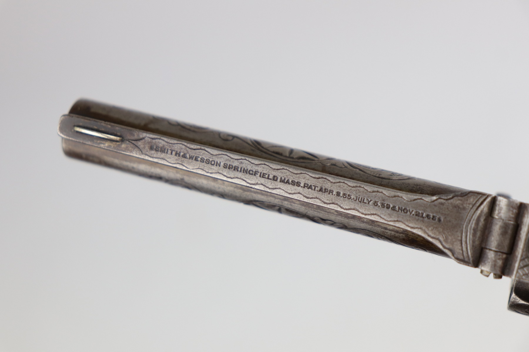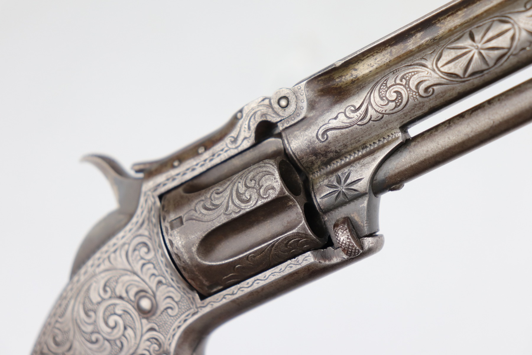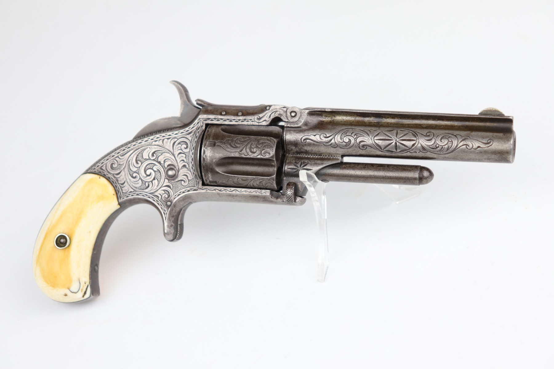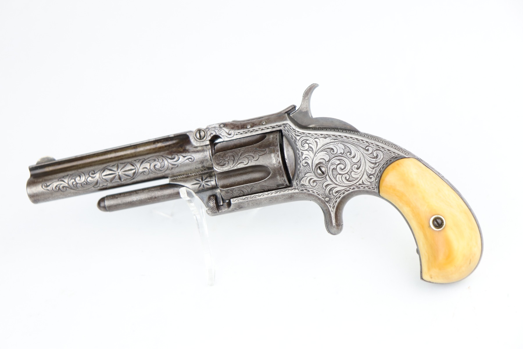 6/18/20 – This is a S&W No. 1 1/2 Second Issue Revolver. It is an antique and was manufactured between 1868-1875. It features a beautiful floral and “burst” engraving pattern. This pattern is period correct. It also has original ivory grips in excellent condition. There is some tarnish on the barrel which is an indication that it likely was silver-plated originally. The original finish is almost completely worn. The gun still functions. There are spotty areas of patina on the metal throughout. The bore has decent rifling with minor pitting throughout.
