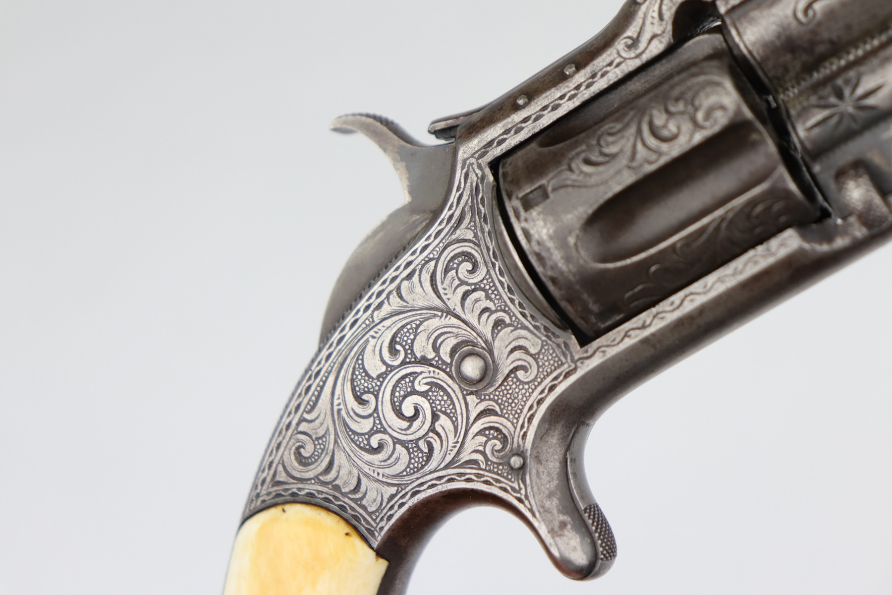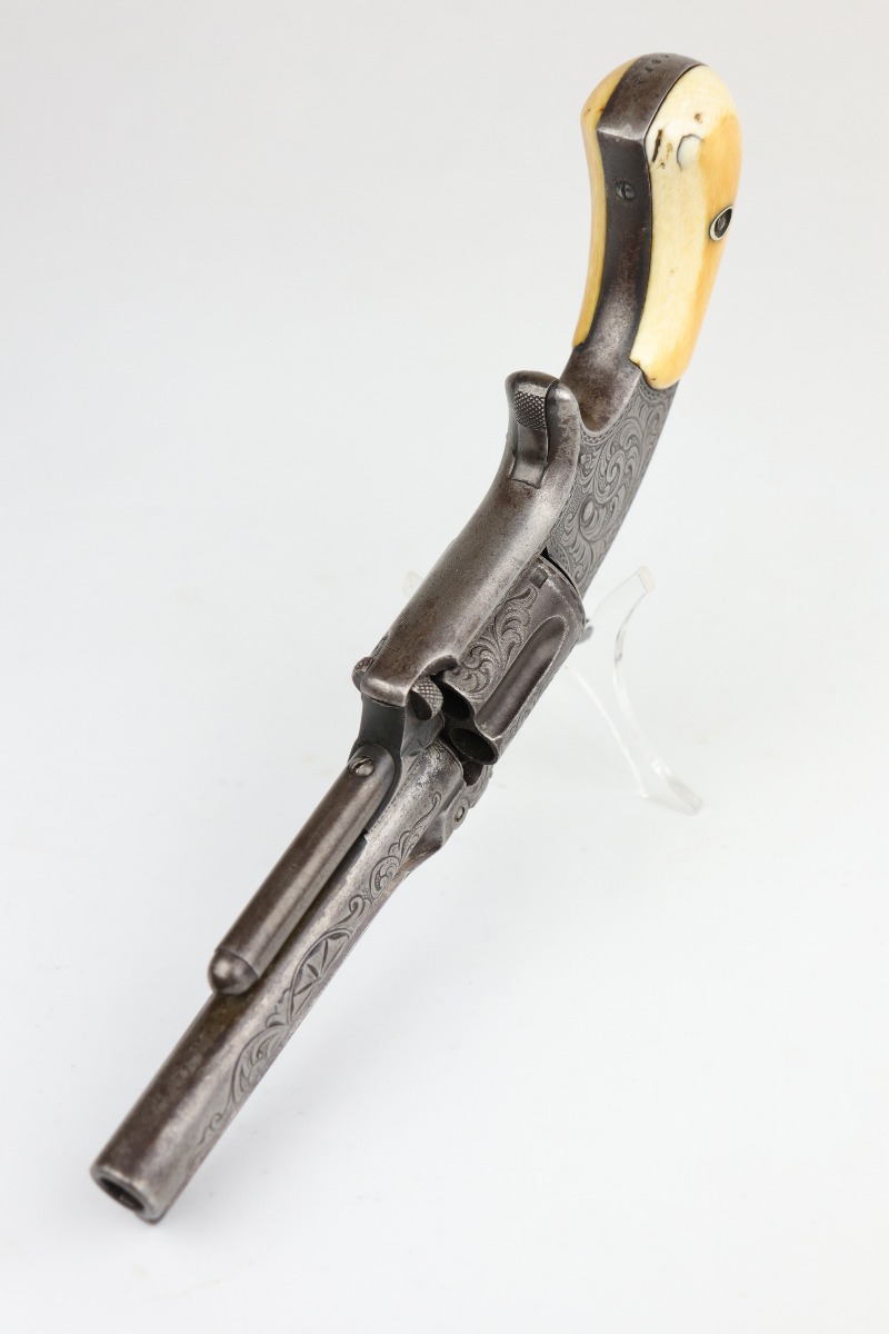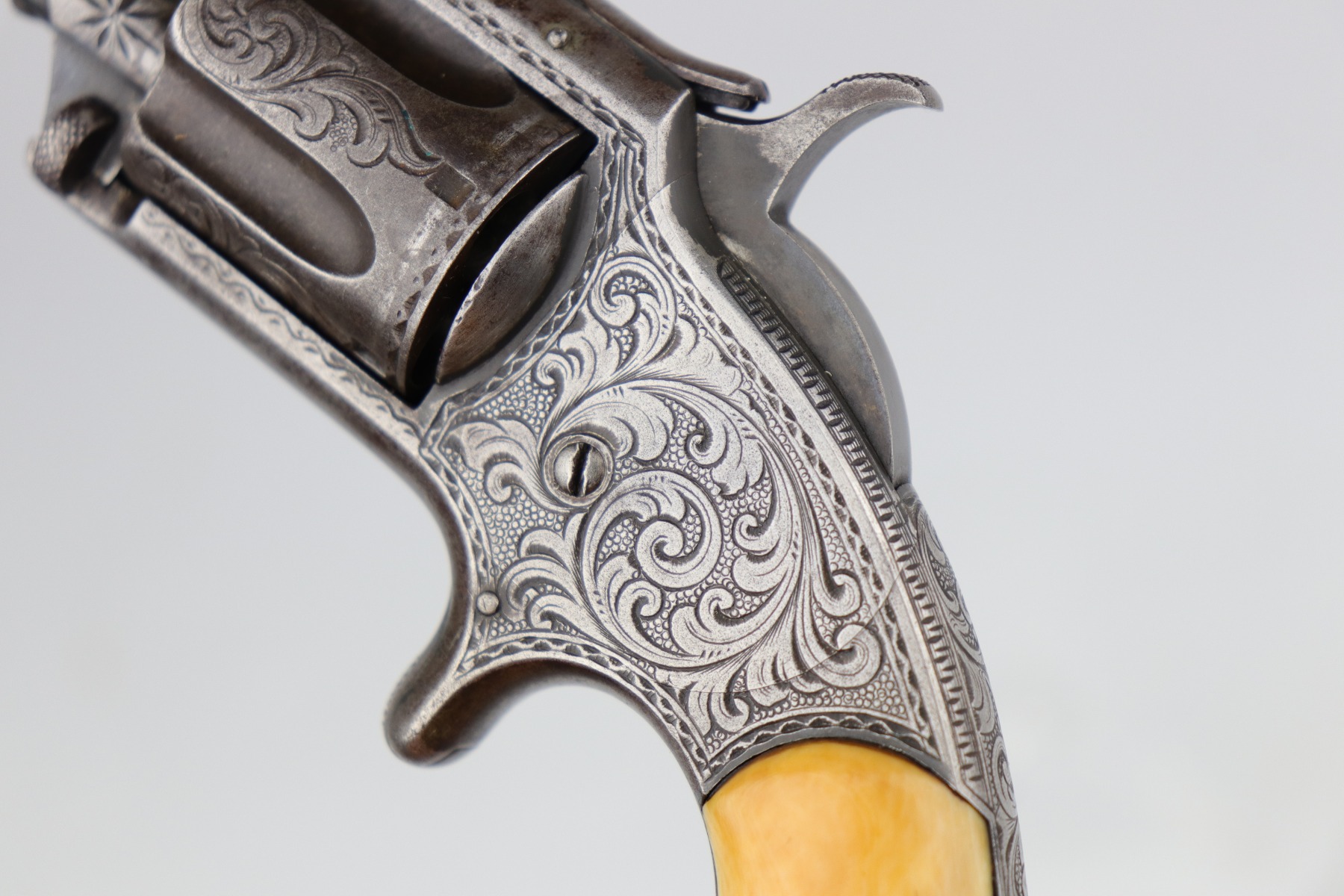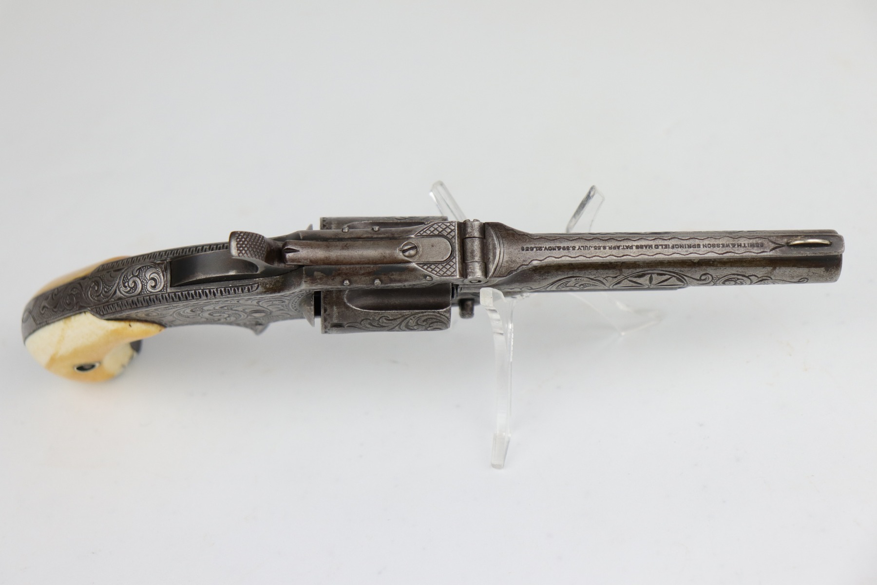 6/18/20 – This is a S&W No. 1 1/2 Second Issue Revolver. It is an antique and was manufactured between 1868-1875. It features a beautiful floral and “burst” engraving pattern. This pattern is period correct. It also has original ivory grips in excellent condition. There is some tarnish on the barrel which is an indication that it likely was silver-plated originally. The original finish is almost completely worn. The gun still functions. There are spotty areas of patina on the metal throughout. The bore has decent rifling with minor pitting throughout.