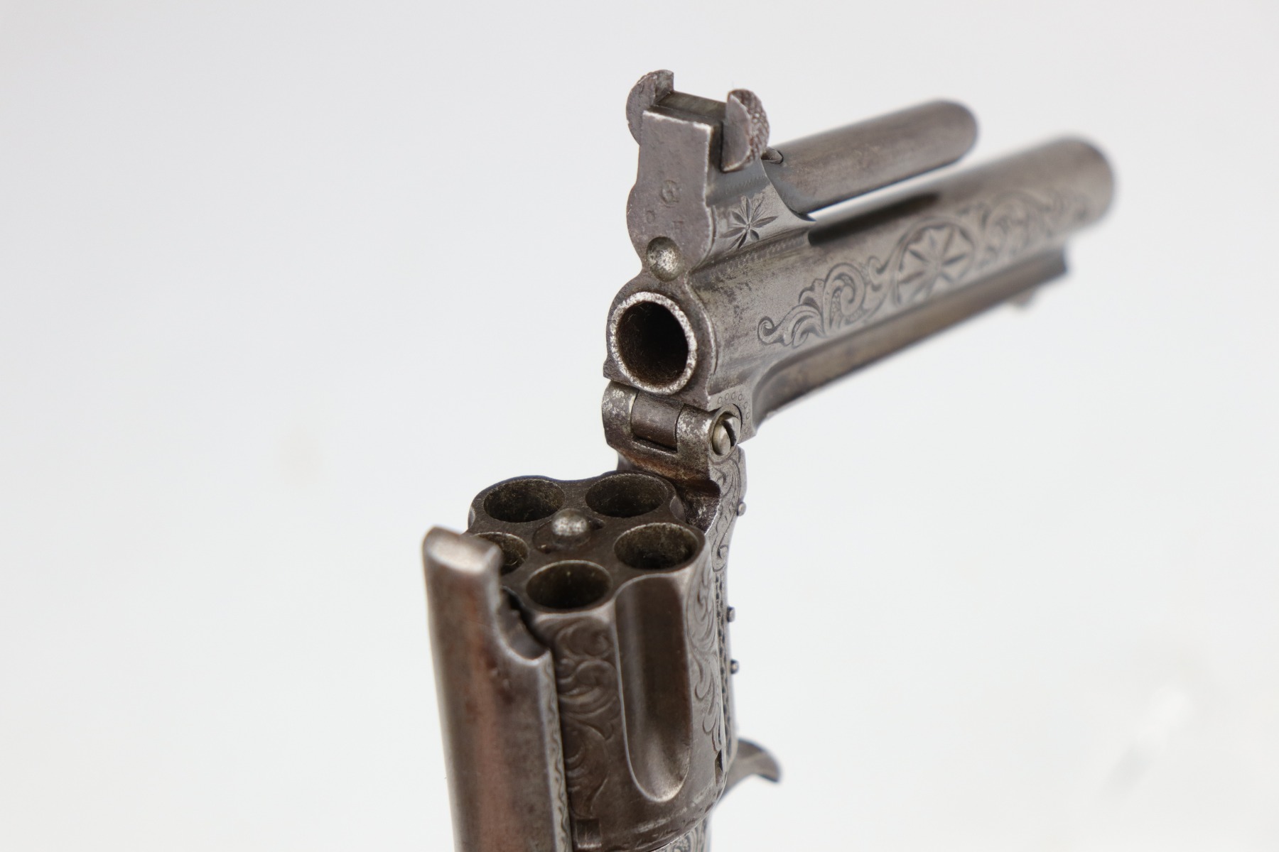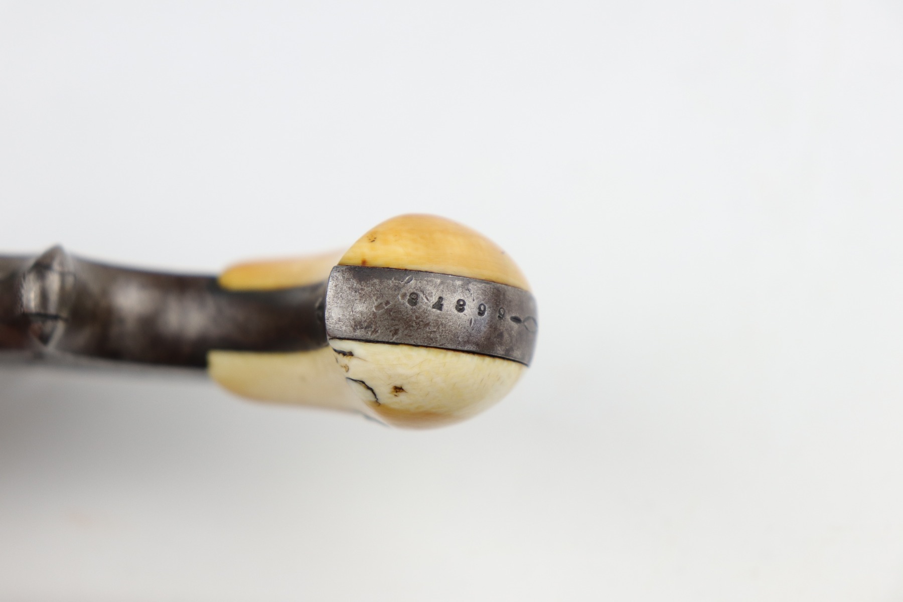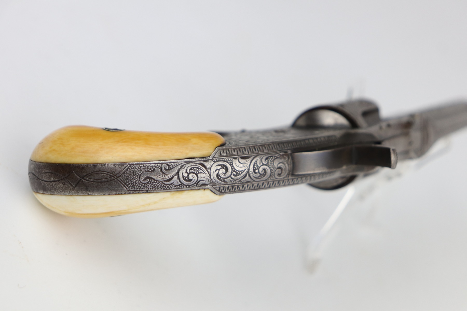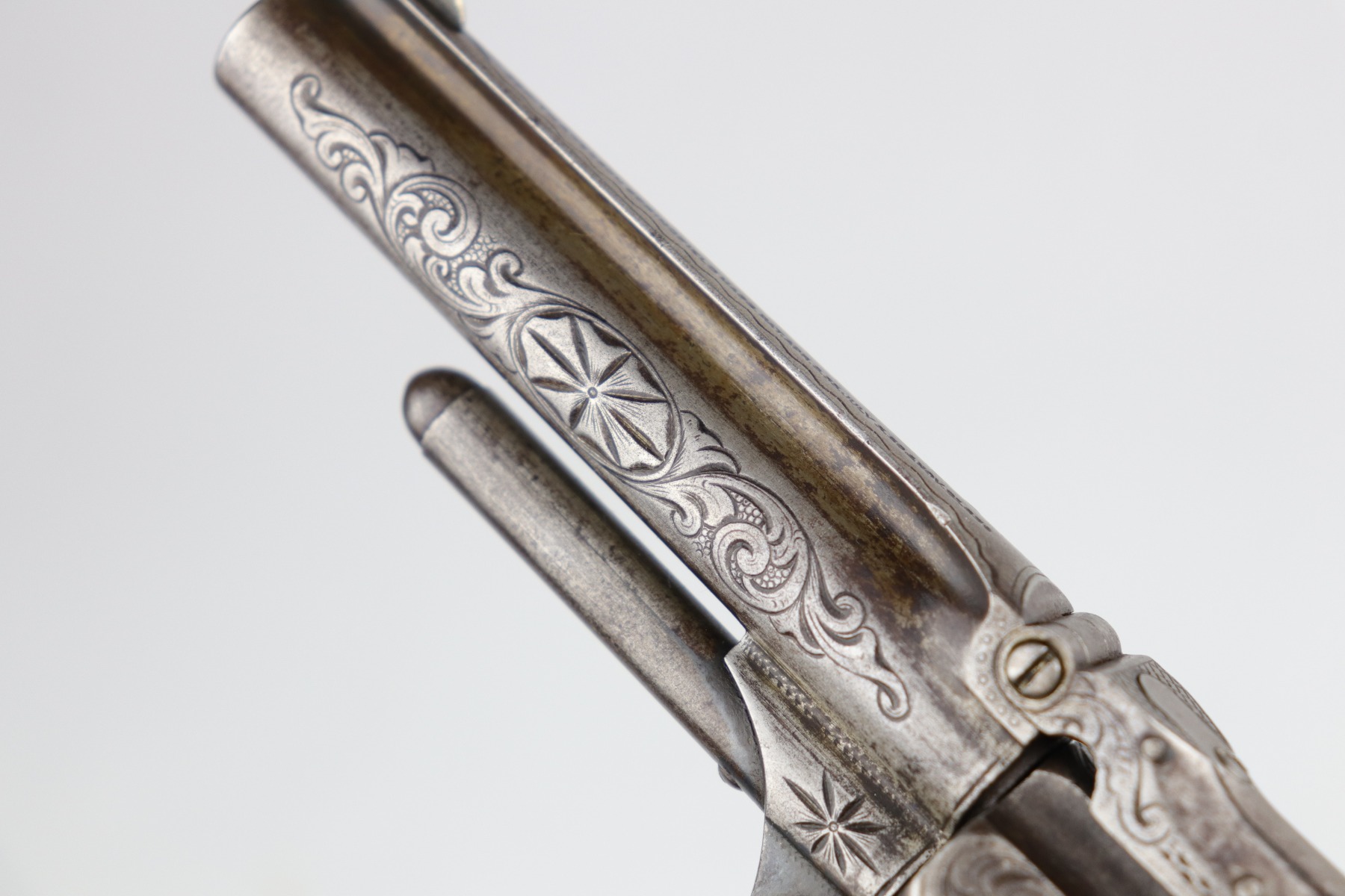 6/18/20 – This is a S&W No. 1 1/2 Second Issue Revolver. It is an antique and was manufactured between 1868-1875. It features a beautiful floral and “burst” engraving pattern. This pattern is period correct. It also has original ivory grips in excellent condition. There is some tarnish on the barrel which is an indication that it likely was silver-plated originally. The original finish is almost completely worn. The gun still functions. There are spotty areas of patina on the metal throughout. The bore has decent rifling with minor pitting throughout.