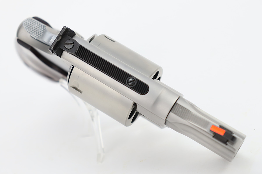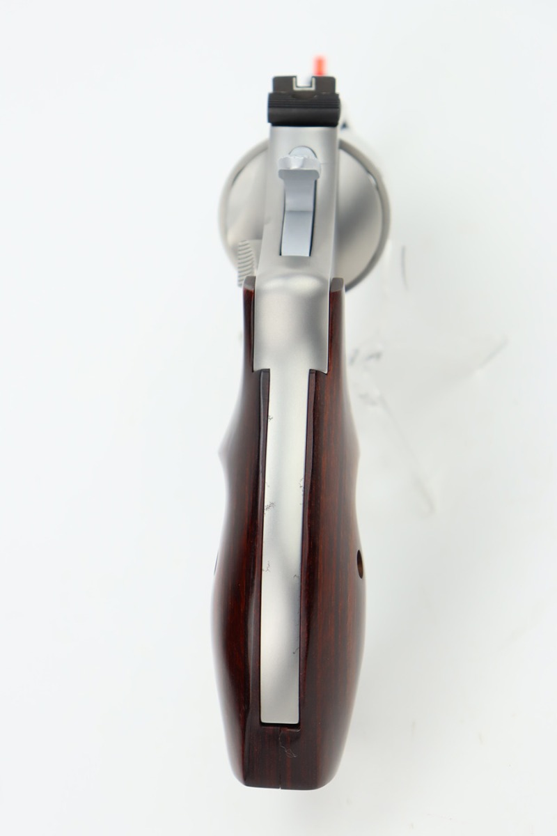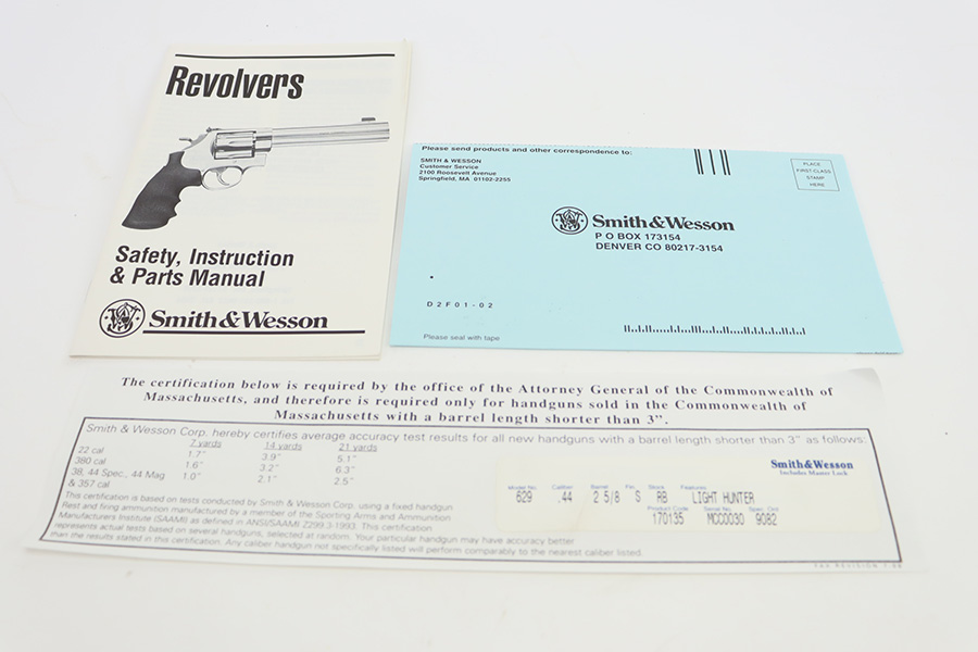 11/16/23 – This is a rare, minty Smith & Wesson Performance Center 629-5 Light Hunter as distributed by Lew Horton. There were only ~300 produced of this variant. The revolver shows minimal signs of use with no notable wear aside from a light turn line on the cylinder. Flat side barrel is 2.625 inches long with mint bore. It comes in the performance center hard case, which has the original S&W label as serialized and labeled Light Hunter, provided for MA state compliance. Beautiful smooth Goncalo Alves finger groove combat grips in minty condition.