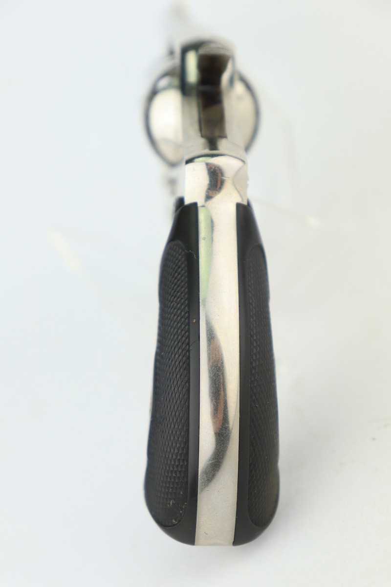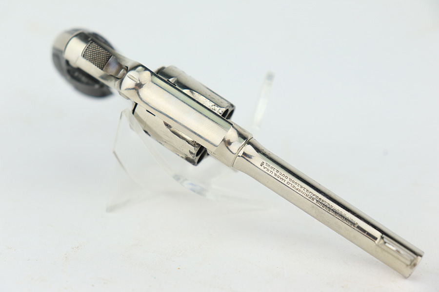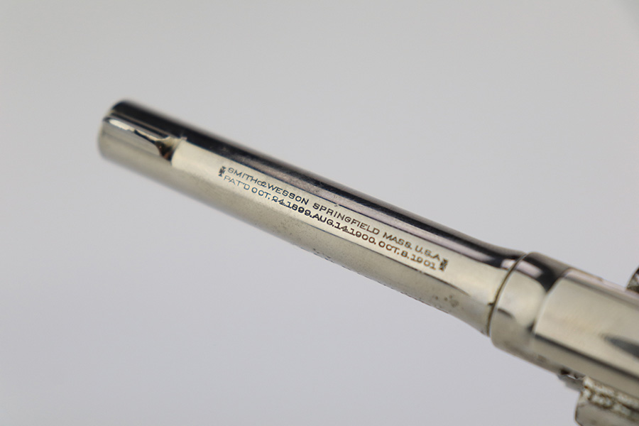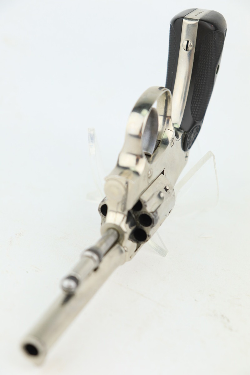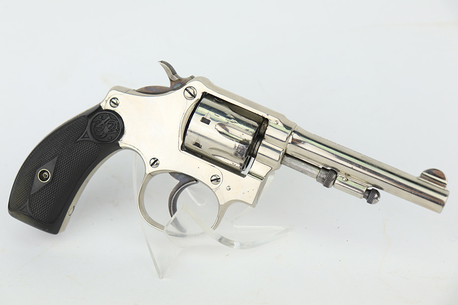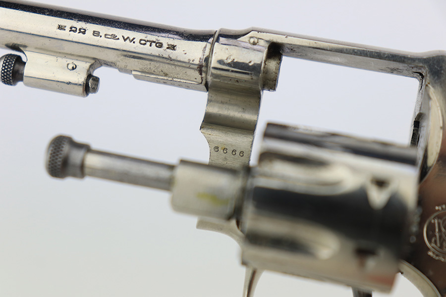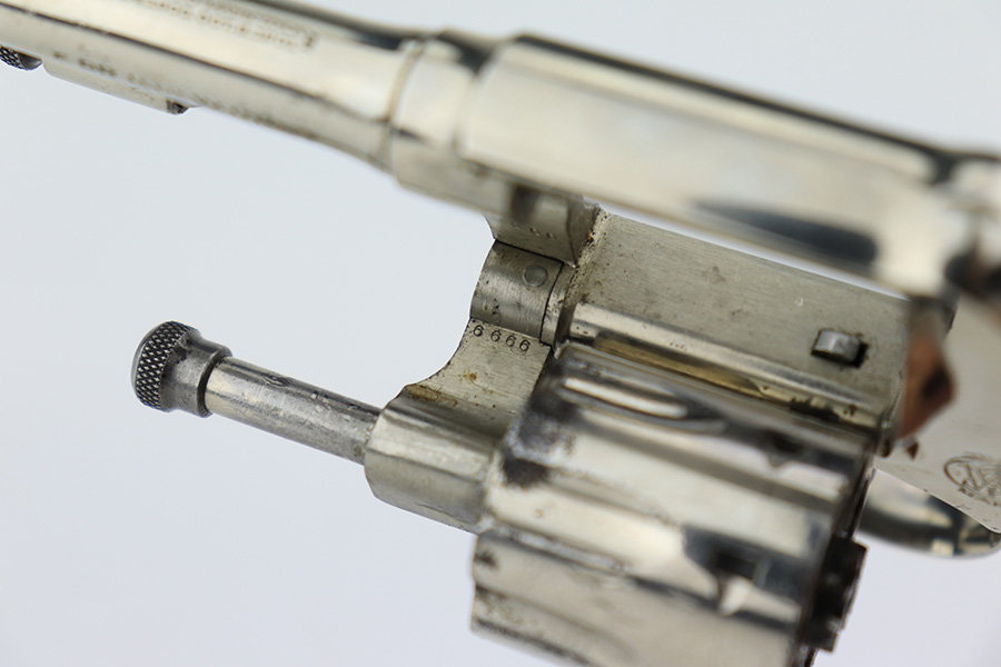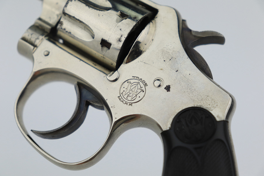 3/13/23 – This is a RARE nickel finish Lady Revolver, 2nd Model Smith and Wesson. It works in both single and double action. The nickel finish is excellent with some case hardening still remaining on the hammer and trigger. The action is very tight and timing works well. Hammer is a strong rimfire – 22 caliber. The finish still covers over 90% of the pistol with just a little flaking of the finish on the cylinder. The original grips are excellent as well. The bore is shiny with very little wear. Probably rates an 8 out of 10.