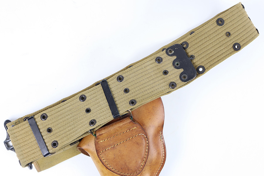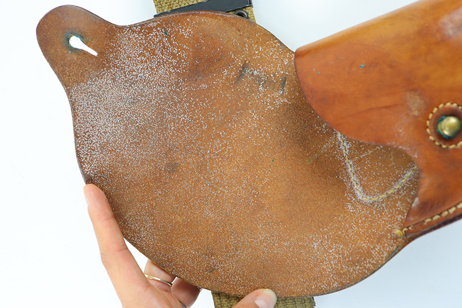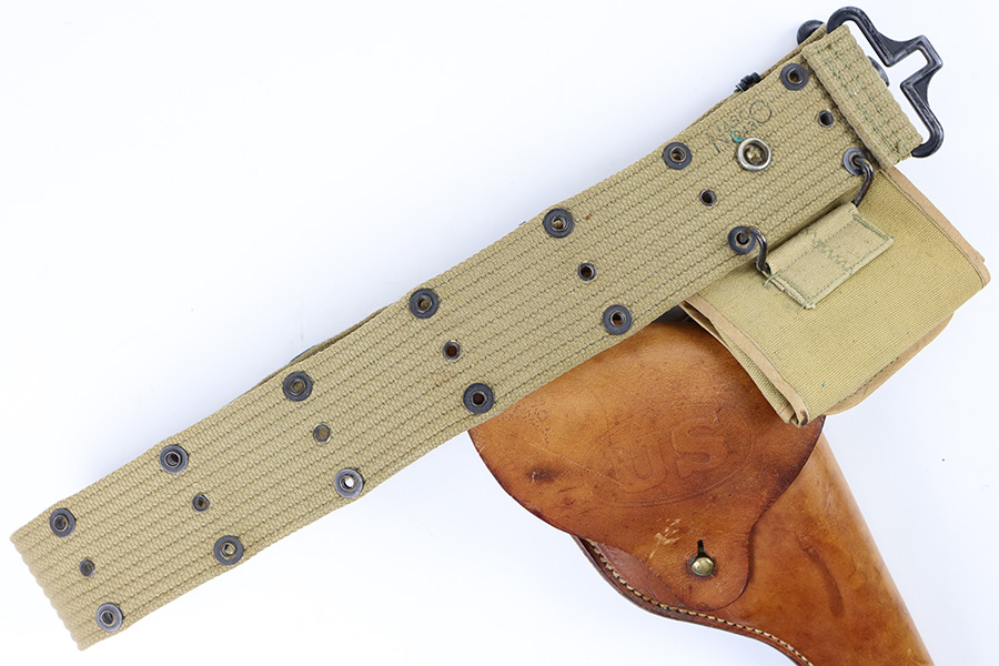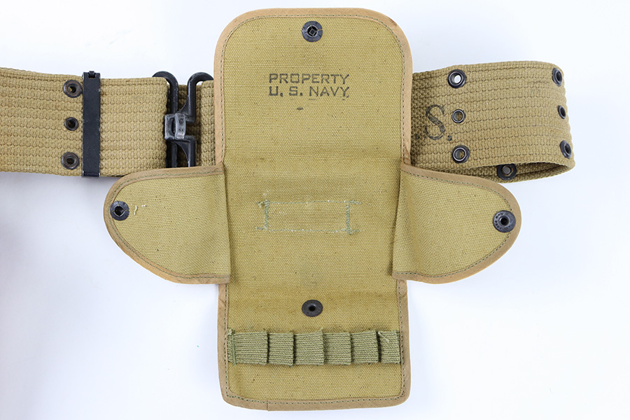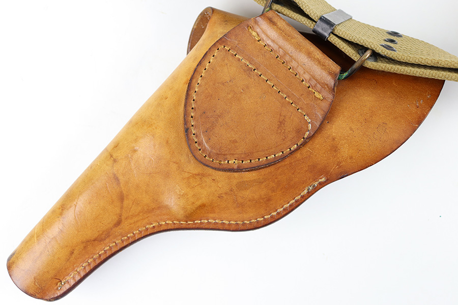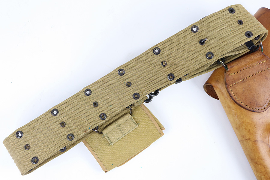 10/26/23 – This is an original WW2 era grouping of a leather S&W Victory revolver holster, canvas utility belt, and canvas cartridge holder. Would also be suitable for similar sized Colt or S&W revolvers. The holster has light surface discoloration and evidence of normal use wear. Normal pliability and all original stitching intact throughout. US stamped on the front leather with no other markings. The canvas belt is maker stamped and 1943 dated. The cartridge holder is stamped “Property U.S. Navy” on the interior.