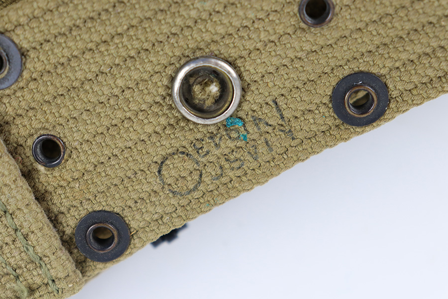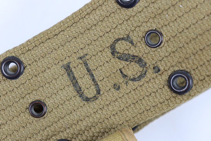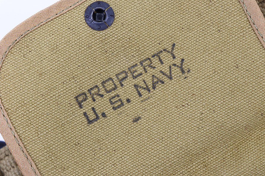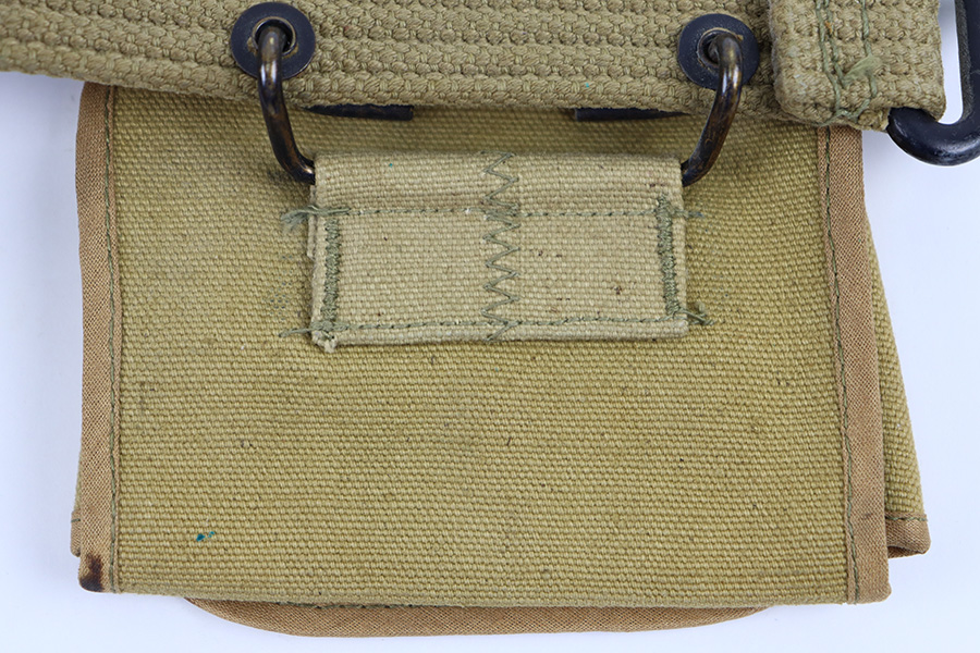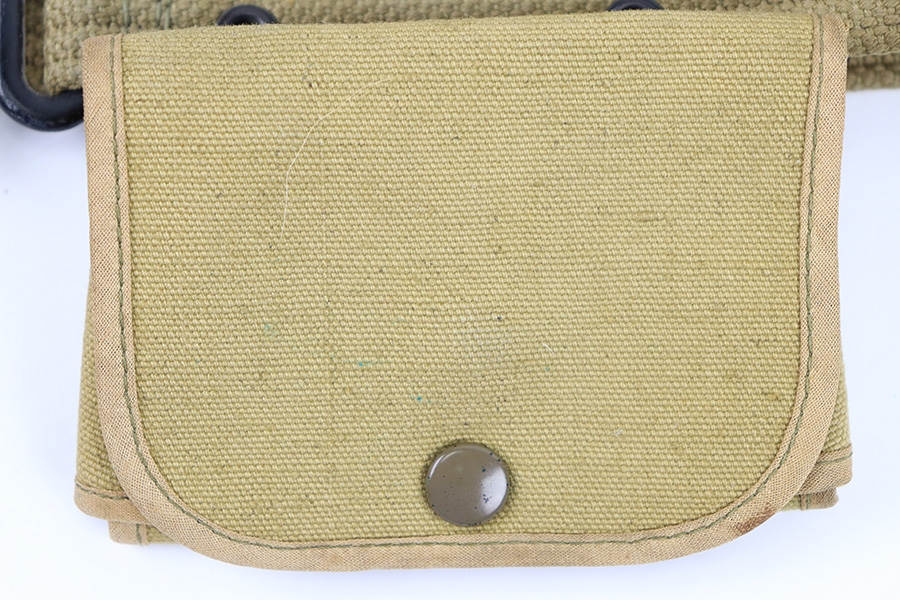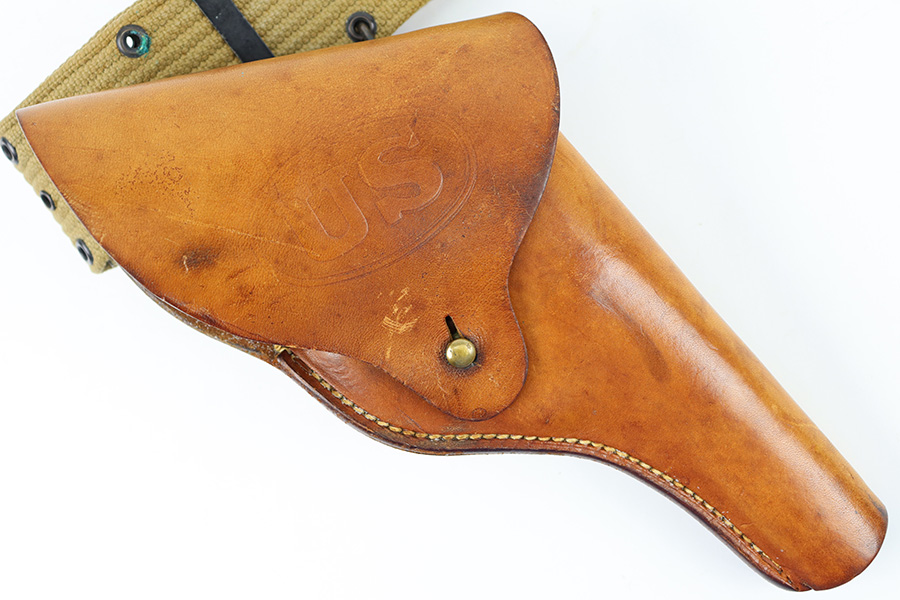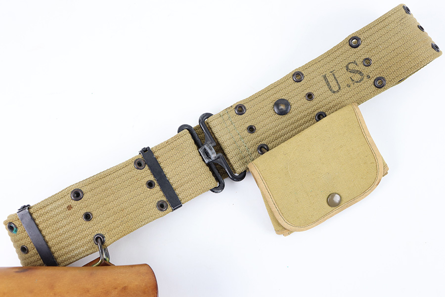 10/26/23 – This is an original WW2 era grouping of a leather S&W Victory revolver holster, canvas utility belt, and canvas cartridge holder. Would also be suitable for similar sized Colt or S&W revolvers. The holster has light surface discoloration and evidence of normal use wear. Normal pliability and all original stitching intact throughout. US stamped on the front leather with no other markings. The canvas belt is maker stamped and 1943 dated. The cartridge holder is stamped “Property U.S. Navy” on the interior.