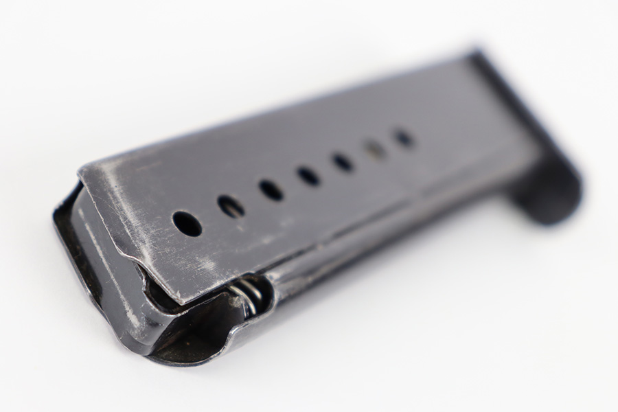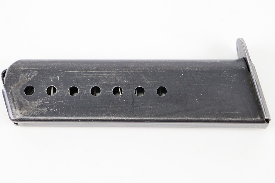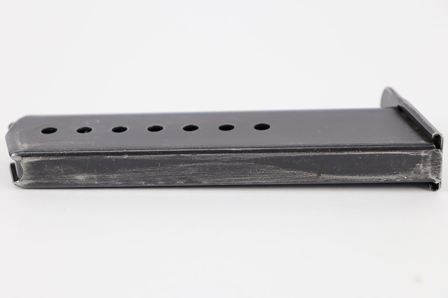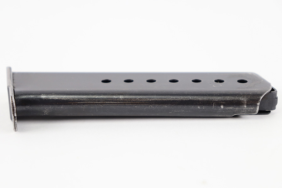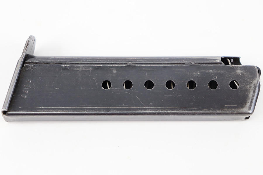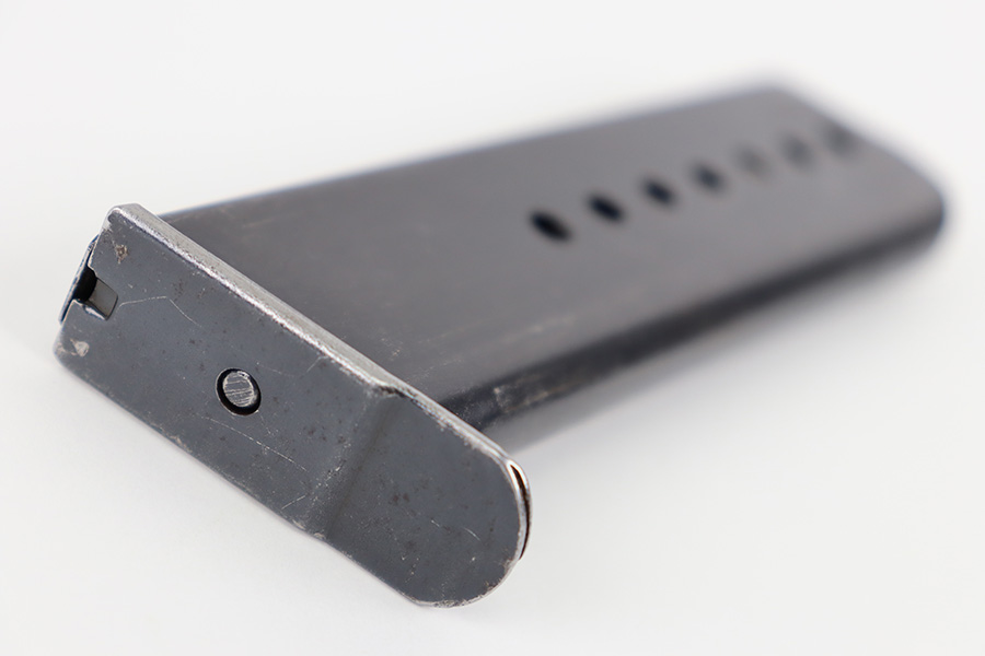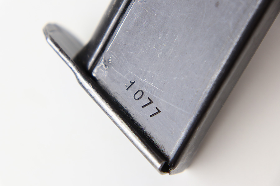 10/5/23 – This is a rare variation numbered P.38 magazine for a Swedish contract P.38 pistol. The magazine has excellent finish overall with only minor finish loss due to handling and rub wear. The left side of the magazine tube is numbered 1077, and there are no other markings or proofs. The spring is strong and fully functional.