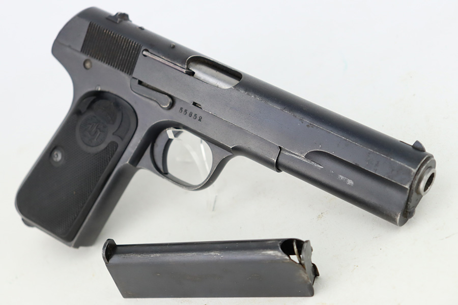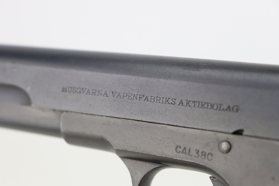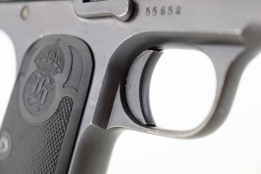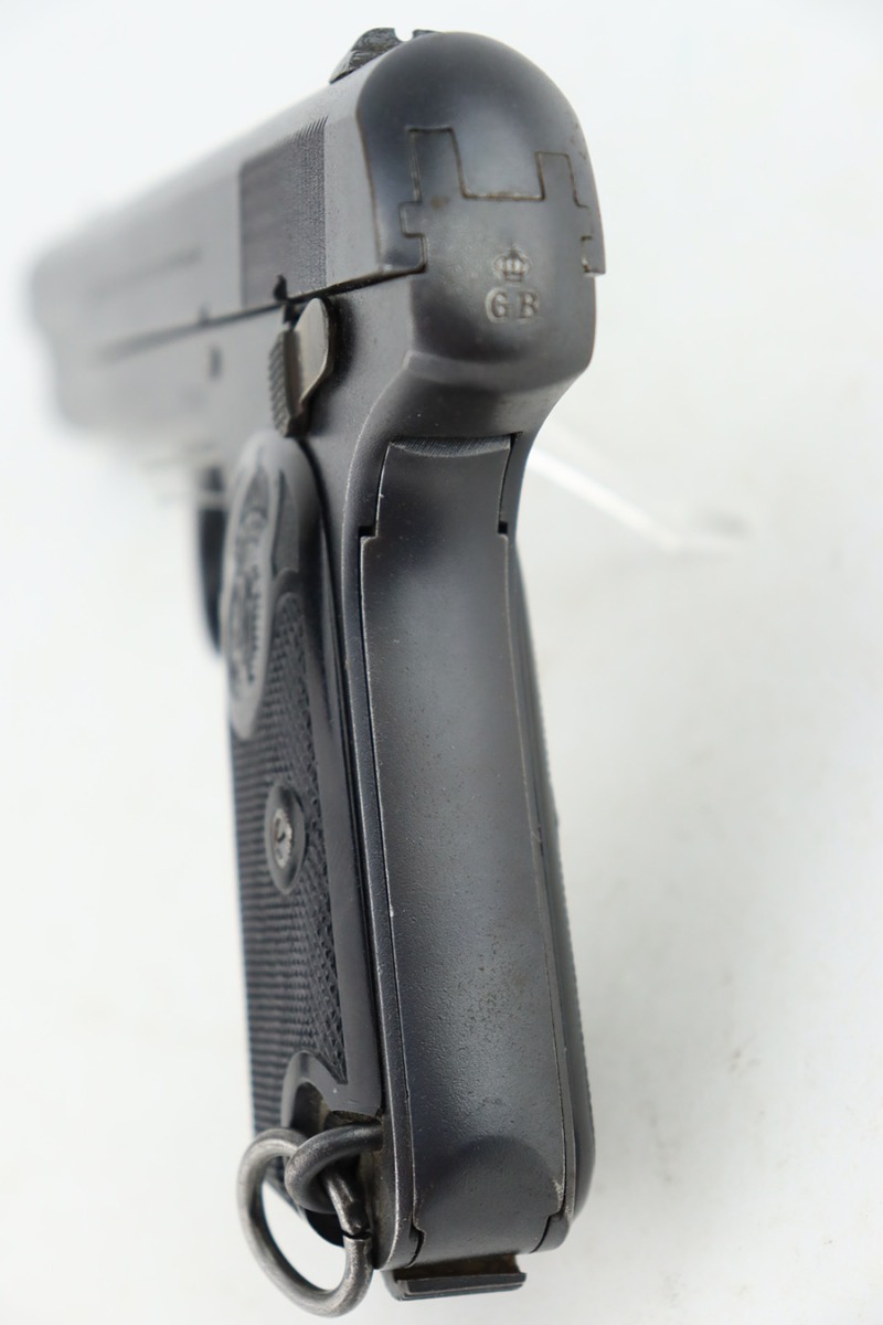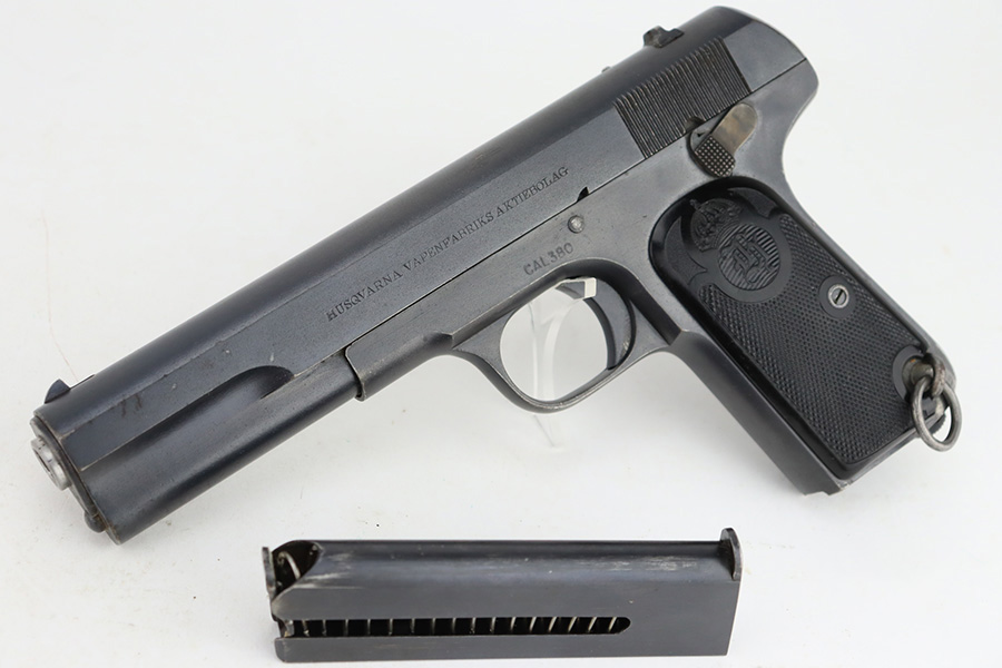 1/15/24 – This is a somewhat uncommon find, the Swedish Husqvarna Model 1907 pistol. The origin story on these handguns dates back to the early 1900s, as they were being produced by Fabrique Nationale under the designation of Model 1903. FN had been licensed to produced Browning’s .32 caliber pocket hammerless for the European market, while Colt had the U.S. rights, hence why this pistol looks like an oversized Colt M1903. Several countries reportedly wanted a larger service pistol on the same FN design that could accommodate the 9x20mm Browning Long cartridge, so FN lengthened the barrel to five inches, and added a slide stop on the right side of the frame. Sweden adopted the pistol as their military sidearm in 1907, and imported them from FN under the designation of Model 1907. FN then produced these pistols for Sweden until Germany captured their factory in 1914, and later Sweden procured licenses to produce them at the Husqvarna factory in 1917. This production continued until 1940, when the Lahti took over as preferred sidearm. Tucked away by the Swedish military, these pistols eventually hit the export market and many ended up in the states, such as the one listed here. They were then re-chambered to .380 ACP, and this one was likely imported before all firearms required import marks as none are present. This one is matching and has a Crown GB marking on the tang. It has retained nearly all of its finish with some very light freckling around the muzzle. Excellent black bakelite grips. Minty bore.