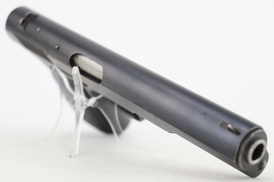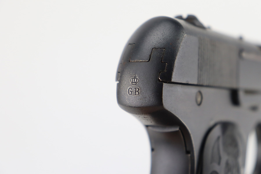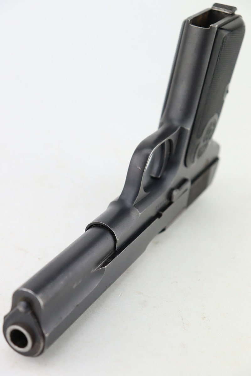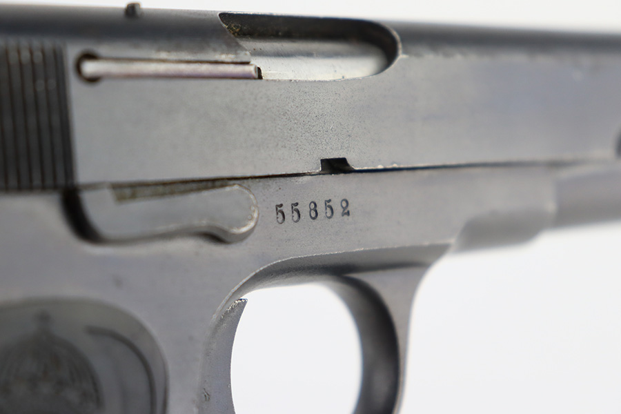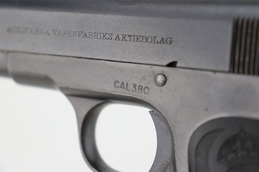 1/15/24 – This is a somewhat uncommon find, the Swedish Husqvarna Model 1907 pistol. The origin story on these handguns dates back to the early 1900s, as they were being produced by Fabrique Nationale under the designation of Model 1903. FN had been licensed to produced Browning’s .32 caliber pocket hammerless for the European market, while Colt had the U.S. rights, hence why this pistol looks like an oversized Colt M1903. Several countries reportedly wanted a larger service pistol on the same FN design that could accommodate the 9x20mm Browning Long cartridge, so FN lengthened the barrel to five inches, and added a slide stop on the right side of the frame. Sweden adopted the pistol as their military sidearm in 1907, and imported them from FN under the designation of Model 1907. FN then produced these pistols for Sweden until Germany captured their factory in 1914, and later Sweden procured licenses to produce them at the Husqvarna factory in 1917. This production continued until 1940, when the Lahti took over as preferred sidearm. Tucked away by the Swedish military, these pistols eventually hit the export market and many ended up in the states, such as the one listed here. They were then re-chambered to .380 ACP, and this one was likely imported before all firearms required import marks as none are present. This one is matching and has a Crown GB marking on the tang. It has retained nearly all of its finish with some very light freckling around the muzzle. Excellent black bakelite grips. Minty bore.